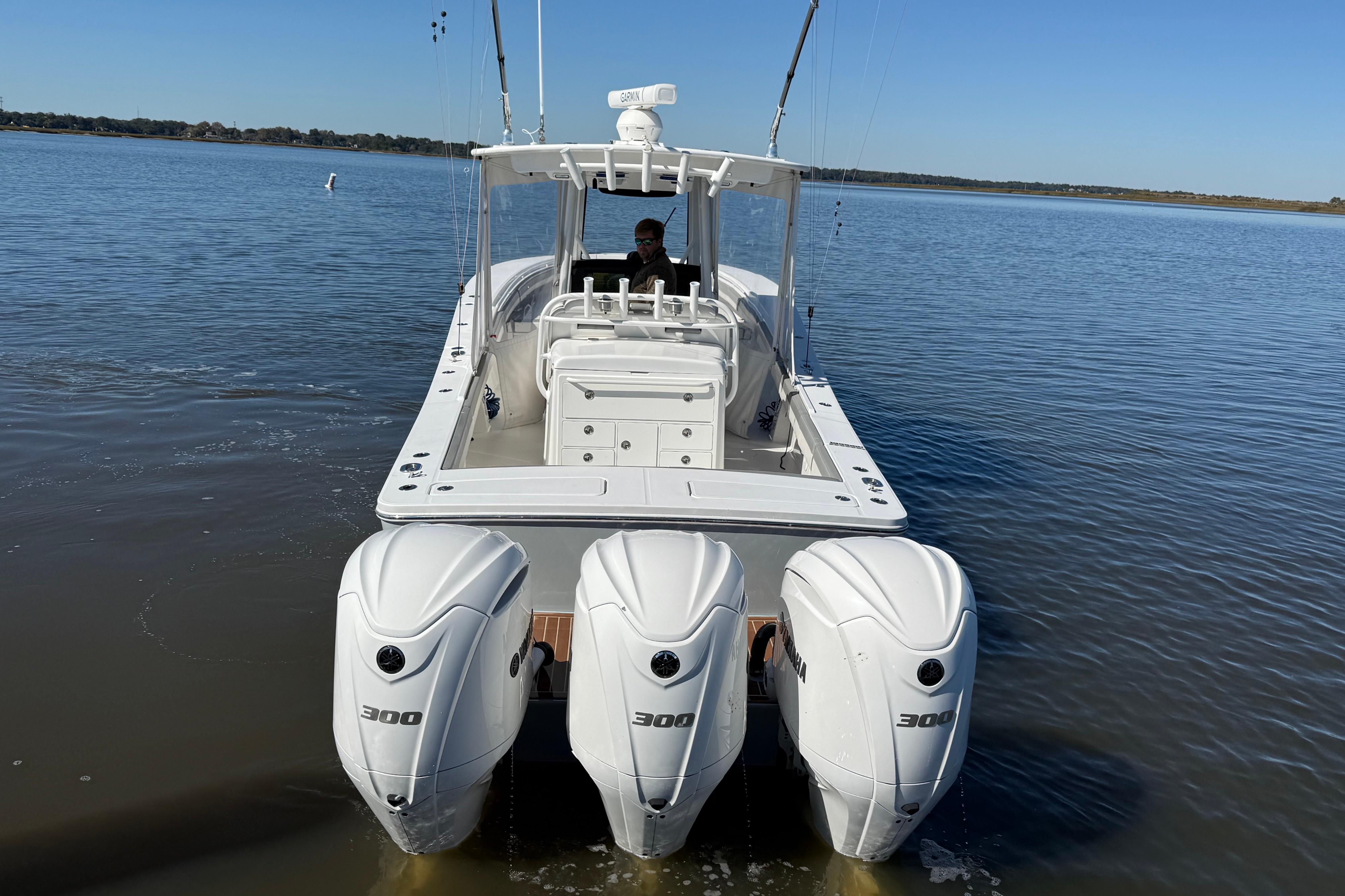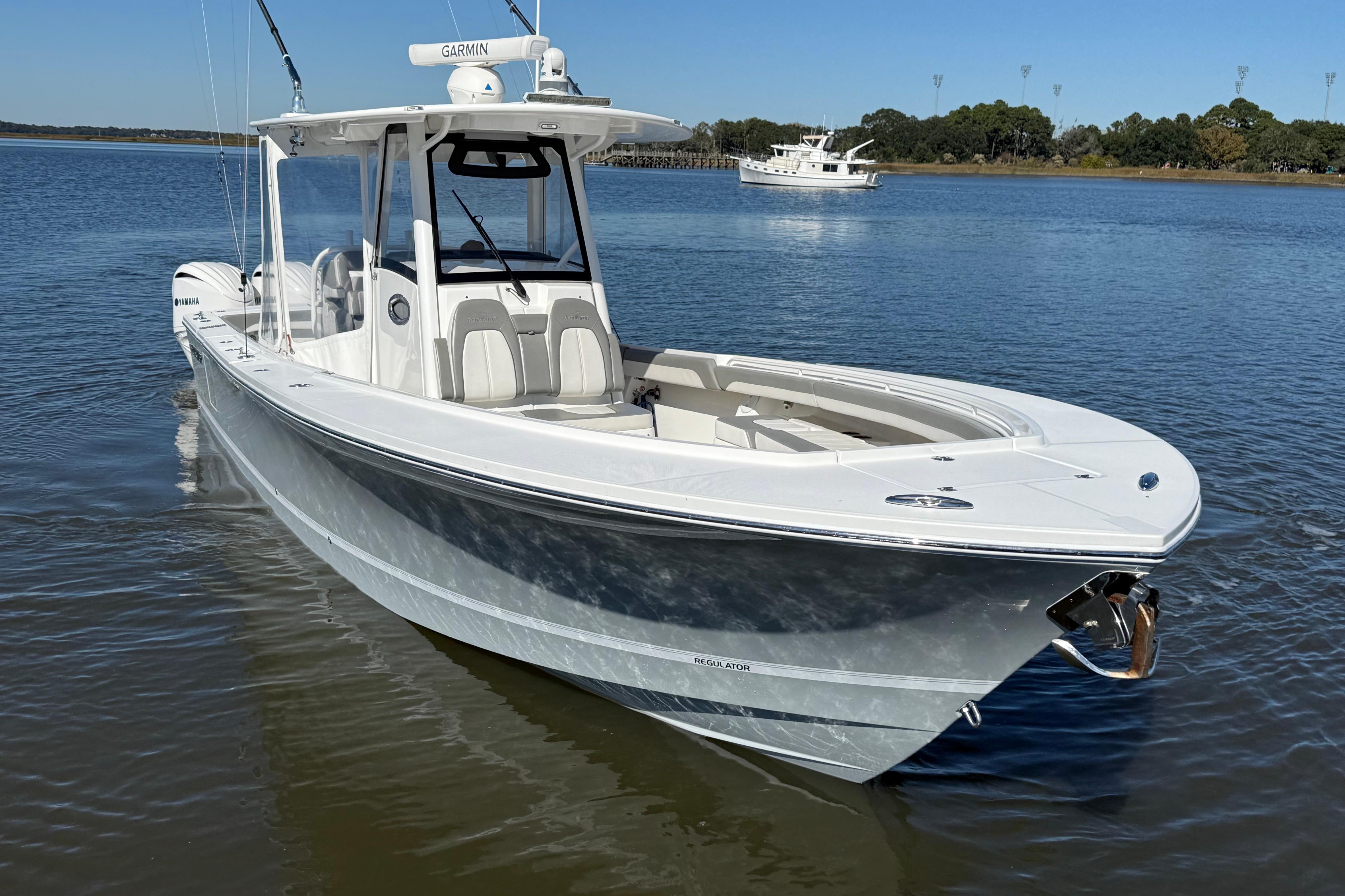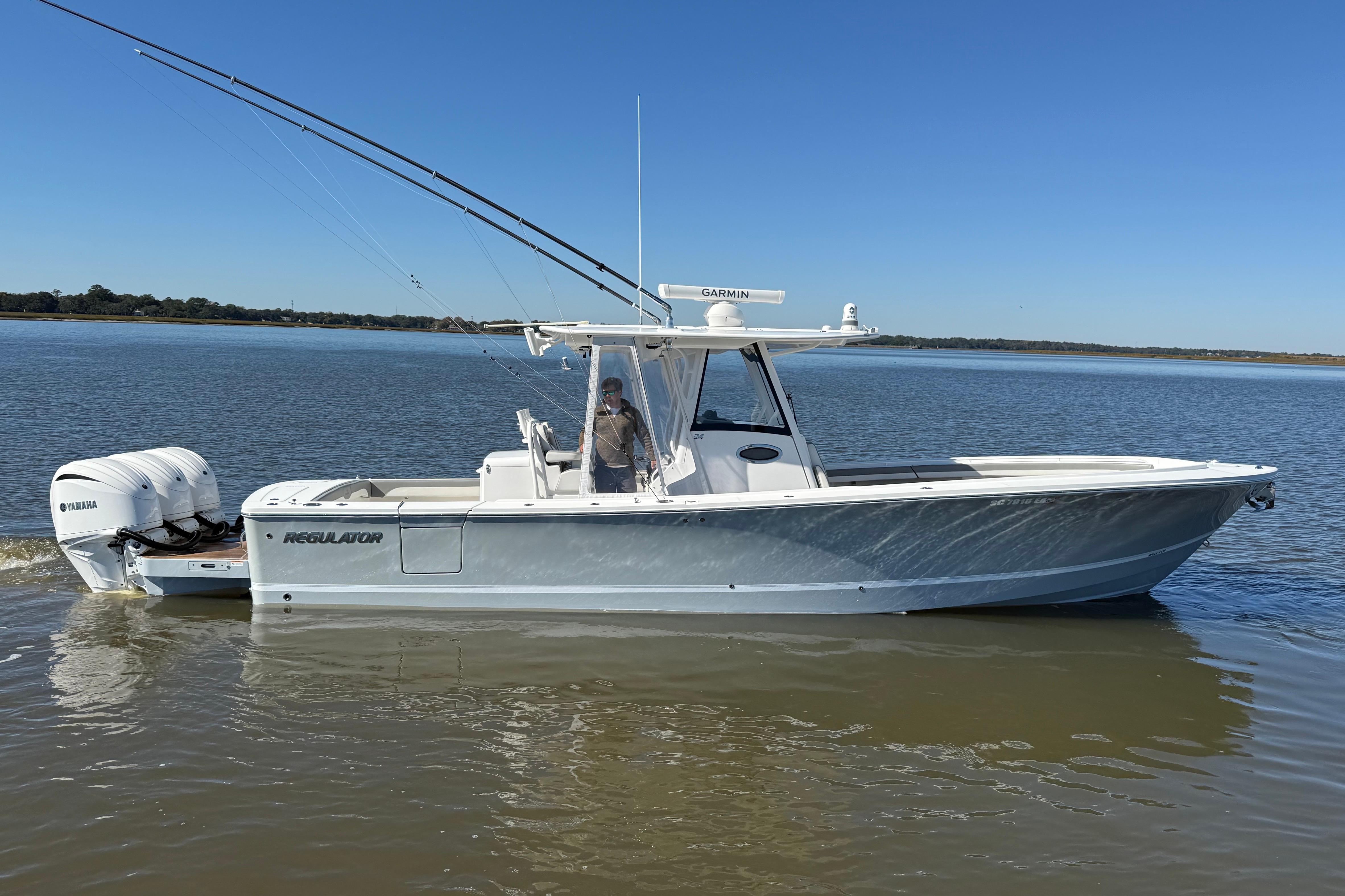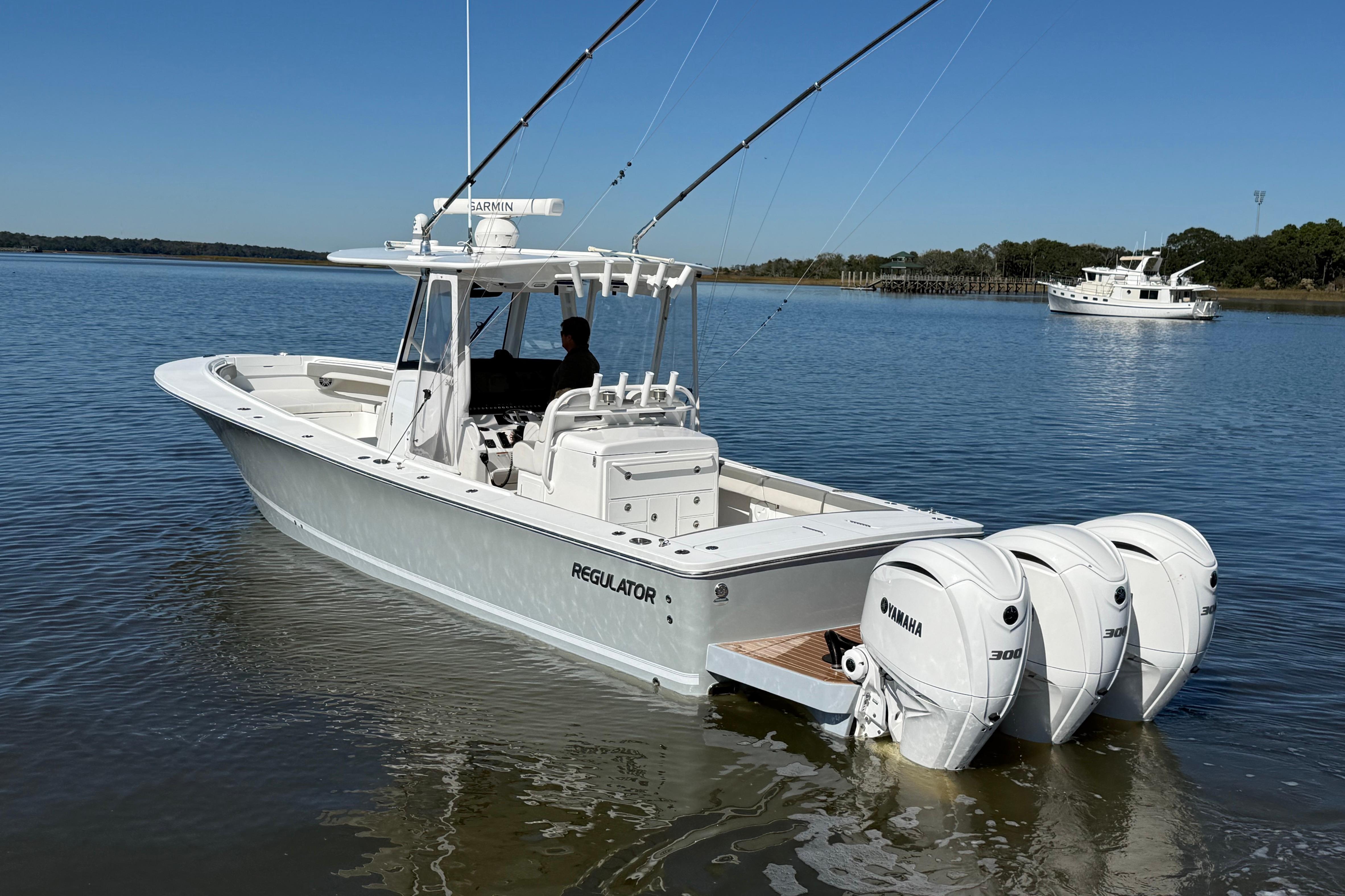 2022 Regulator 34 powered by triple Yamaha F300XSBs with Yamaha Helm Master Joystick Control with Multi Mode Set Point and Yamaha EX Autopilot.