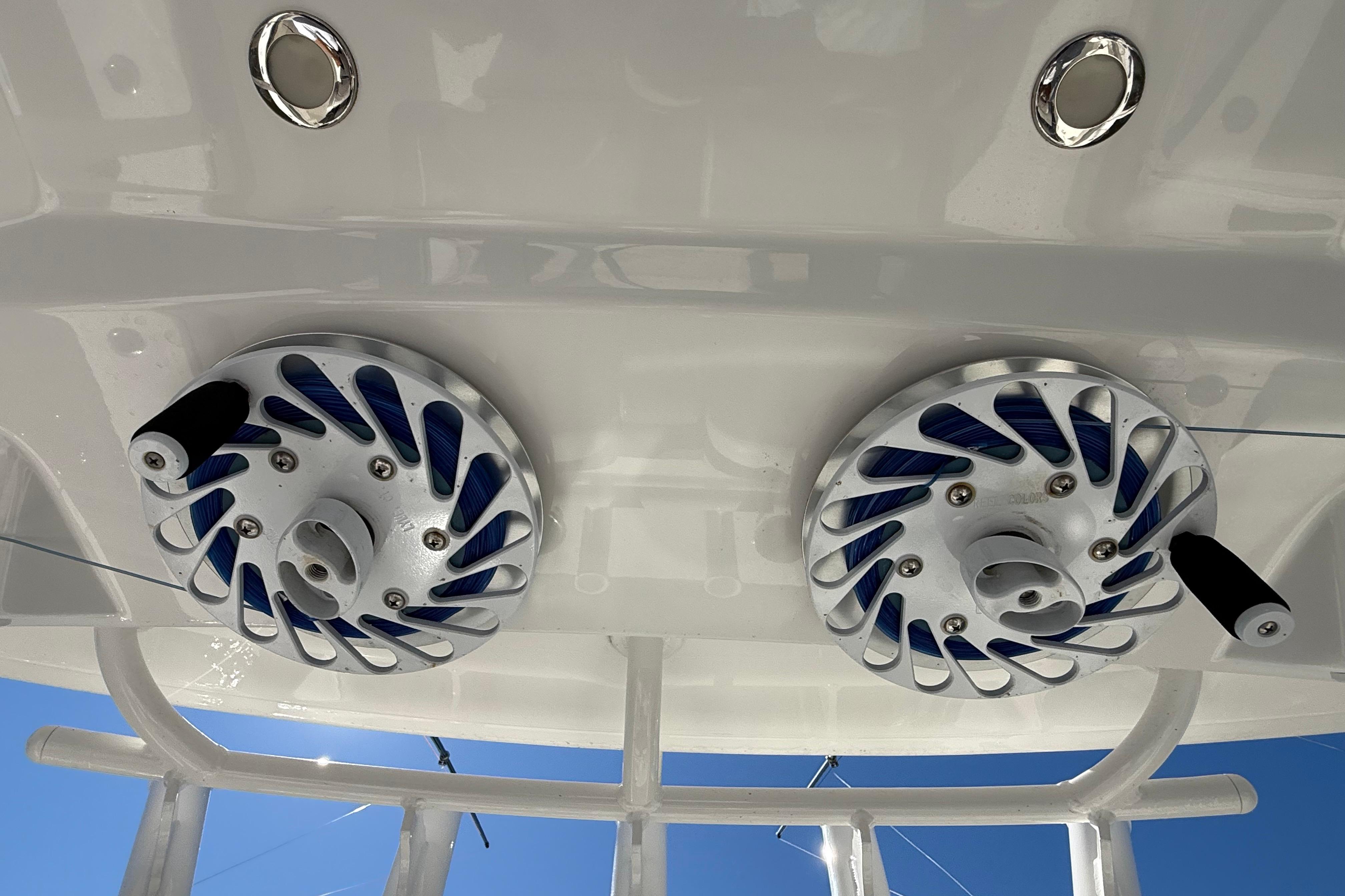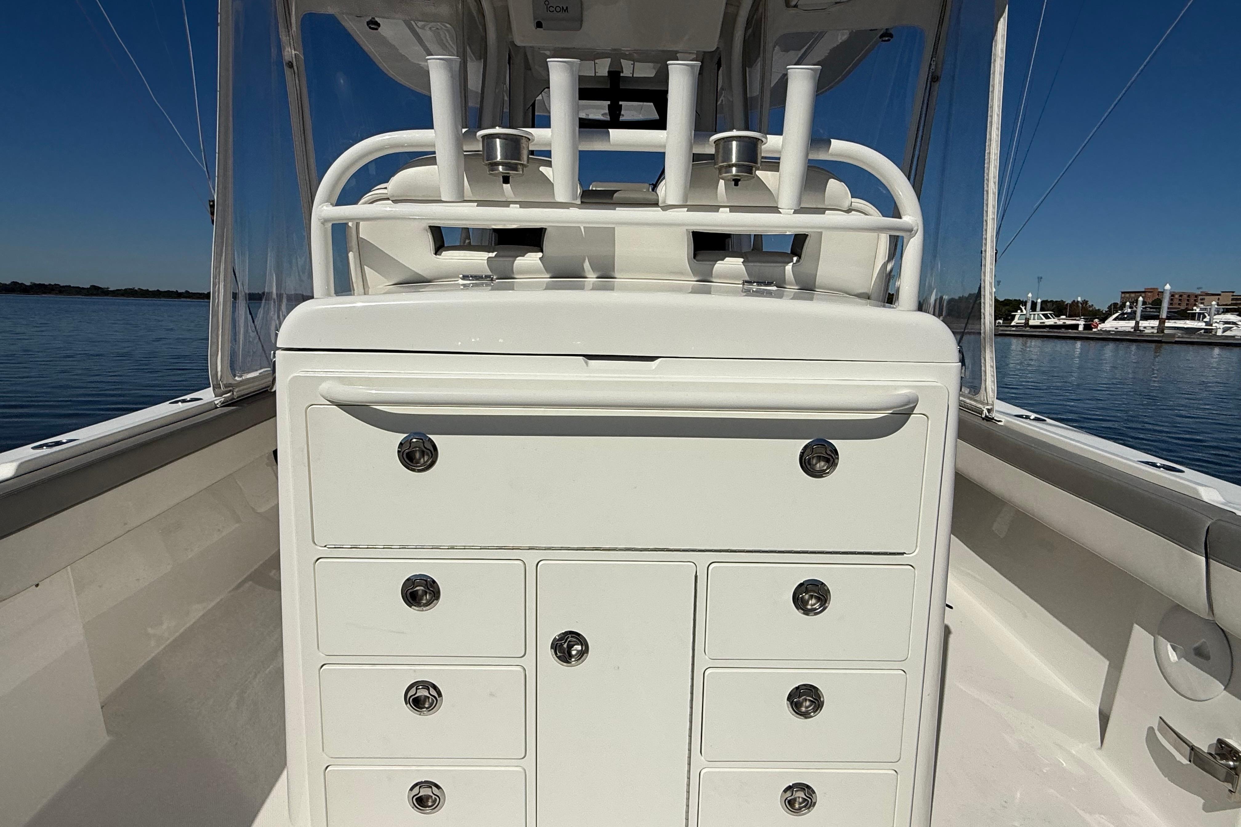 Standard Features and Factory Options include Storm Grey Full Hull Color, Hull Color Matched Bracket, Dove Grey Upholstery, 12V Air Conditioner, Thru Stem Anchor Windlass, Synthetic Teak Marine Decking, 3X Deluxe Tackle Center Leaning Post, Spray Curtain Enclosure, T-Top Rocket Launcher, Taco Grand Slam 390 Outrigger Bases, 20' Carbon Fiber Outrigger Poles, Insulated/Macerated Aft In Deck Fishbox, Cockpit Triple Engine Flush, Bucket Holder with 2 Yeti Buckets, Phender Pros, and 3 Piece Deep Grey Custom Cover Set.