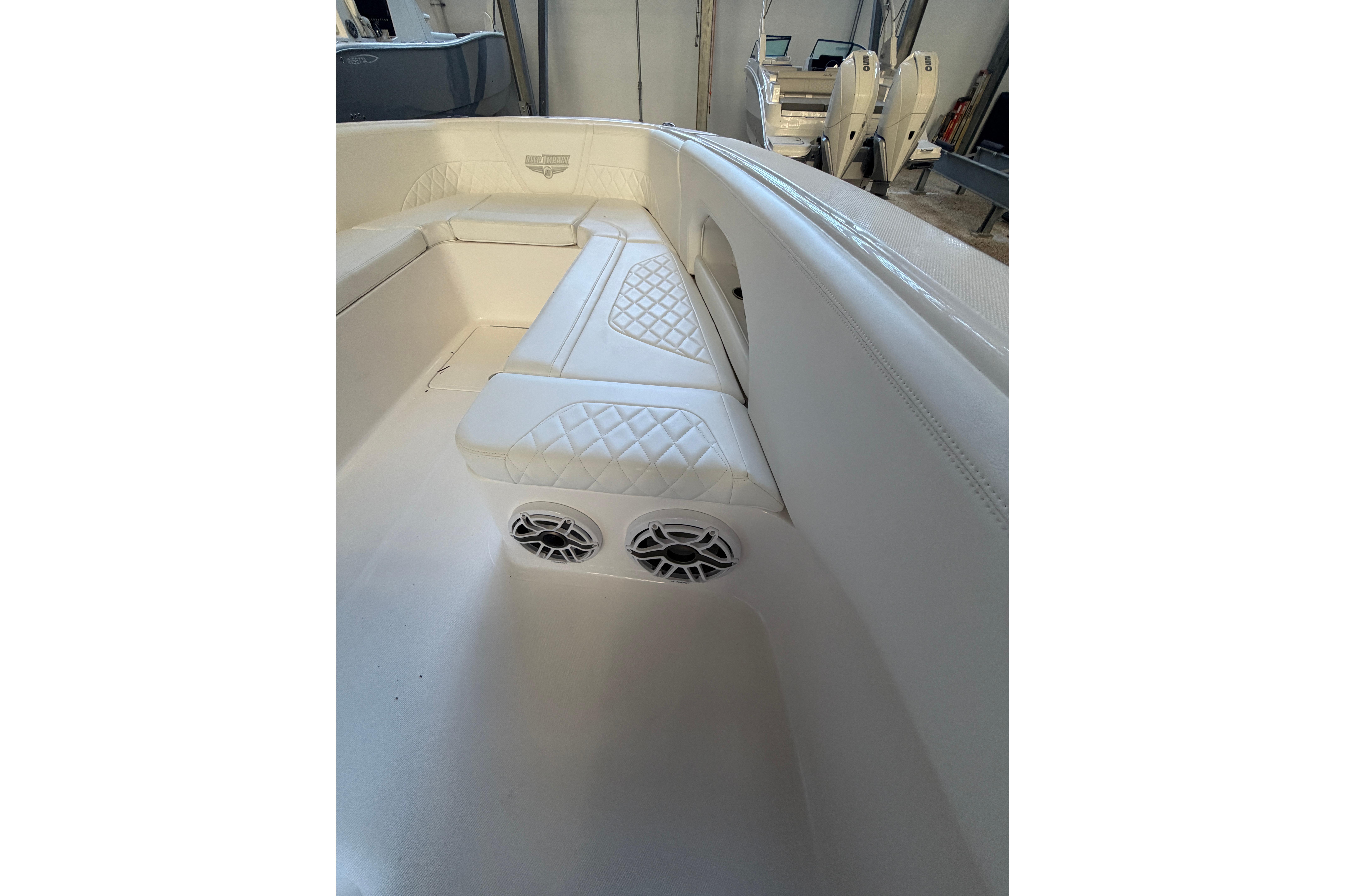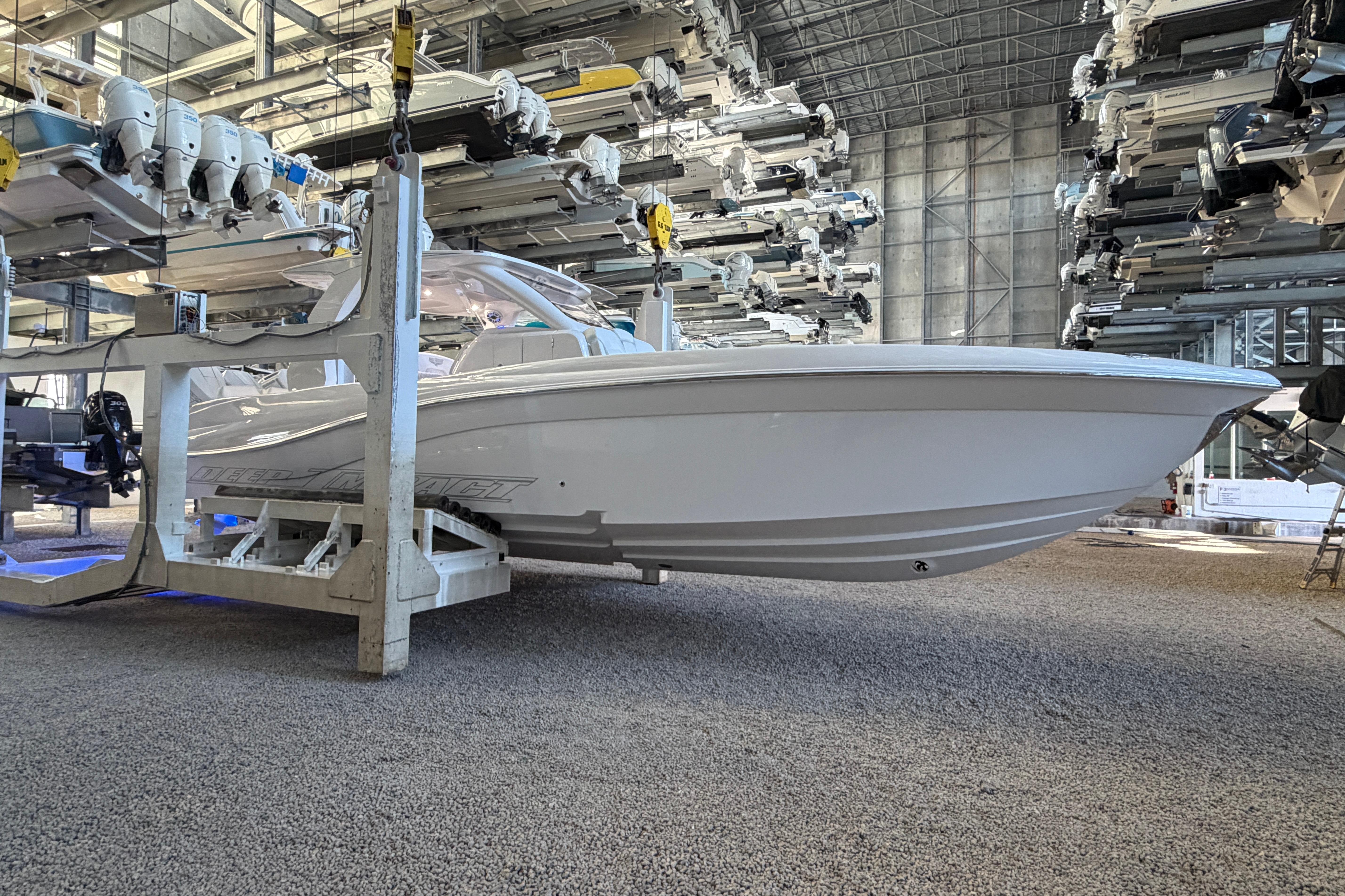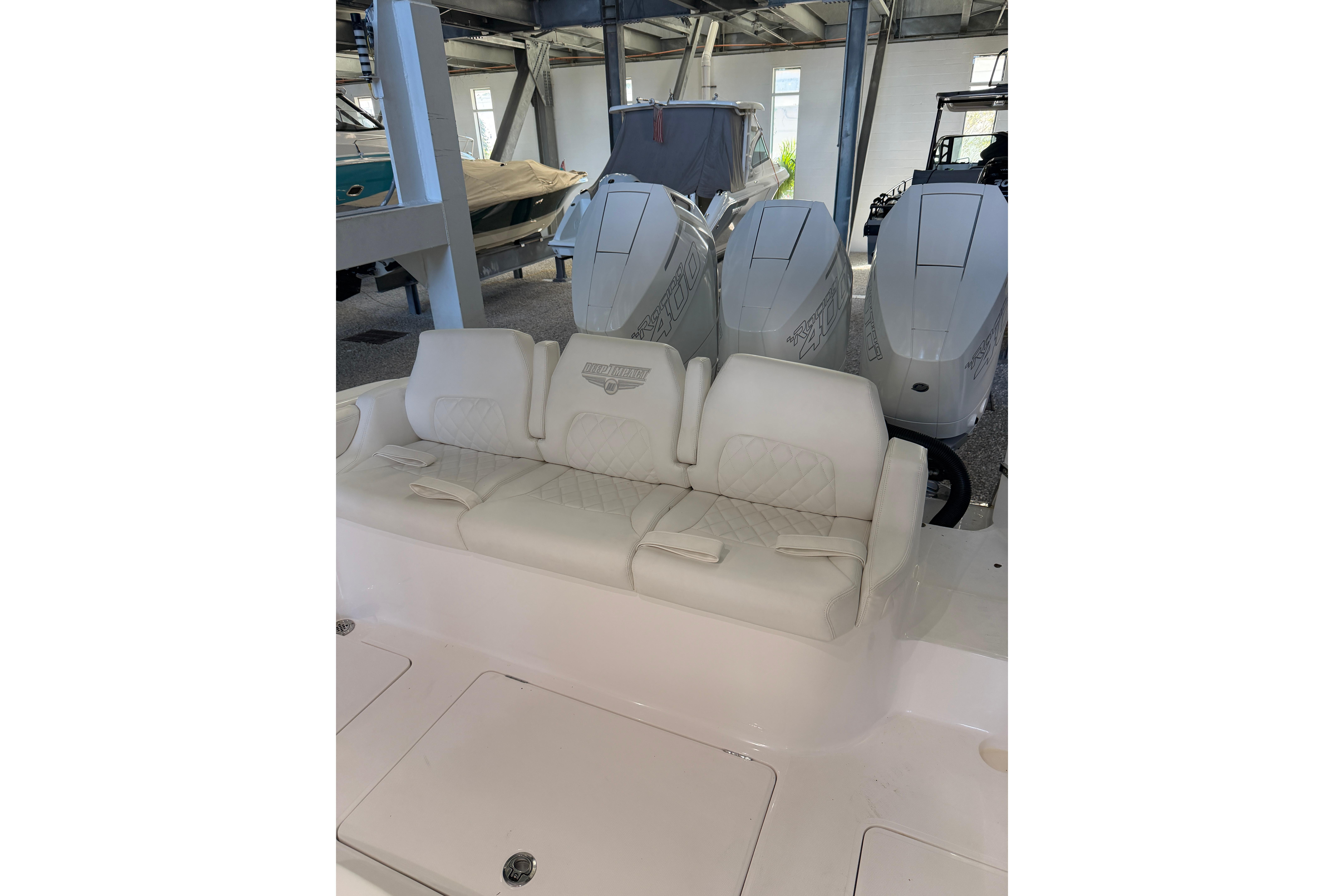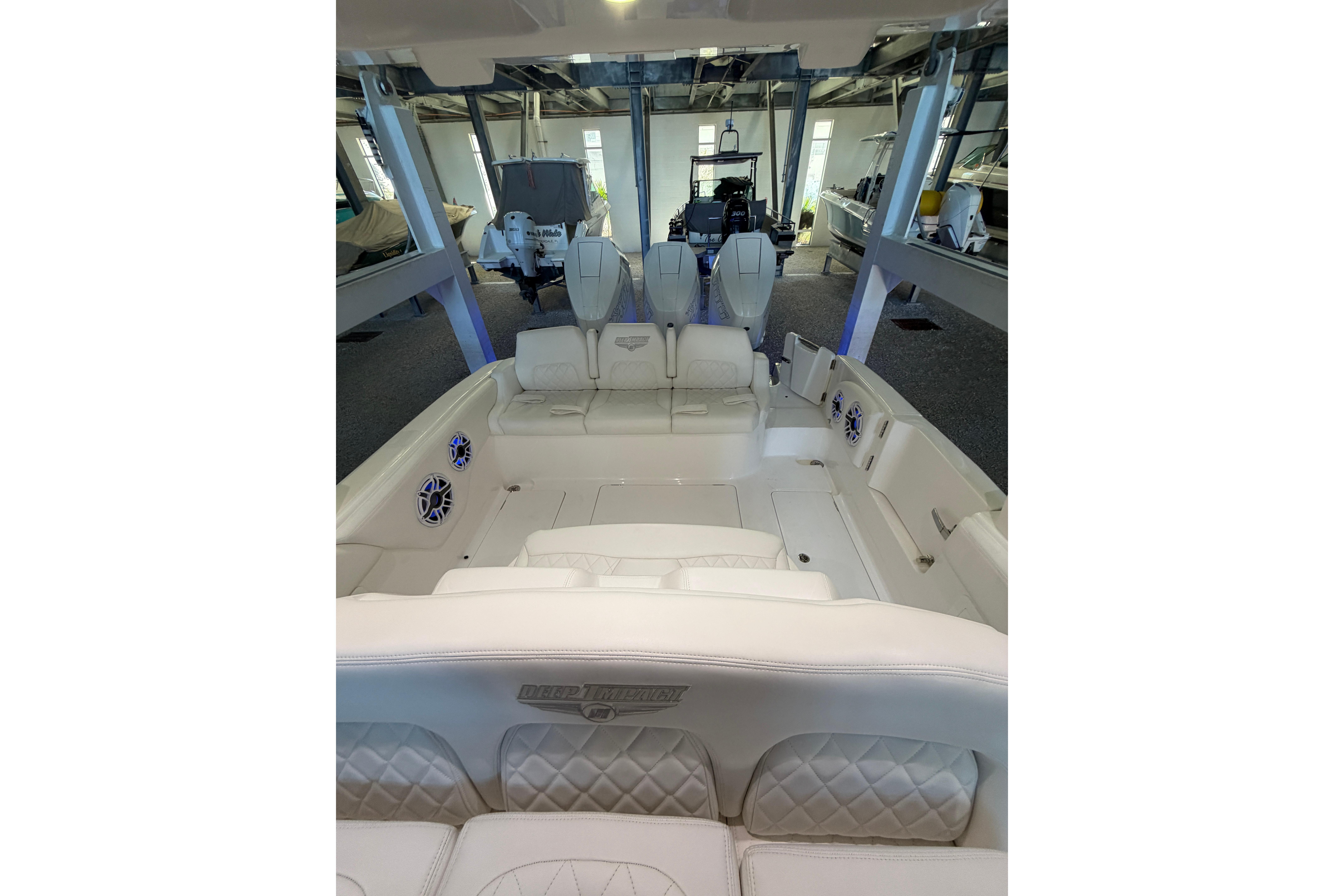 2025 Deep Impact 369 Sport Powered by Triple Mercury Racing 400R V10s with only 40 hours, Warranty through December 2027 with option to extend, Dual 16" Garmin Displays, Huge JL Audio Stereo System, Dive Door w/ Stainless Swim Ladder, Transom Pull Out Ladder, Custom Stitching Pattern in Seating Insert, Garmin VHF 315 Marine Radio, Bow Thruster, Recessed Anchor Locker w/ Freshwater Washdown, 1KW Transducer w/ Garmin GSD 25 Sounder Module, Bow Storage Compartment, Bow Seating, Fwd Deluxe Lounge Seat, Rear Facing Mezzanine Seating behind Helm w/ Cooler, Stainless Bow Rails, Full Cabin with Head, Day Bed and Sink, Fwd and Aft Spreader Lights, Multi Colored Under Gunwale and Hard Top Lighting, Port and Stbd Insulated Fish Boxes, Under Gunwale Storage, Windows in Console, Transom Seating w/ Cooler, (8) Stainless Cleats, Stainless Bow and Stern Eyes, Trim Tabs, Full Cover and much More!