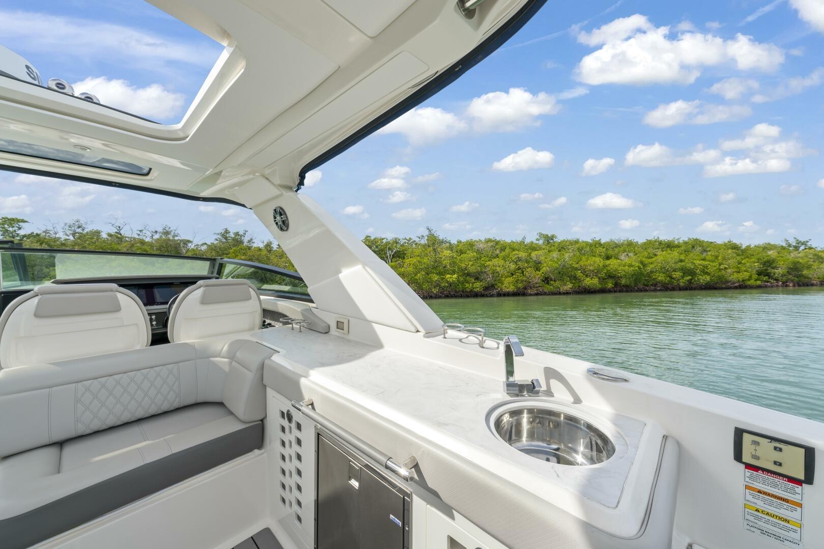 This Sea Ray 2022 SLX 400 Outboard "SEA N SEA" is an outboard variant with massive capacity, deluxe amenities, breakthrough design and incredible versatility for the total freedom to design your own adventure. From the ingenious fold-down swim terrace to the robust cabin, to the amenity-rich cockpit, the SLX 400 Outboard is the consummate entertainer and a superior all-around performer - and the epitome of Orchestrated