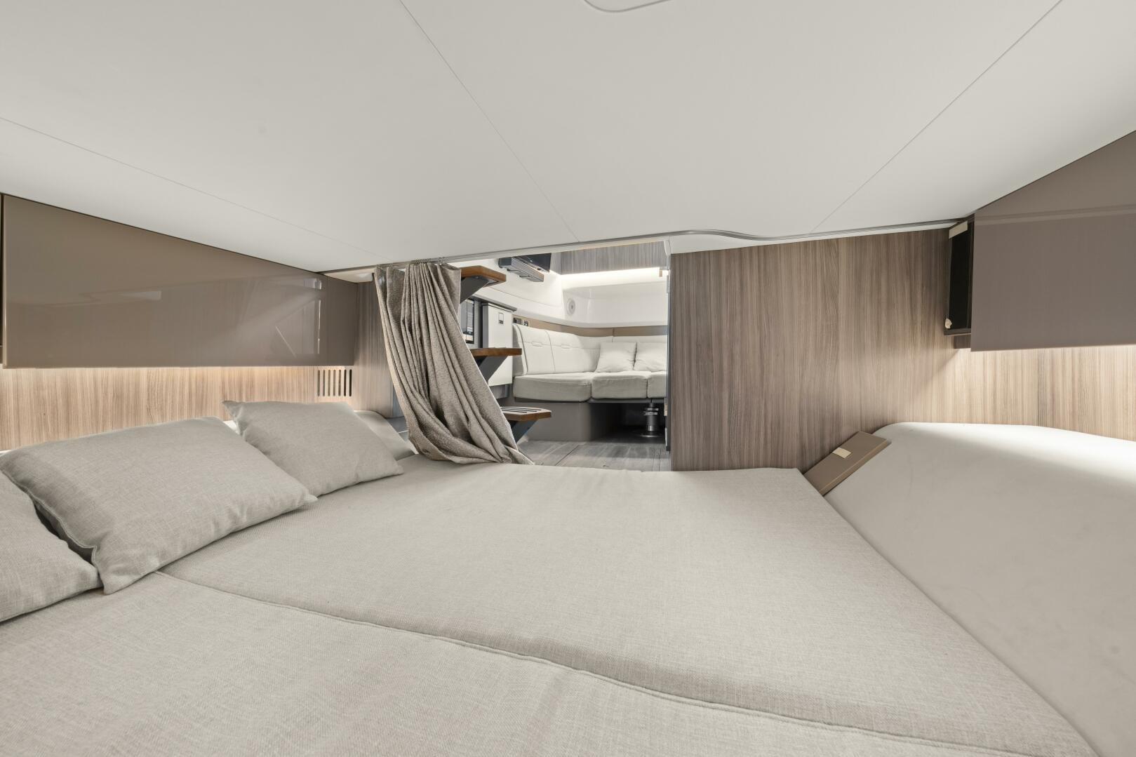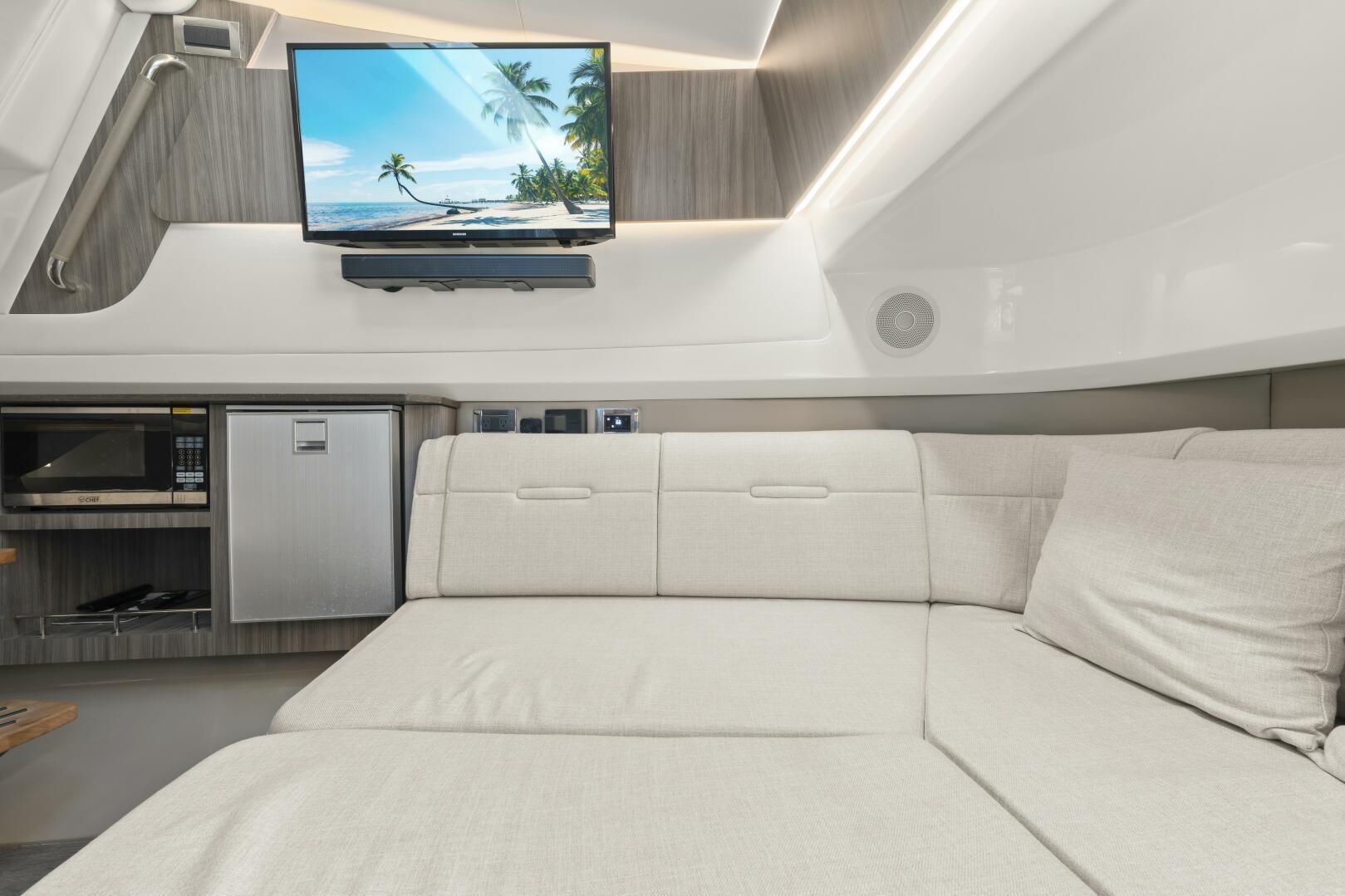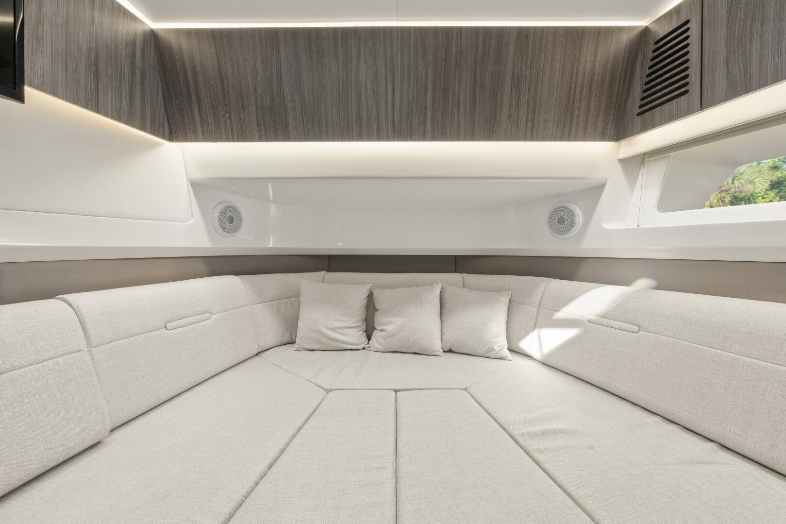 Excellence. An expansive cockpit social zone has a well-appointed wet bar with refrigerator, sink and available dual grills while the innovative fold-down swim terrace opens to extend the cockpit all the way to the water. Innovations, found throughout, include Joystick Piloting and Dual Digital Dash with standard 16” Simrad Touchscreen displays. Bring your friends... all of them. The SLX 400 Outboard has a generous cabin and expansive bow and cockpit seating. All of this and amenities for entertainment means hours and days of fun aboard this award-winning boat.