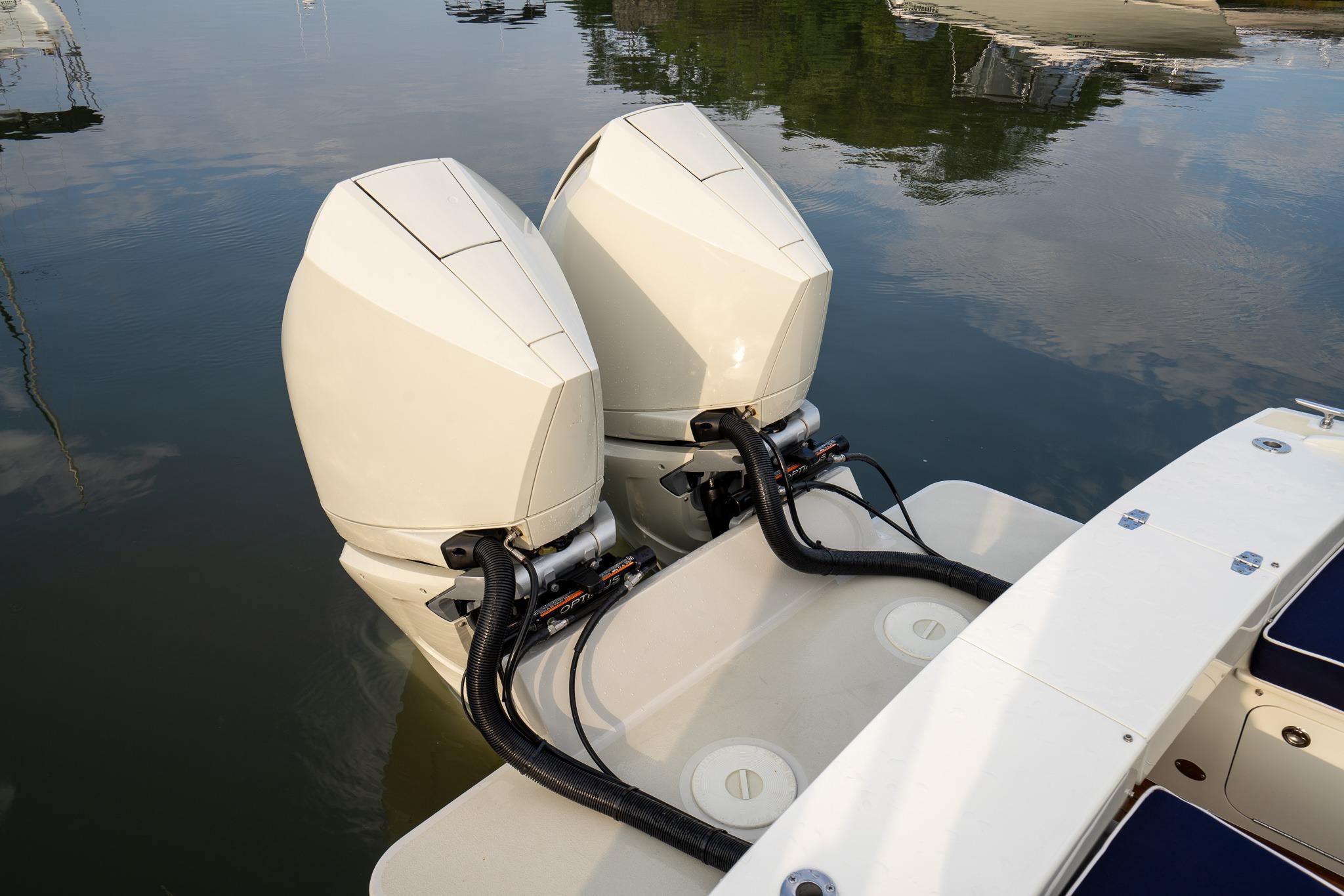 This Custom 32 delivers thrilling performance with twin 250 hp Mercury Verados, superb handling, and a level of fit and finish rarely seen in boats of this size. Notable features include air conditioning, an enclosed head, a comfortable V-berth area, and meticulously executed mahogany and teak joinery throughout.