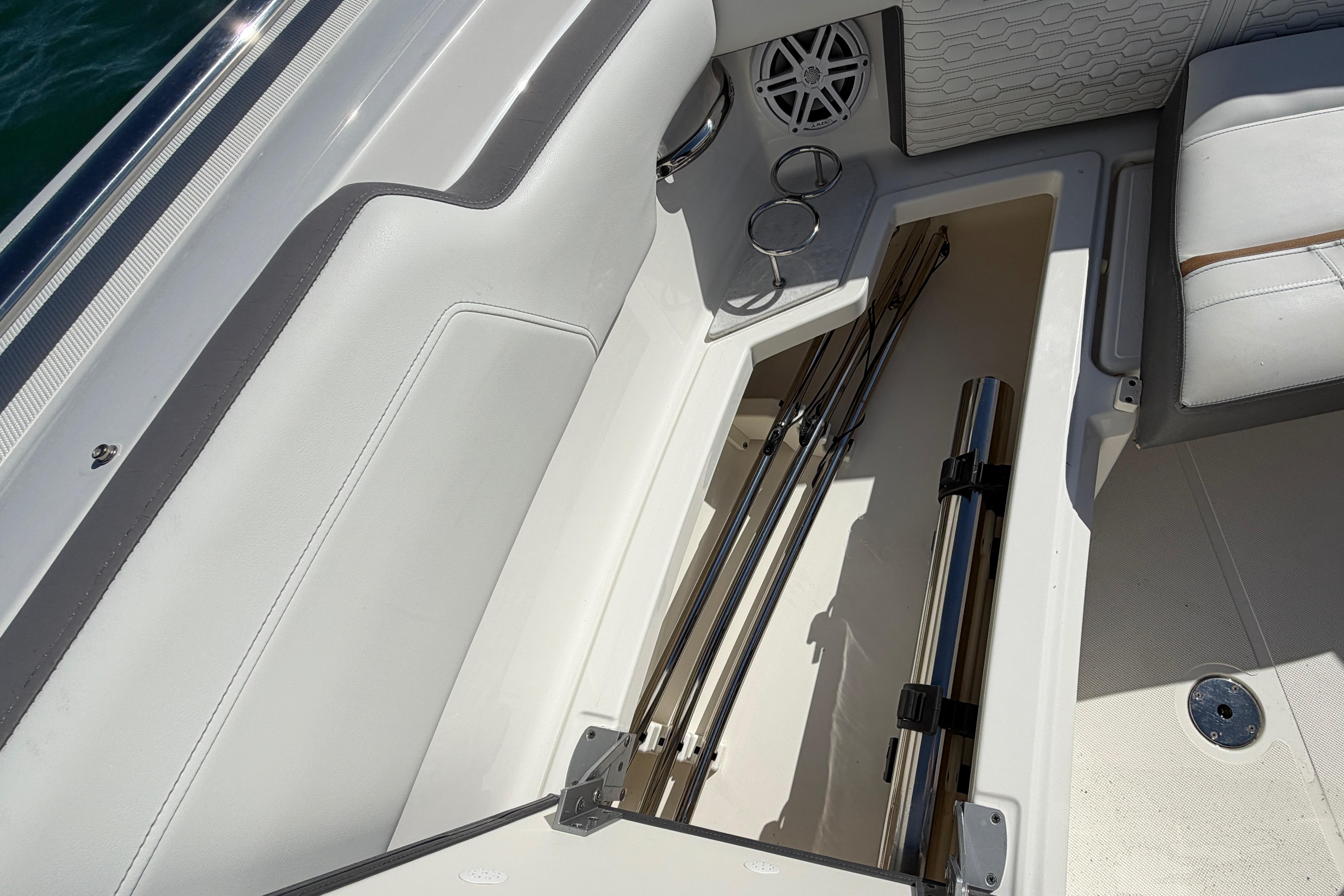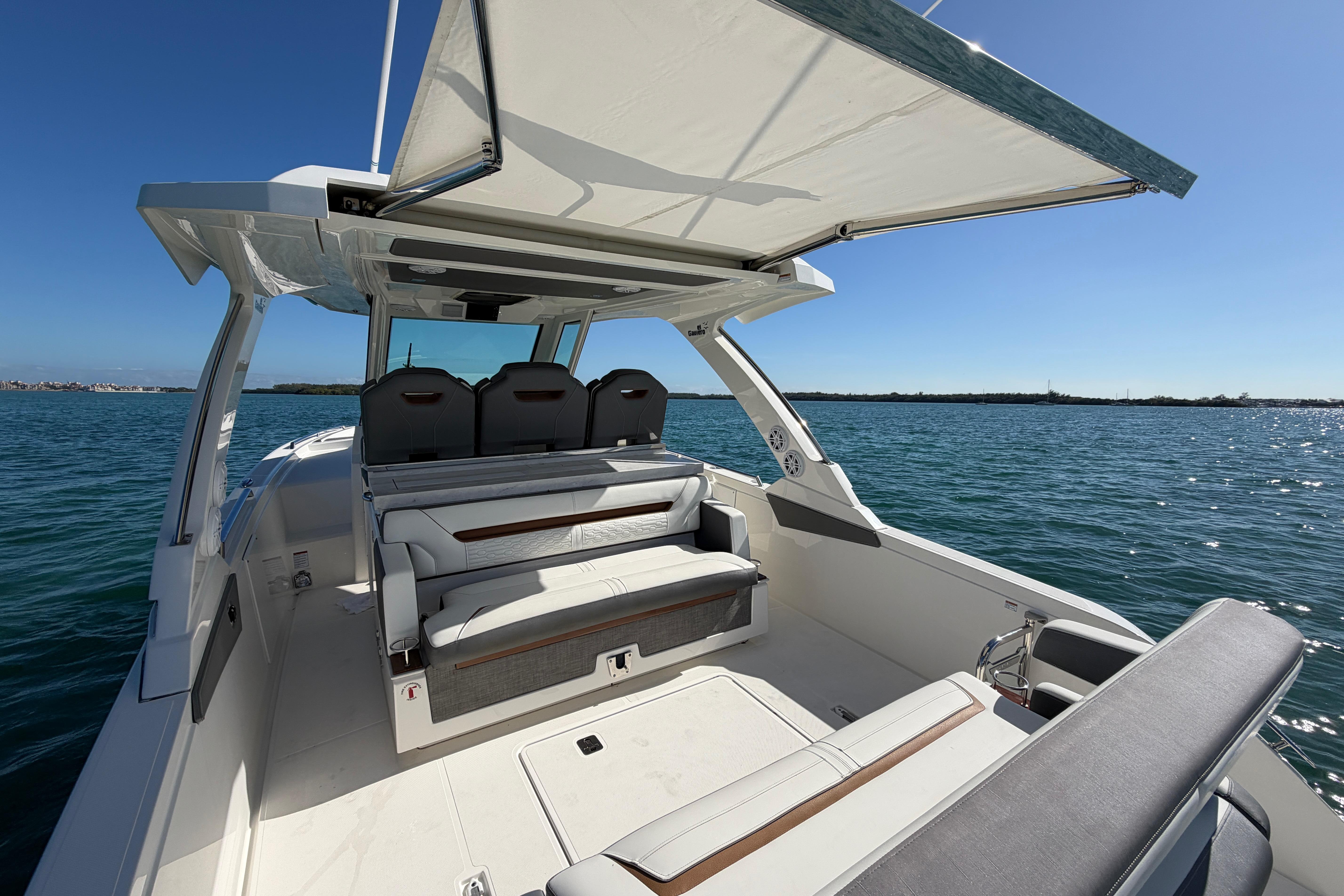Complete with walk-around capabilities, outdoor galley and convertible sun pad, the 34 ls continues to define luxury day yachting. Captain and guests will enjoy multiple lounging spaces and social zones, offering relaxation and fun while on the water. Interior, guests will find a quiet refuge complete with sleeping accommodations and head. Athletic, sleek styling combined with thrilling performance ensures one exciting day on the water after another. Paired with Mercury® propulsion, the 34 ls is ready to perform. Outfitted with glass cockpit integrated electronics and the latest Garmin® marine navigation systems, captains will enjoy the ease of use and navigation aboard.