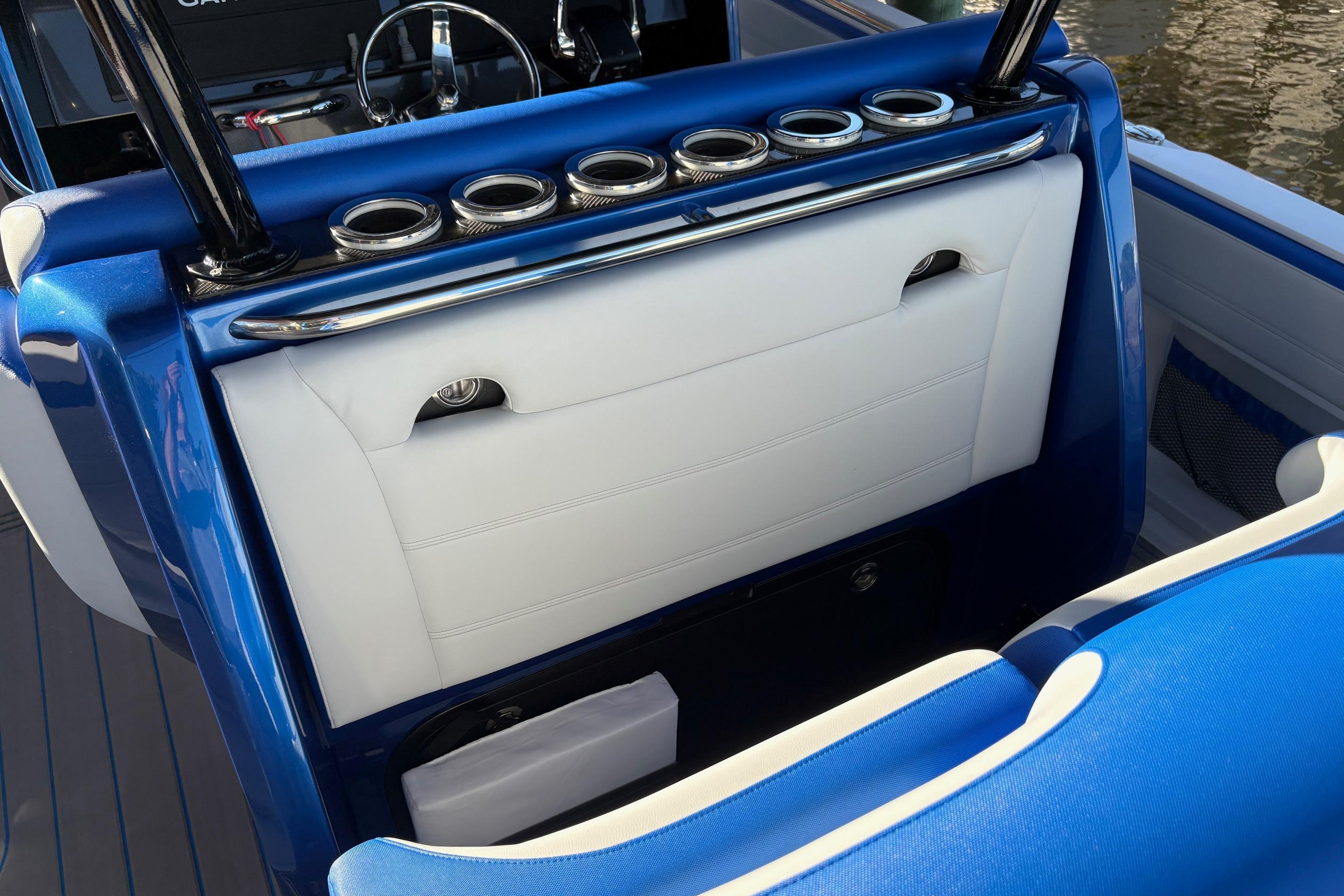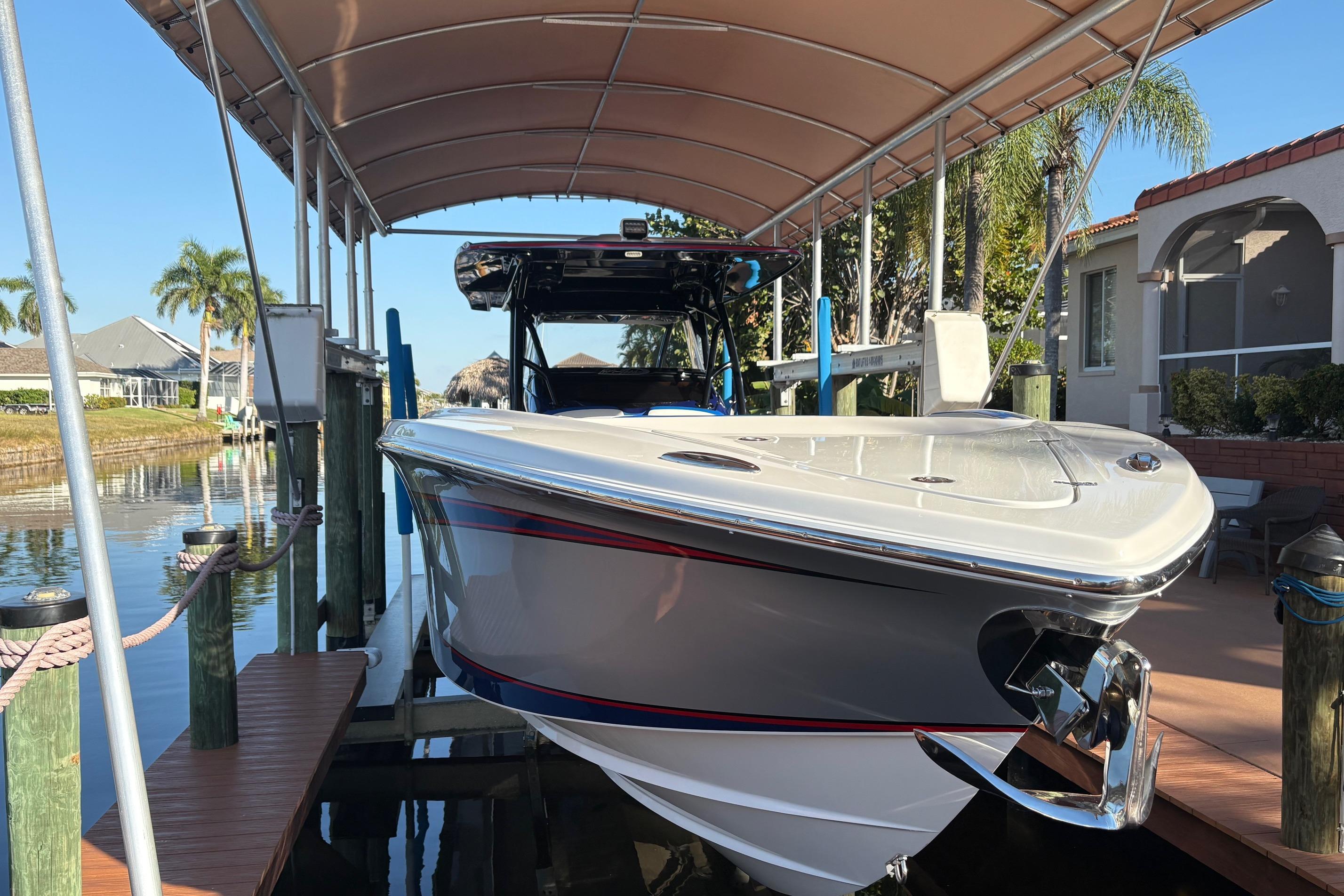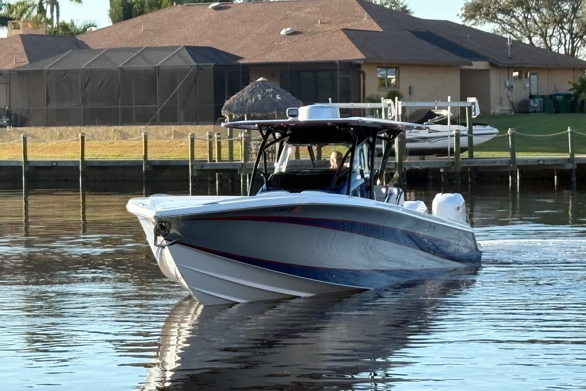 2023 390 Sport powered by reliable Mercury Racing 400R's. Set up for both cruising and fishing. 9222, 22" Garmins, 24" Radar, Sonar, Auto Pilot, JL Audio System, VHF, XM-Sirius, Remote controlled Spot Light, Lumishore Underwater lights, Single point fresh water engine flush, Both Bow and Stern Thrusters, 12V Cabin AC, Additional Second Fuel Tank, Fishing Package with Full Sized Live-Well and fold out rear Bench Seat, Plenty of Rod and Holders and Combination Rod Holder/ Cup Holders. For Cruising, there's a Second Row Rear Seat and the Optional, Forward Facing Bow Seat Backrests. Custom Graphics. Priced to Sell! Please Note: The Livewell can be permanently removed and replaced with a built in rear bench seat. Trailer not included but available.