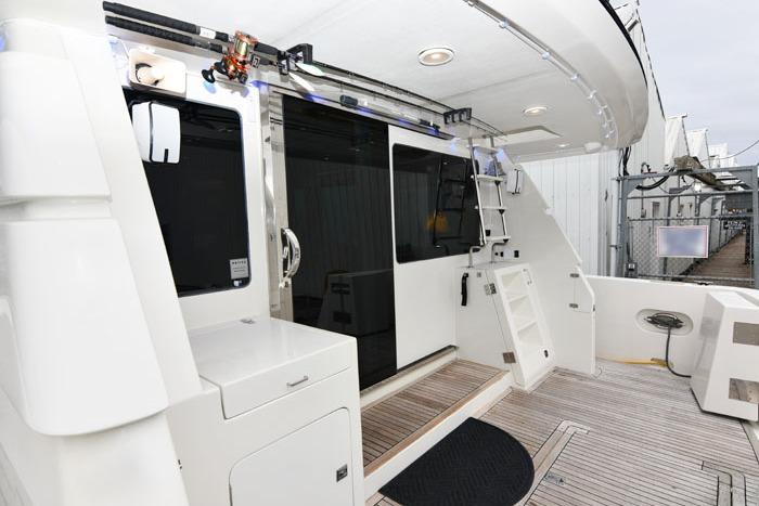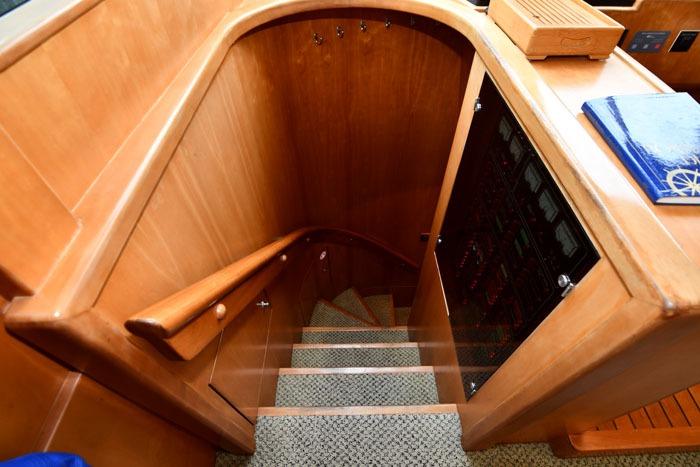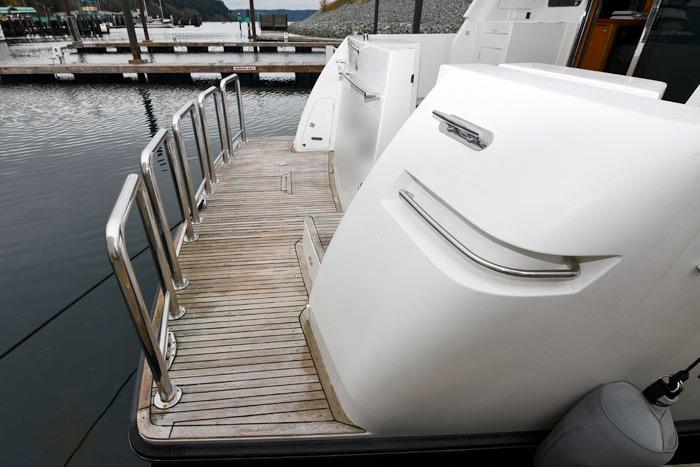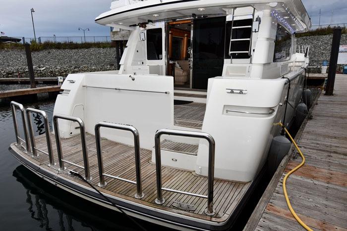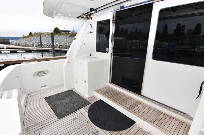 Back in the wheelhouse, aft down via port side companionway lands in the MAIN CABIN, with the UP GALLEY set forward to starboard, and open to the bright SALON for easy conversation and entertaining. NOTE cozy electric salon fireplace; popup flatscreen TV in dedicated cabinetry. Aft doors open to the ample COCKPIT with transom door to the oversized integral SWIM PLATFORM plus forward access to the upper BOATDECK and both walk-around SIDE DECKS - with weather protection and lighting.
