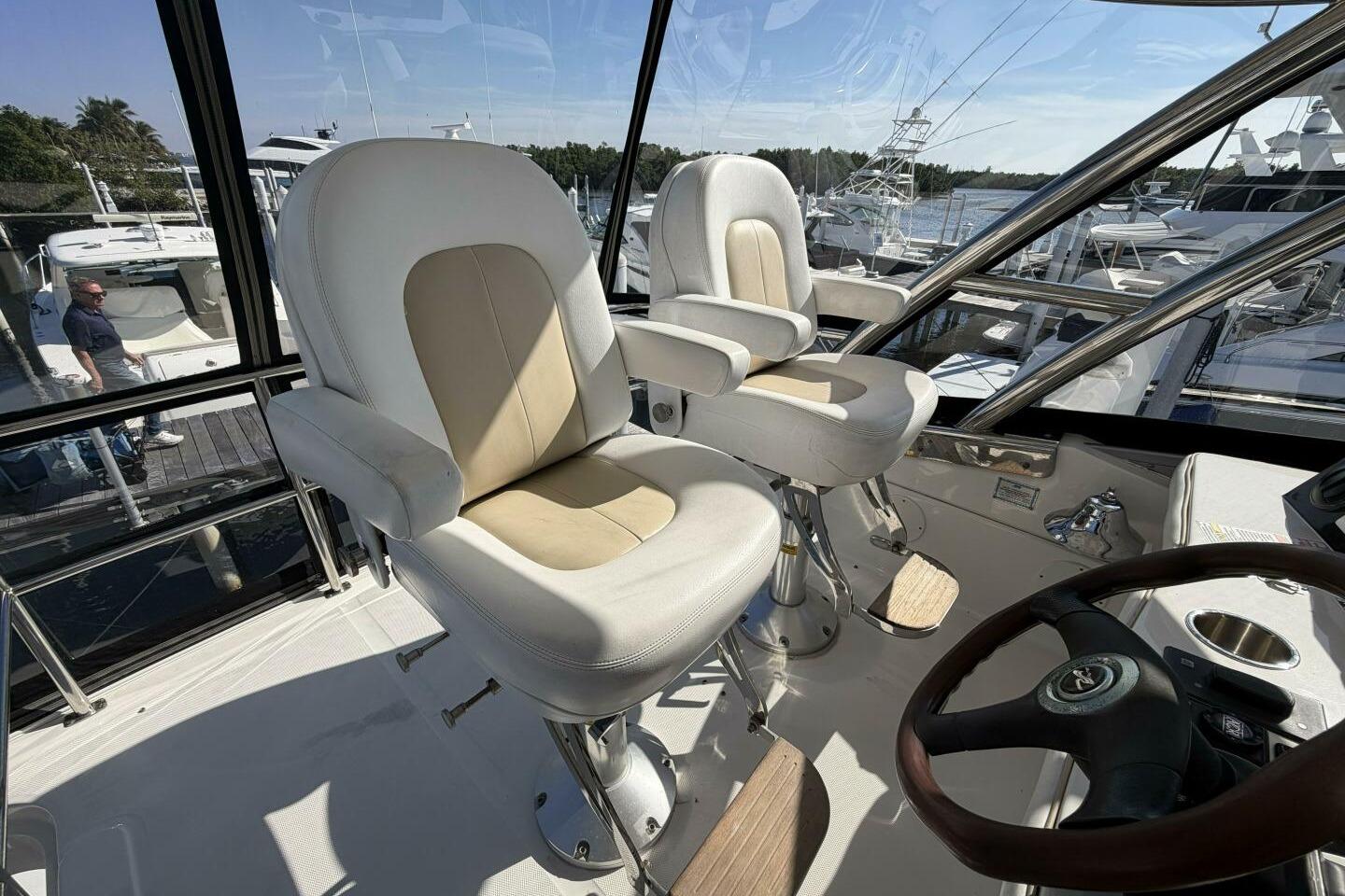 Up on the flybridge, wide molded steps lead to a spacious layout with the helm aft and lounge seating forward. The bridge features AC/heat, updated Garmin 8612 multifunction displays, Raymarine radar, bow and stern thrusters, and a Strataglass enclosure. A fiberglass hardtop and a hydraulic swim platform were also outfitted.