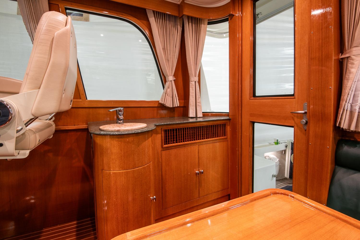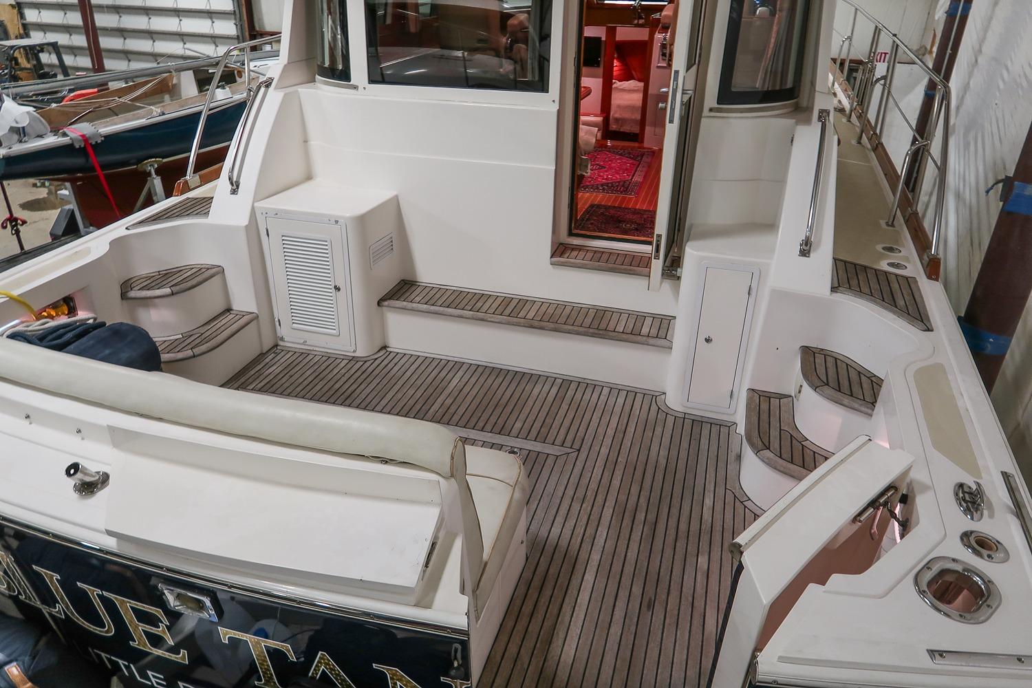 - The cockpit aft of the pilothouse provides outdoor seating and access to the pilothouse, swim platform and side decks