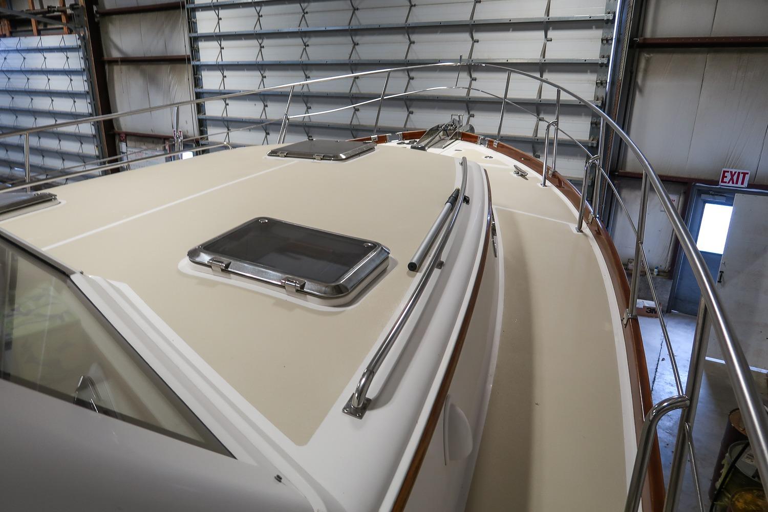 - Stainless steel handrails on trunk cabin and underside of pilothouse roof provide security going forward