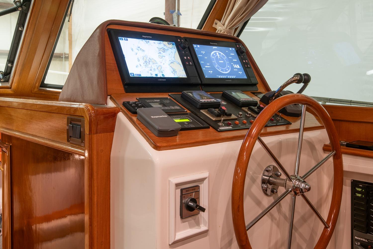 - Helm area with instrument and systems displays and vertical teak rimmed wheel