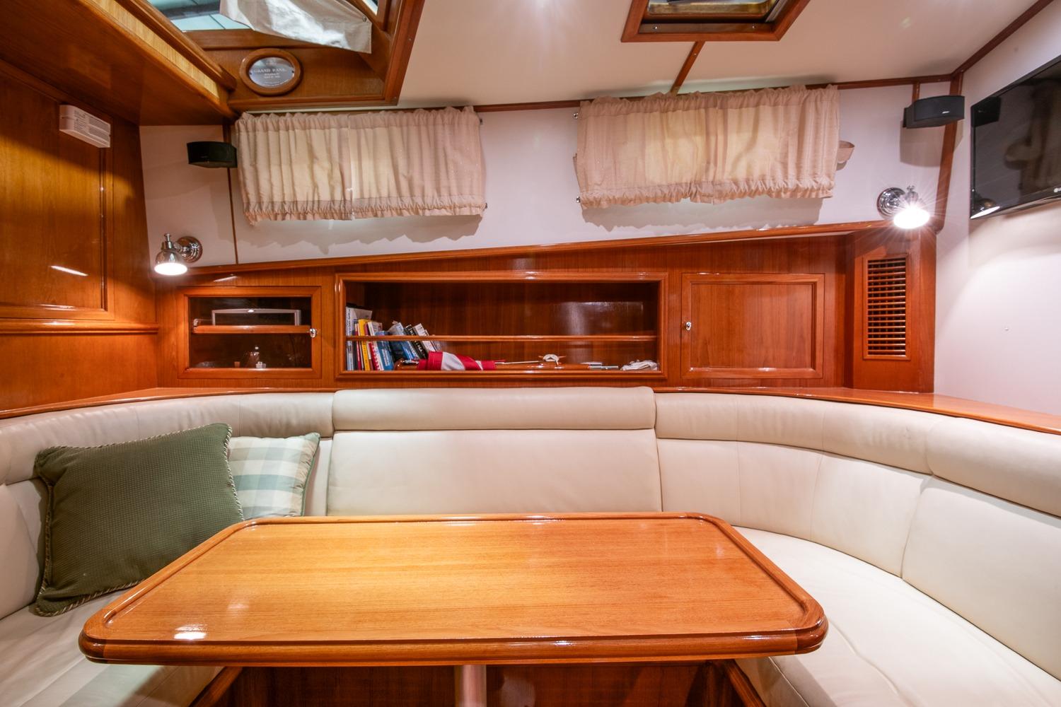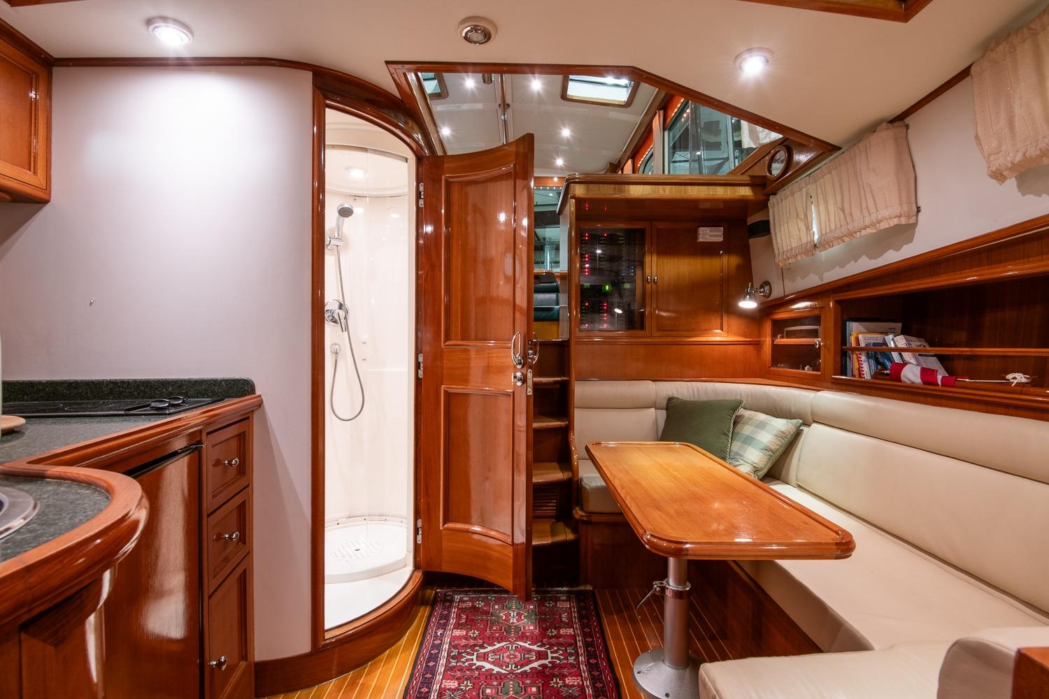 - U-shaped dinette opposite galley with teak dining table that drops to convert to berth