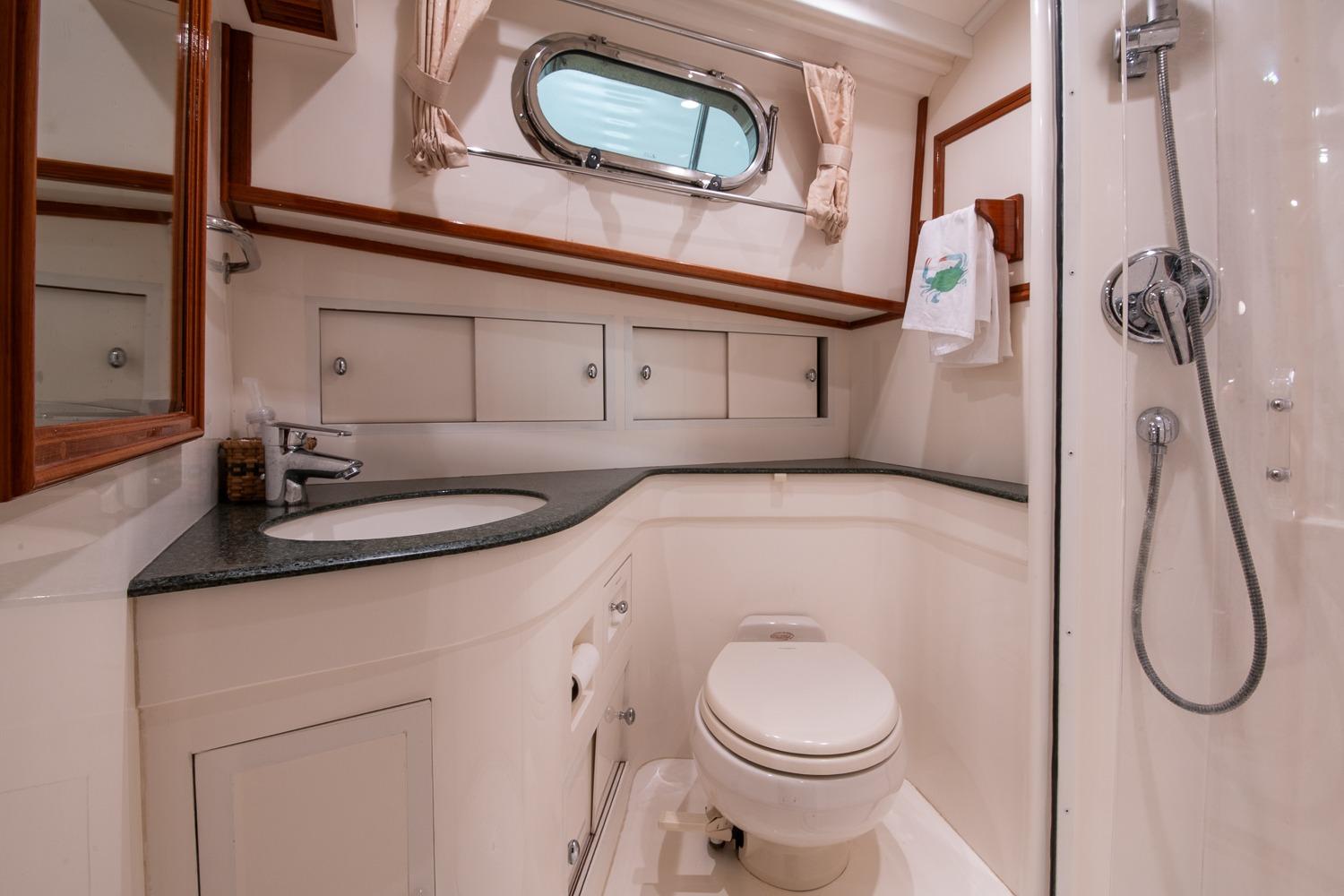 A companionway between the helm and passenger seats leads down a couple steps to a comfortable dinette on the port and a large head with separate shower stall to starboard with the galley forward of the head. Forward of the main salon is the forward cabin with a centerline queen berth.