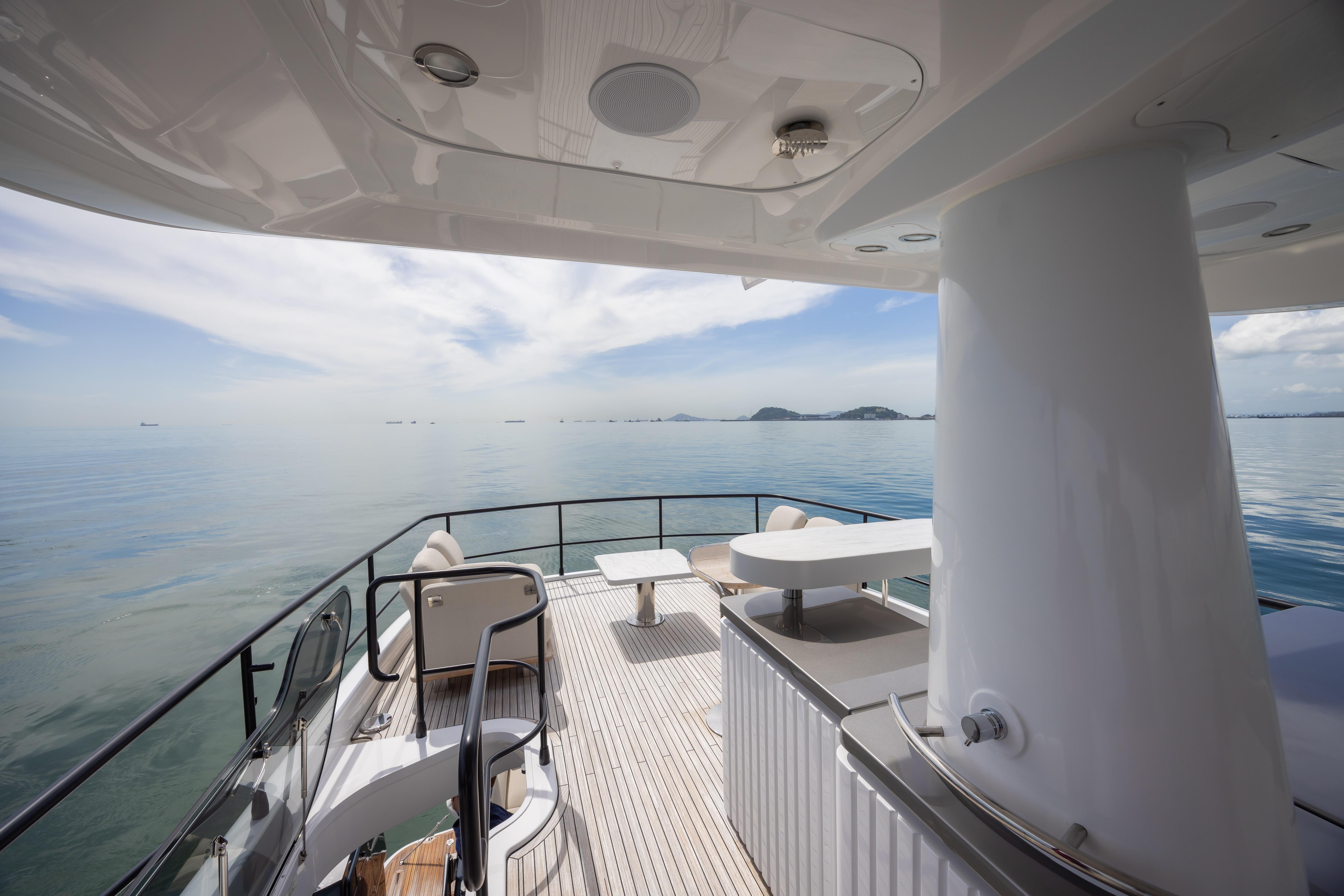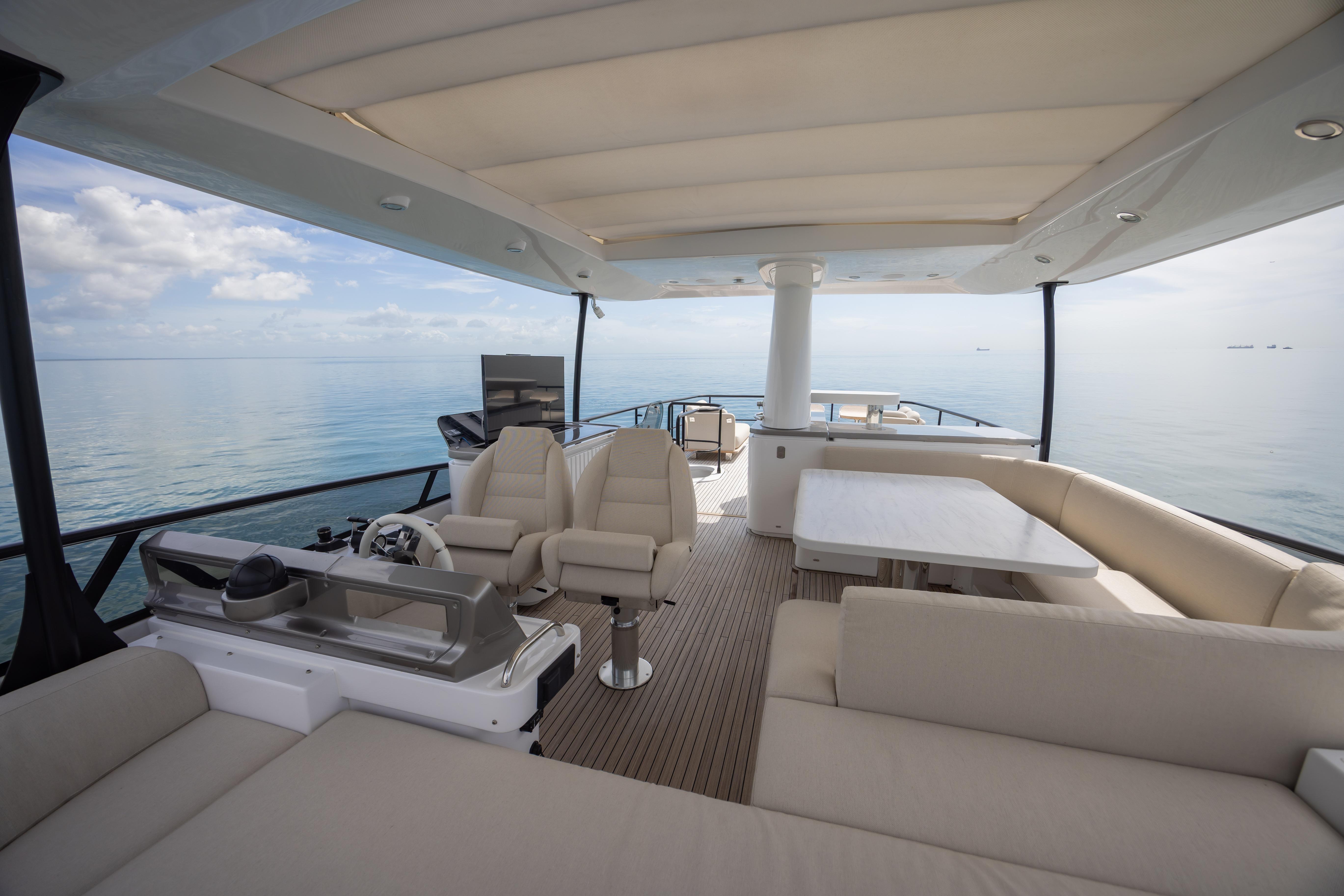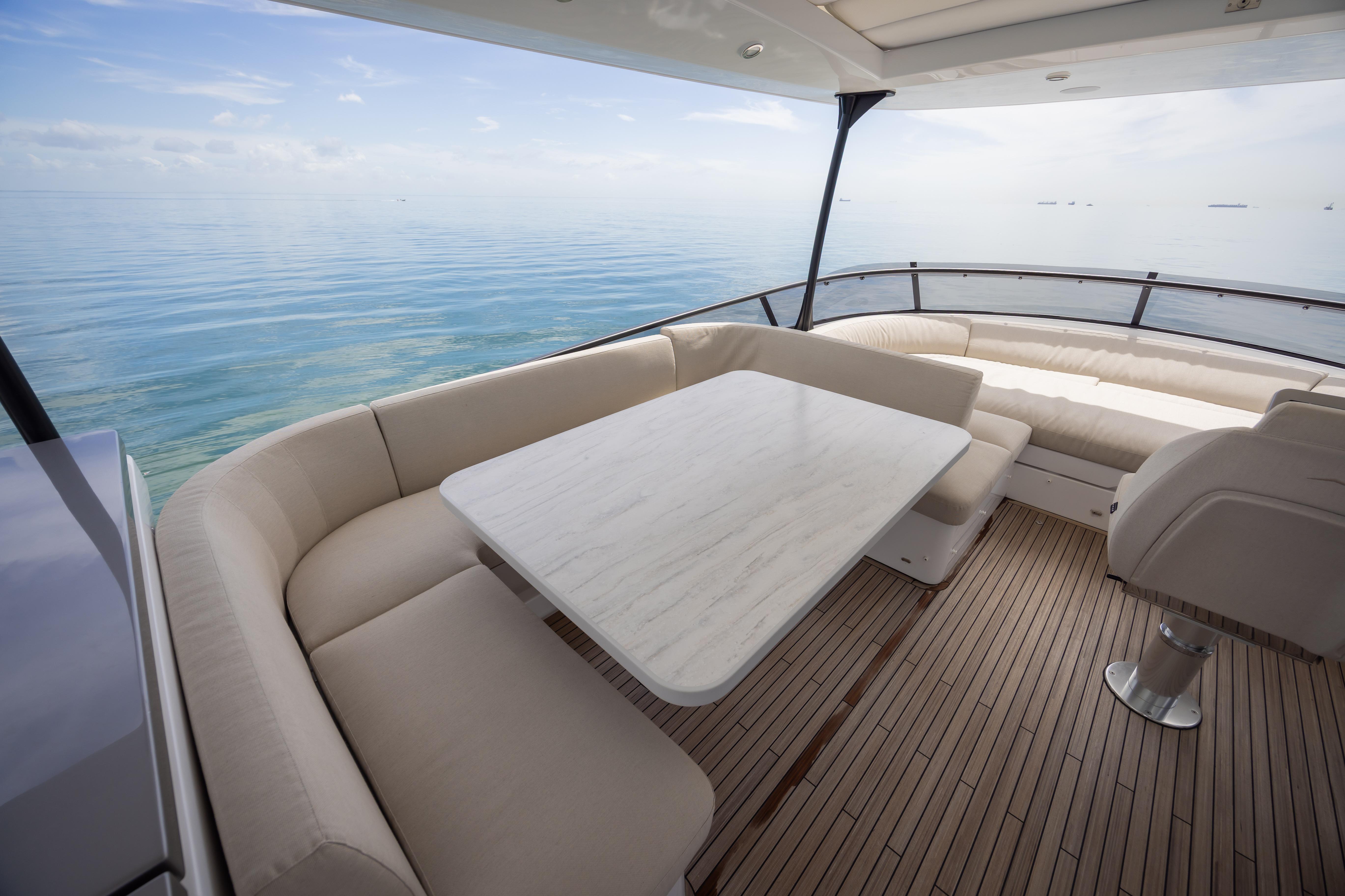 Lounge furniture on aft flybridge with opposing seating (starboard and port) in Batyline fabric and coffee table
