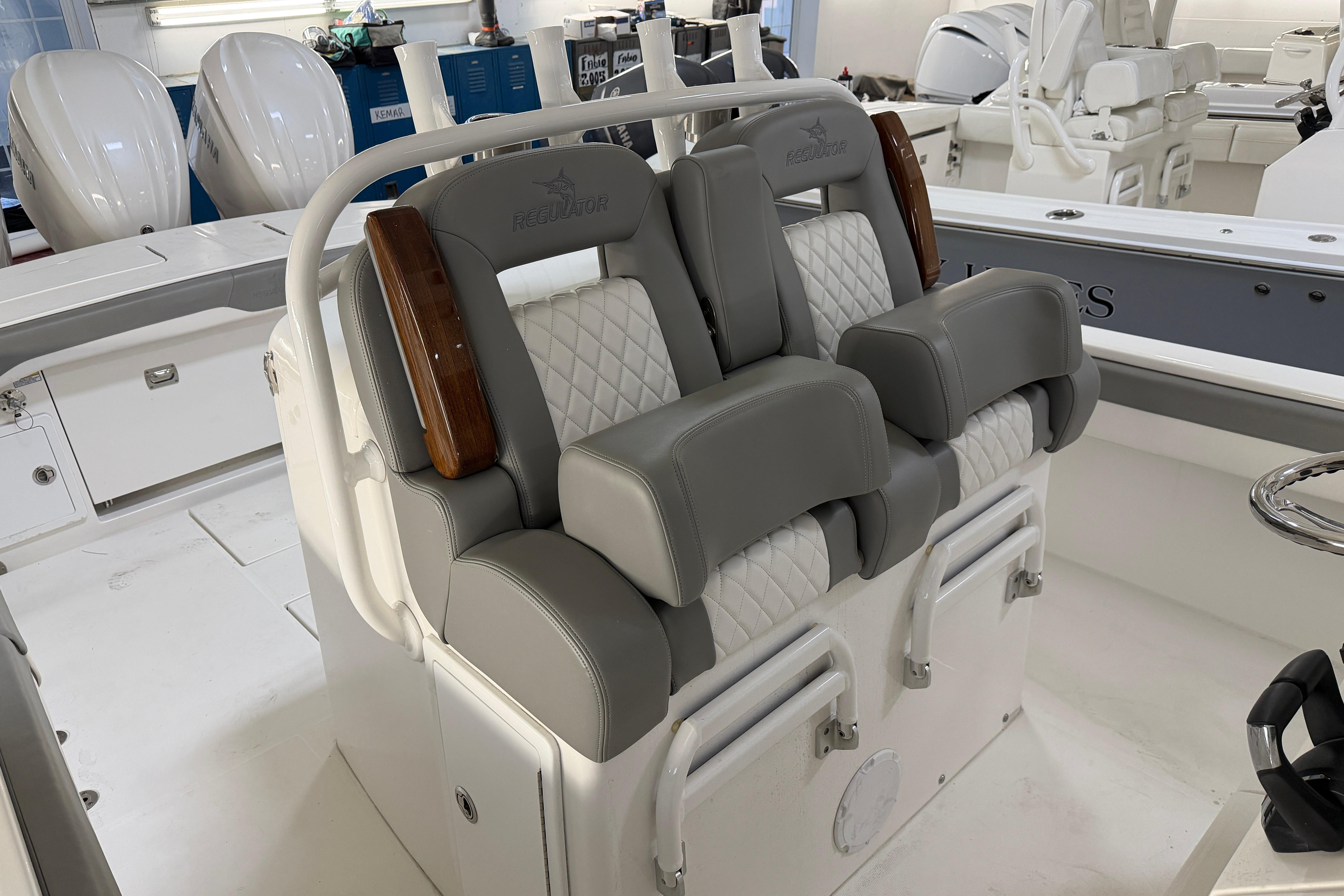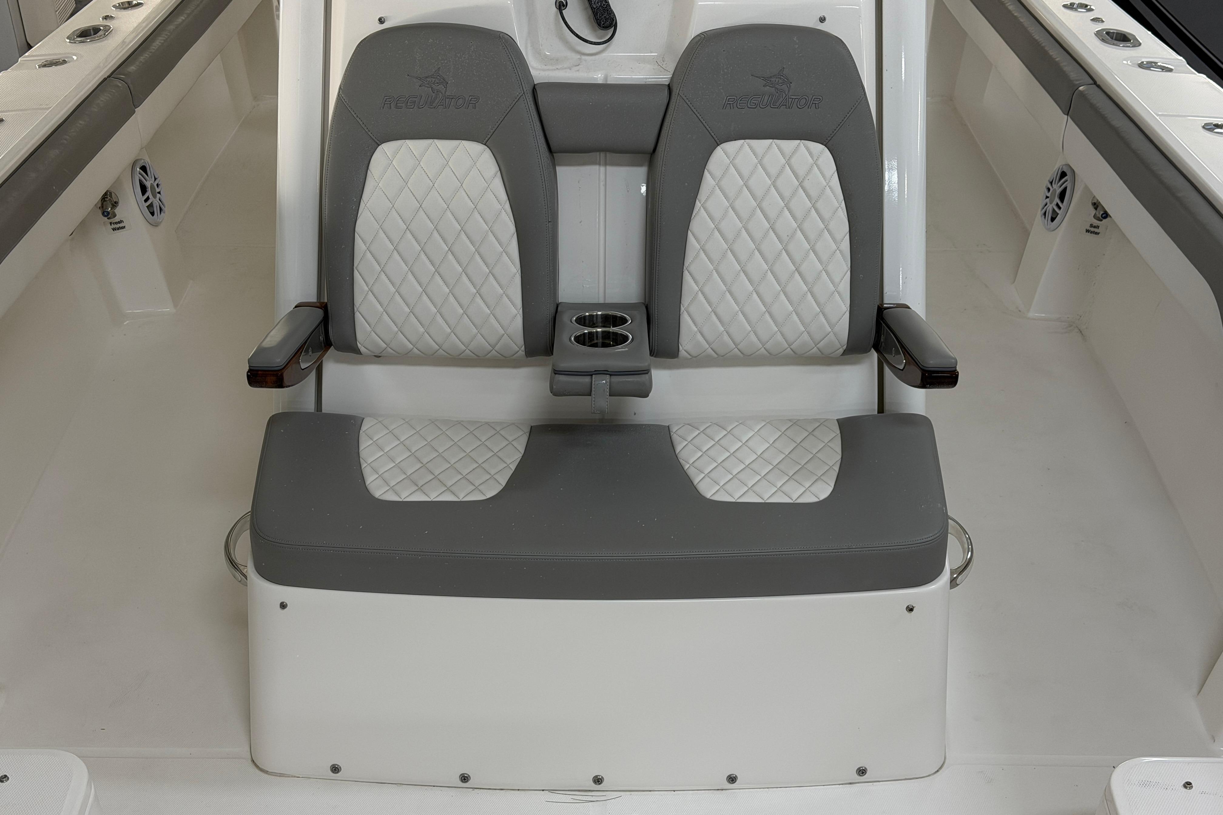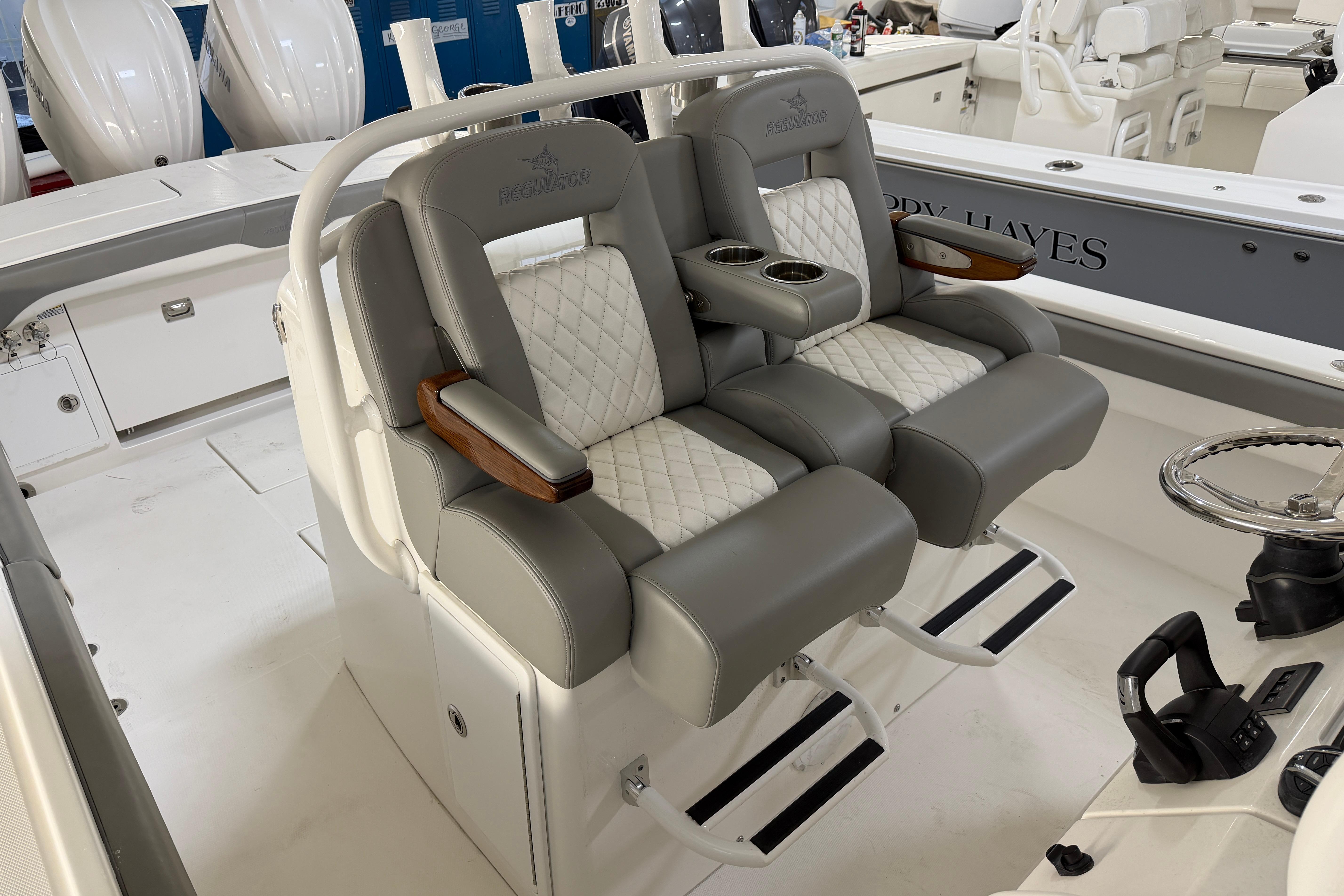 The Regulator 34 is a true center console, with a design that maximizes space to rival its 39-foot competitors. Yamaha Helm Master® EX option and Seakeeper® 2, the 34 is ready for action. Fishermen’s favorites include a huge forward deck, 42-gallon transom livewell, 220-quart transom fishbox, and 3X Deluxe Tackle Center with rigging station. Upgrade to the new 3X Deluxe Mezzanine Tackle Center for additional seating, storage, and seatside rocket launchers to keep you on the fish, then let out your lines. s. Ride in comfort with our integrated wraparound windshield and optional helm A/C, Fusion® entertainment and a new look at the helm – plus starboard boarding and dive door, optional forward sun shade and cockpit SureShade®. Below deck, the berth sleeps two and features abundant rod rack storage, among other overnight amenities, making the 34 a favorite again and again.