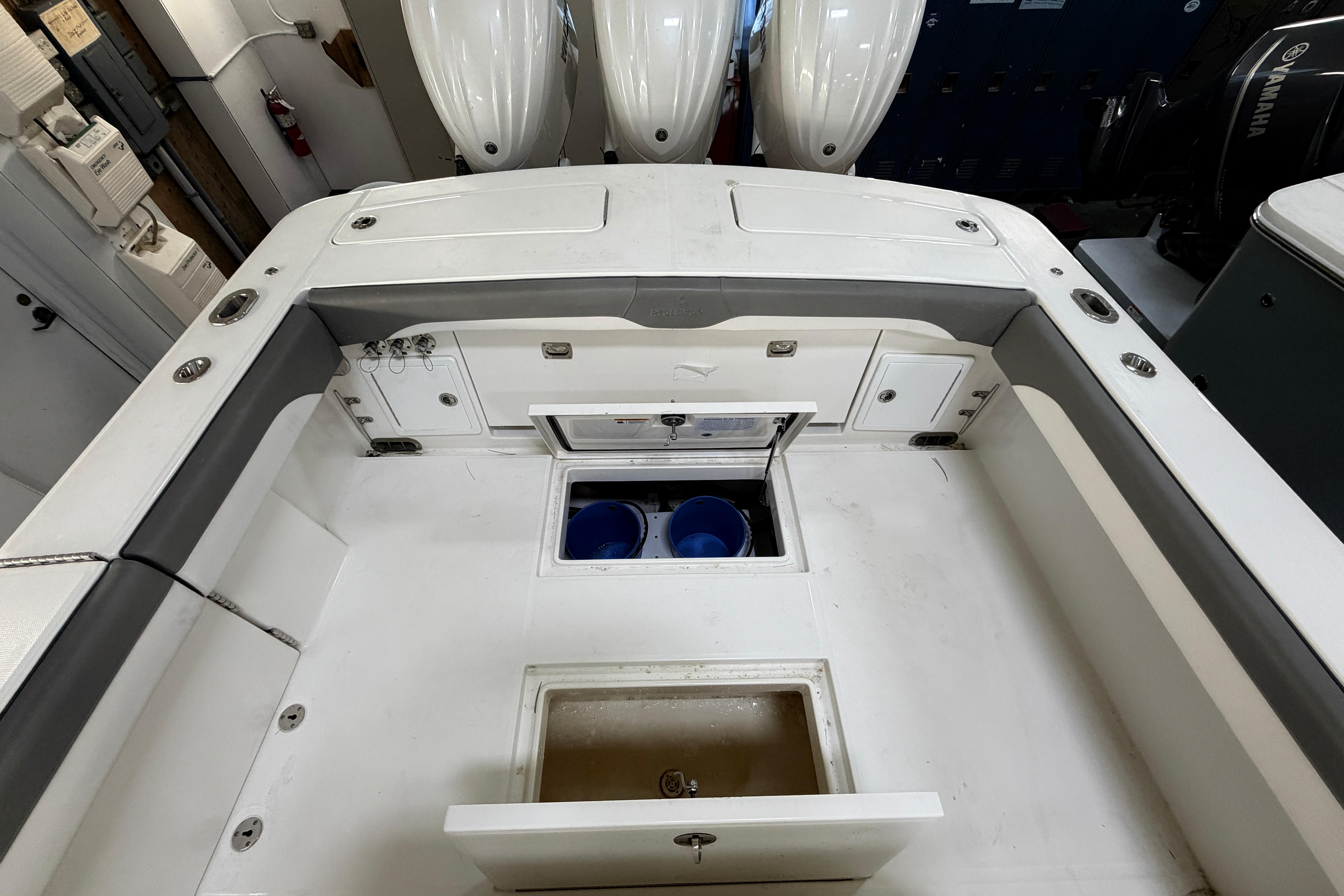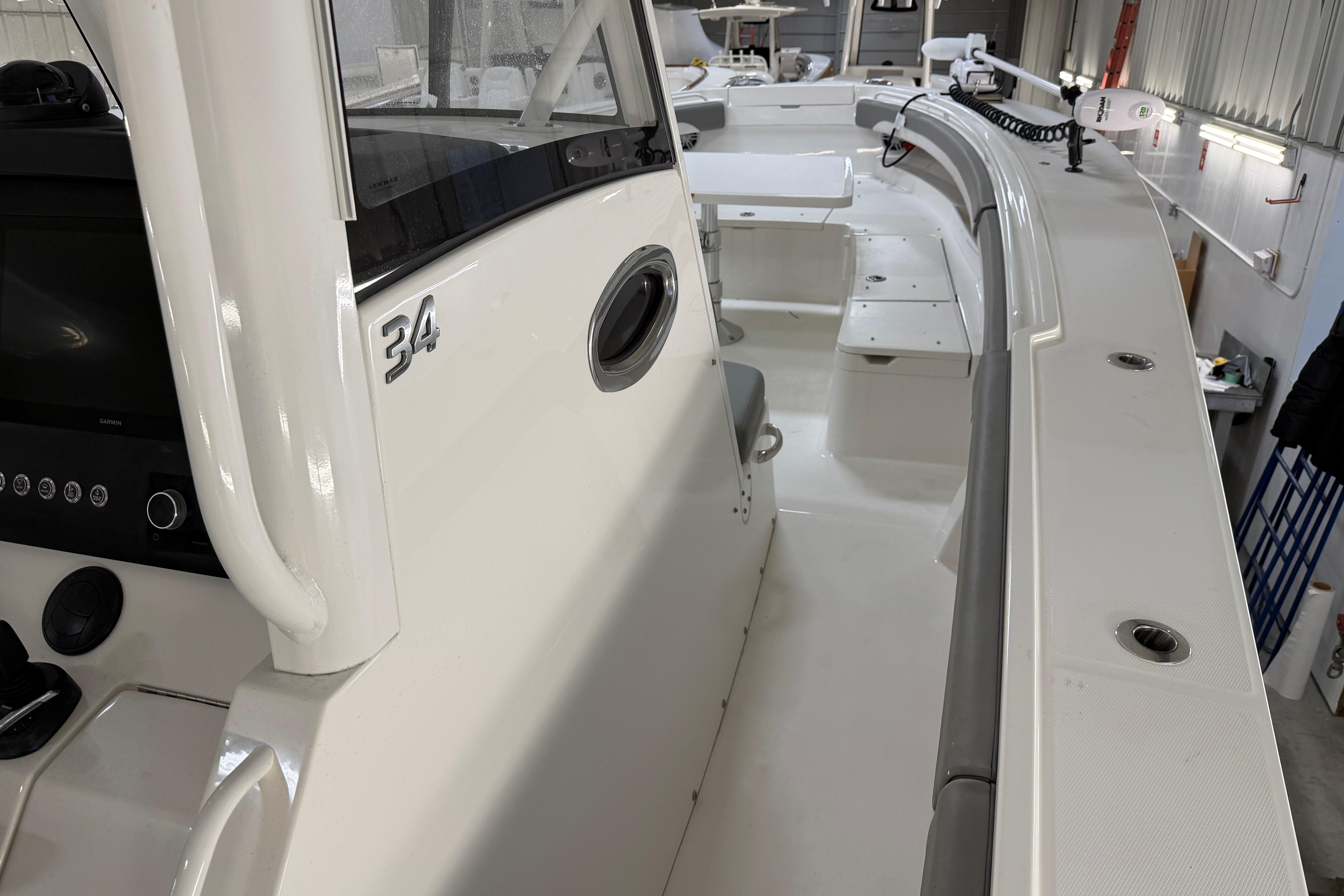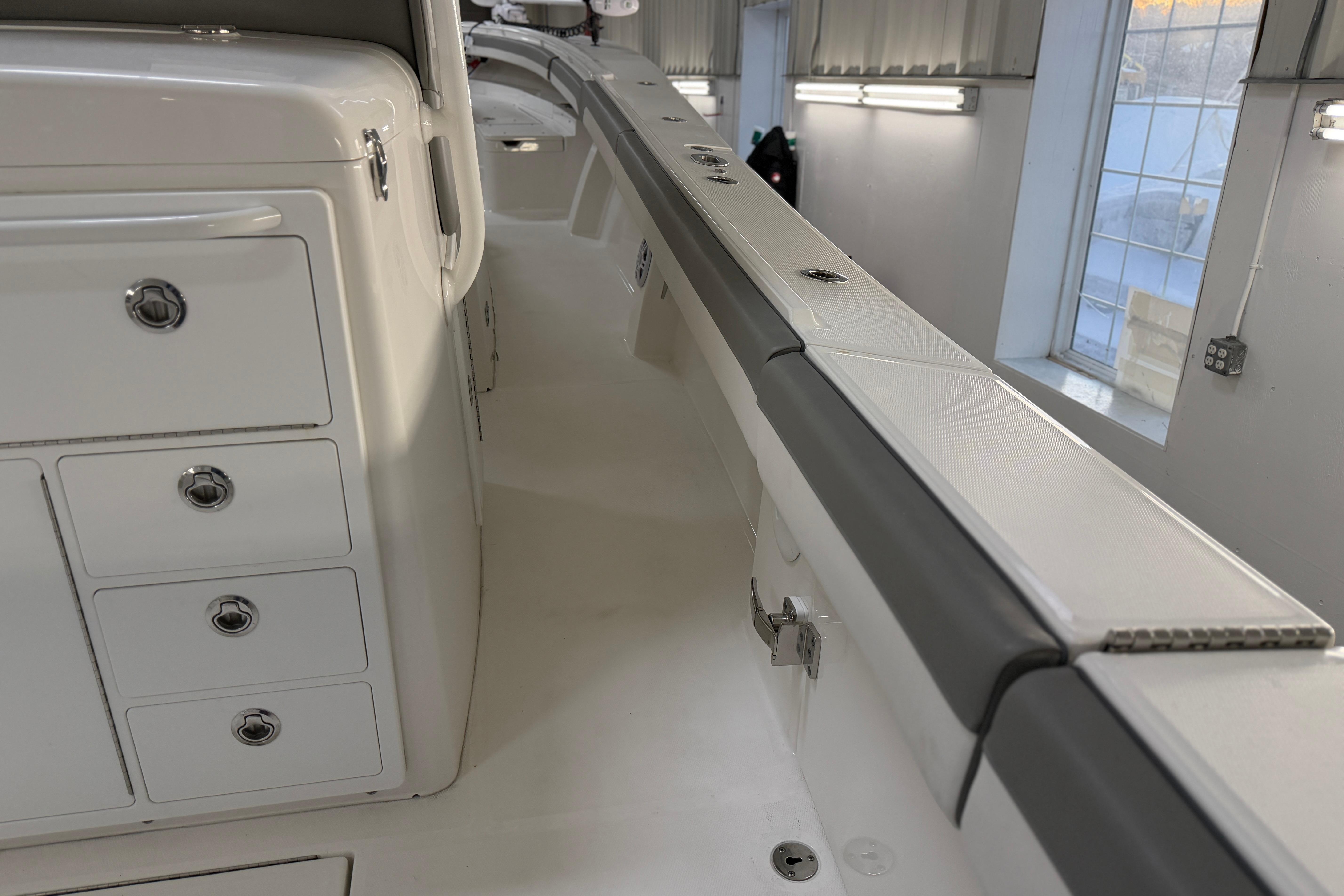 The Regulator 34 is a true center console, with a design that maximizes space to rival its 39-foot competitors. Yamaha Helm Master® EX option and Seakeeper® 2, the 34 is ready for action. Fishermen’s favorites include a huge forward deck, 42-gallon transom livewell, 220-quart transom fishbox, and 3X Deluxe Tackle Center with rigging station. Upgrade to the new 3X Deluxe Mezzanine Tackle Center for additional seating, storage, and seatside rocket launchers to keep you on the fish, then let out your lines. s. Ride in comfort with our integrated wraparound windshield and optional helm A/C, Fusion® entertainment and a new look at the helm – plus starboard boarding and dive door, optional forward sun shade and cockpit SureShade®. Below deck, the berth sleeps two and features abundant rod rack storage, among other overnight amenities, making the 34 a favorite again and again.