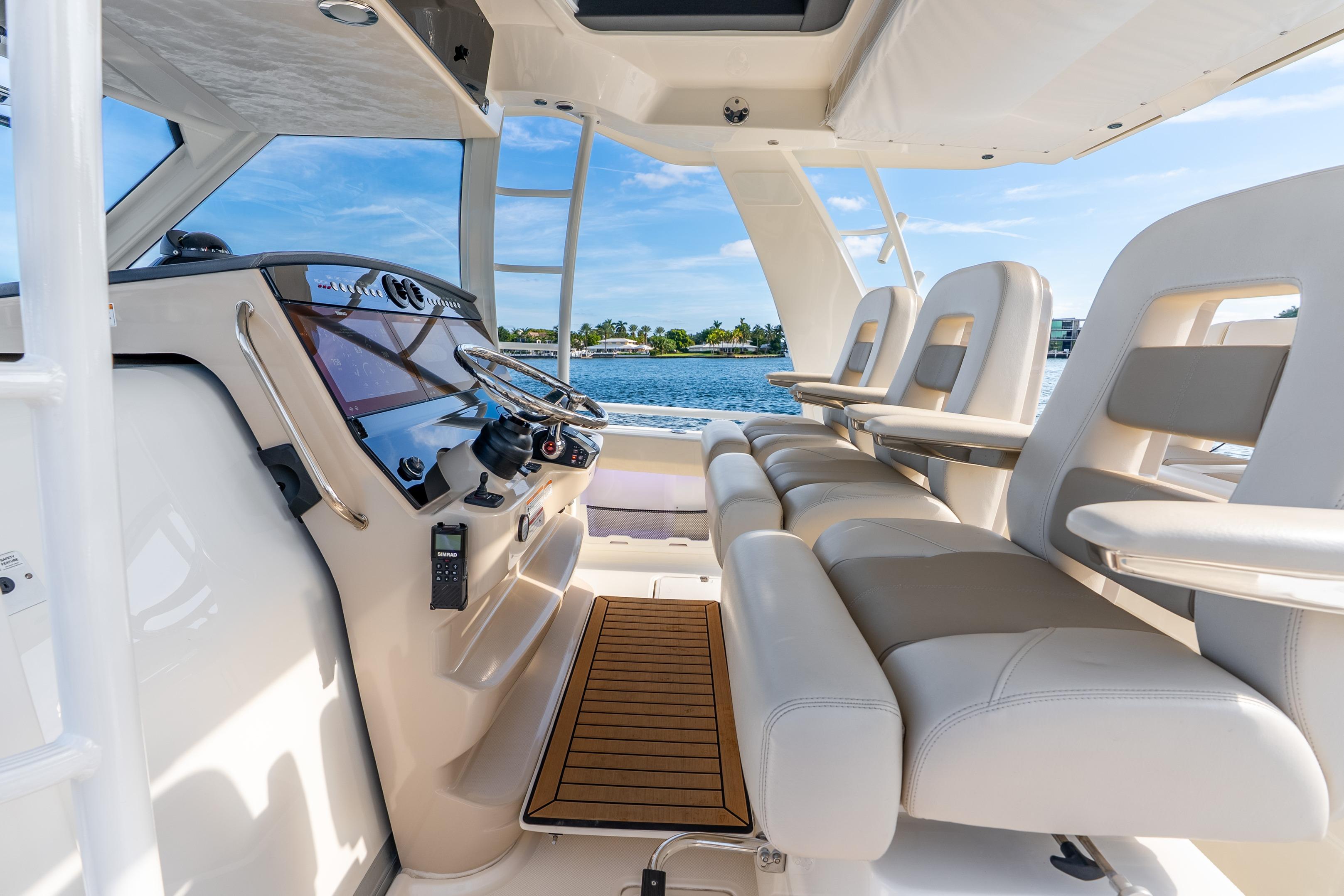 - Cockpit sunshade deploys electronically and features black Sunbrella canvas.