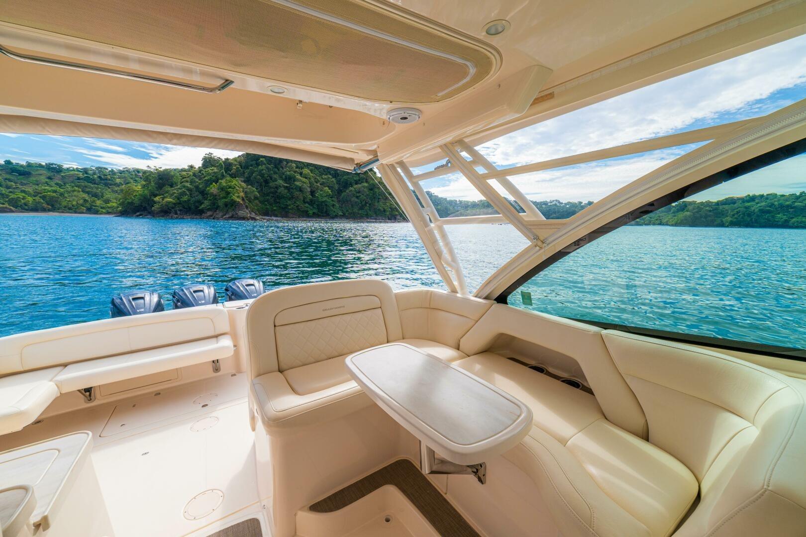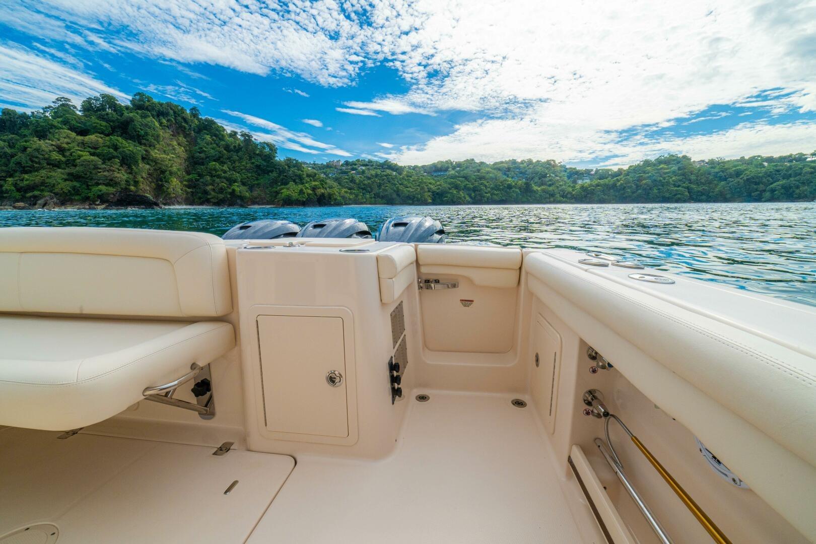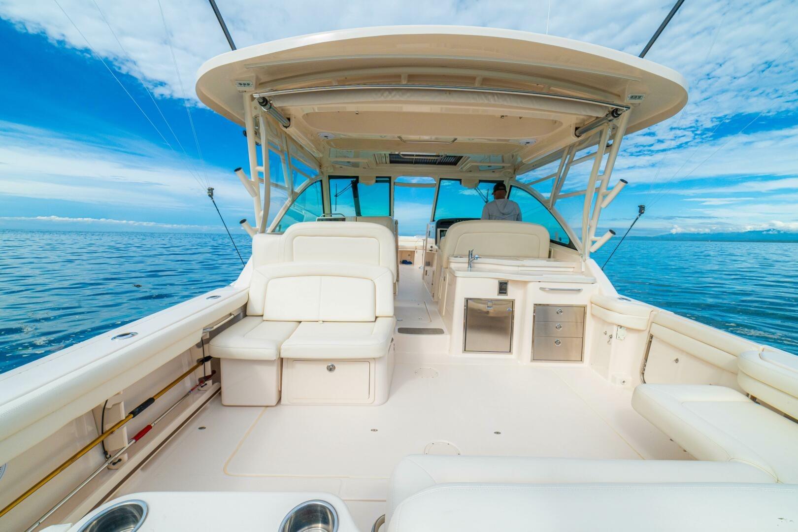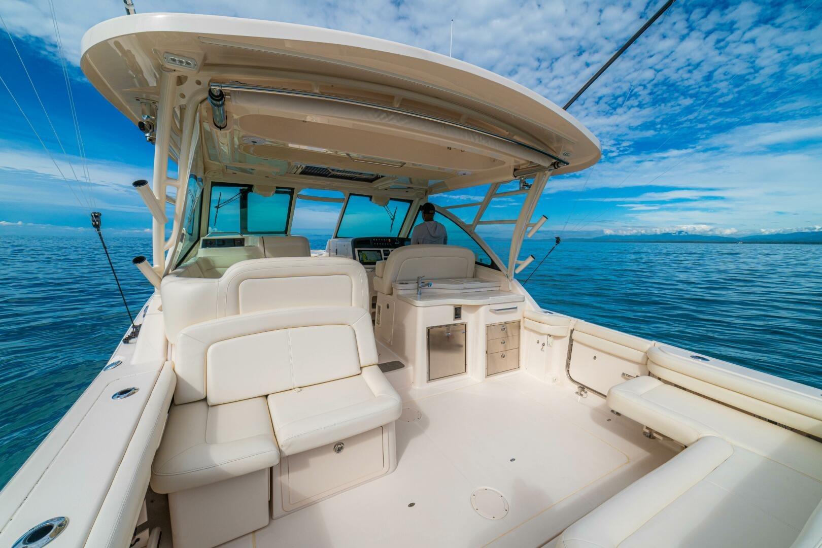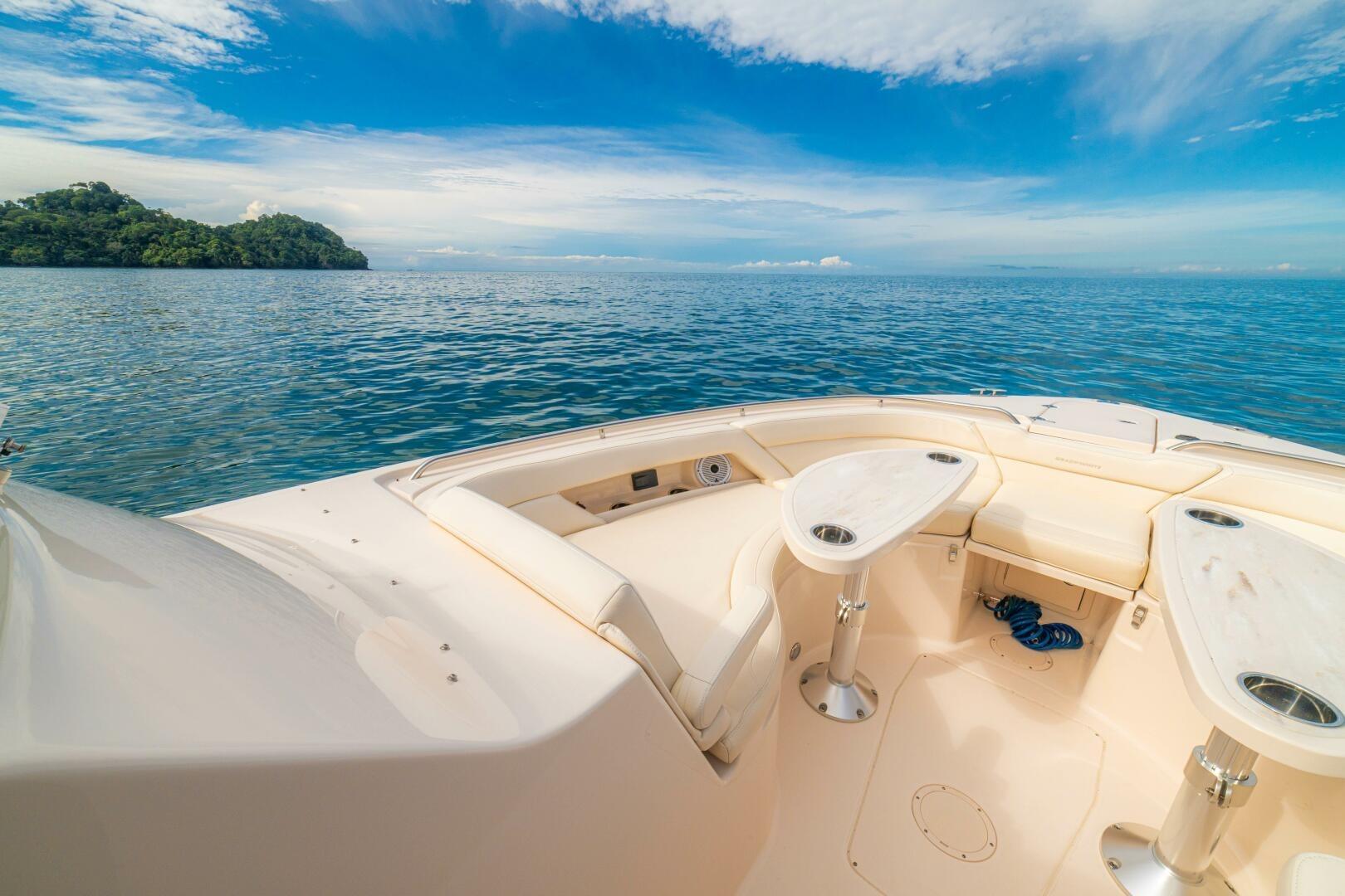 Her layout is designed for comfort and functionality, with generous seating throughout the cockpit and bow, multiple electrically adjustable tables, a retractable SureShade, sliding sunroof, and a fully integrated wet bar with grill, refrigeration, and storage. Below, dual climate-controlled console cabins provide unexpected overnight accommodations, including a sizeable berth, head with shower, microwave, TV, and ample storage. With her patented SeaV² hull, extensive list of standard equipment, and desirable optional features, “DOS AMIGOS” represents one of the nicest Freedom 375 on the market.