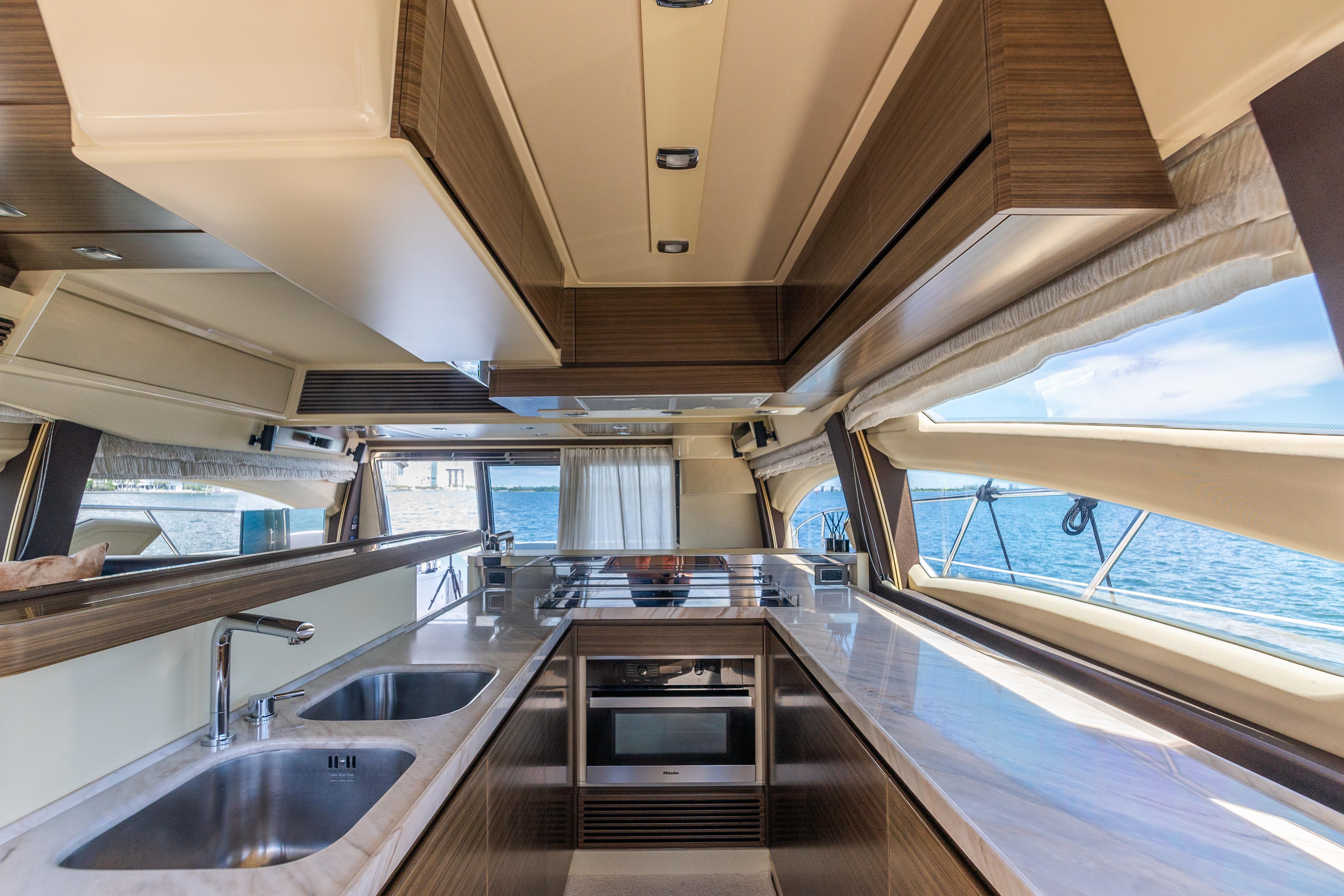 Inside, the main level features an open and expansive salon, galley with stunning marble countertop, Miele induction stovetop and microwave/convection oven, Gessi faucet and dual Frankie sinks. The galley includes an Isotherm refrigerator and Vitrigo freezer unit with built in drawers dedicated for plate and crystal storage. The dining area is stylish and designed for both casual and formal dining. Main living area includes U-shaped seating with plush upholstery and underneath storage, a stylish cocktail take, custom decor accents, Samsung pop-up television and Bose surround speakers.