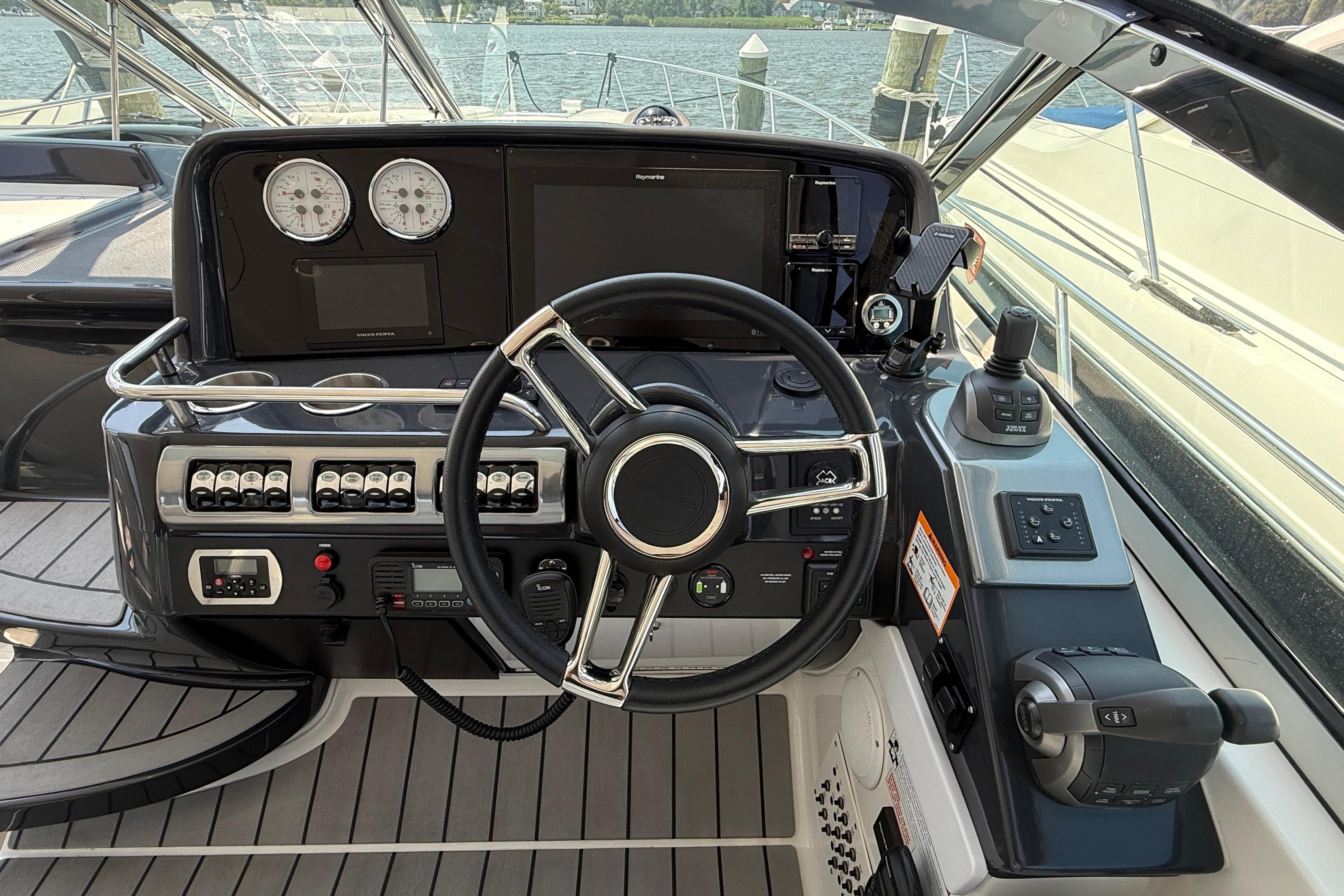 4. Premium Raymarine electronics suite (large-format displays; radar/autopilot packages available) – clean helm layout with serious navigation capability.