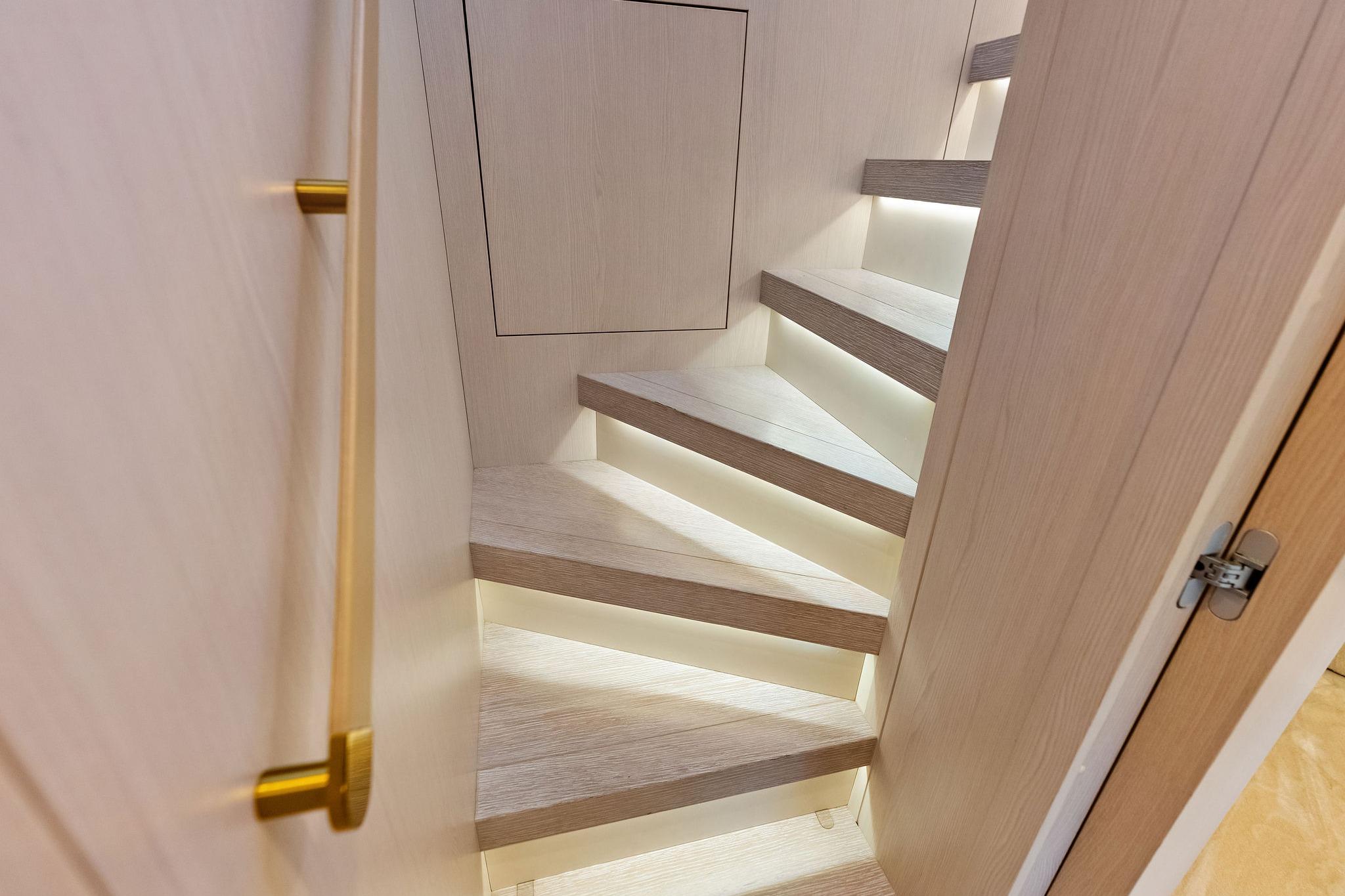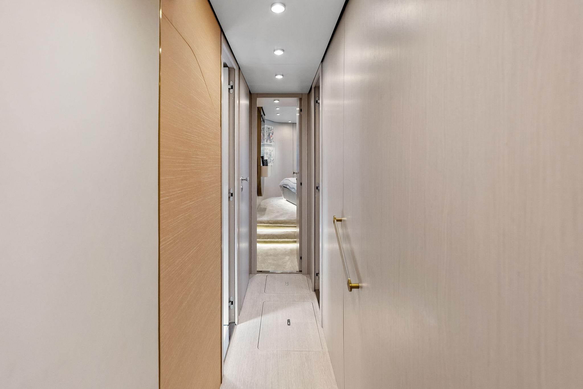 The interior showcases refined Italian design with upgraded décor and flooring, enhanced by bespoke custom additions including a custom-built bottle display, custom wine cooler relocation with slide-out glass storage, Salvagni-designed custom carpets, and acrylic storage solutions throughout. The garage and engine room benefit from professionally engineered custom storage systems, maximizing functionality without compromising aesthetics.