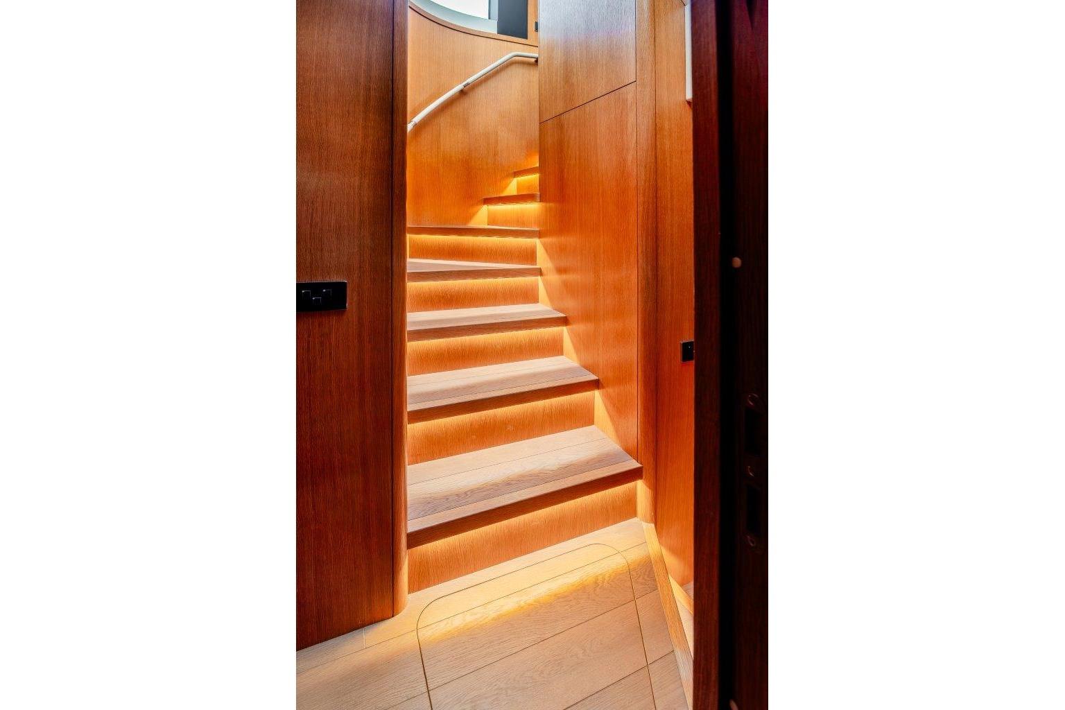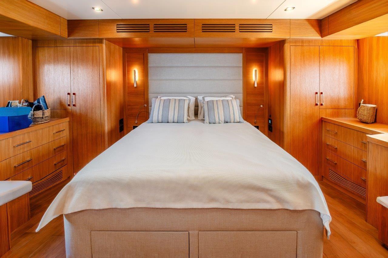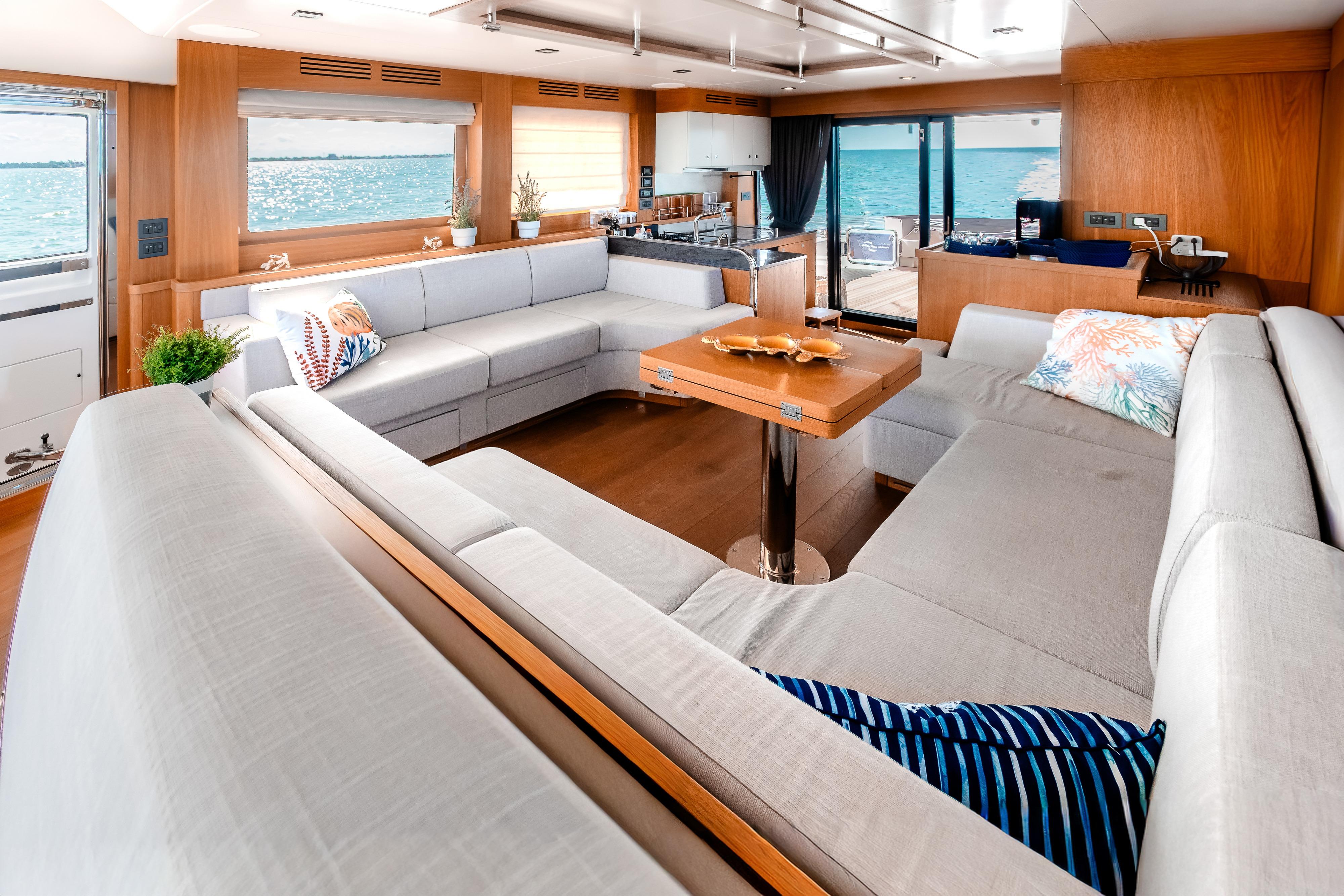 VIAKAREY’s interior, imagined by Tommaso Spadolini, is a bright, modern sanctuary marked by expansive hull portlights in the primary and VIP staterooms and striking glasswork throughout the main deck. Her main salon is midship, filled with natural light, and effortlessly transitions between lounging and dining for six to eight guests. The galley is full-beam and aft, offering direct access to both interior and alfresco dining areas, with generous storage and five-star culinary capability.