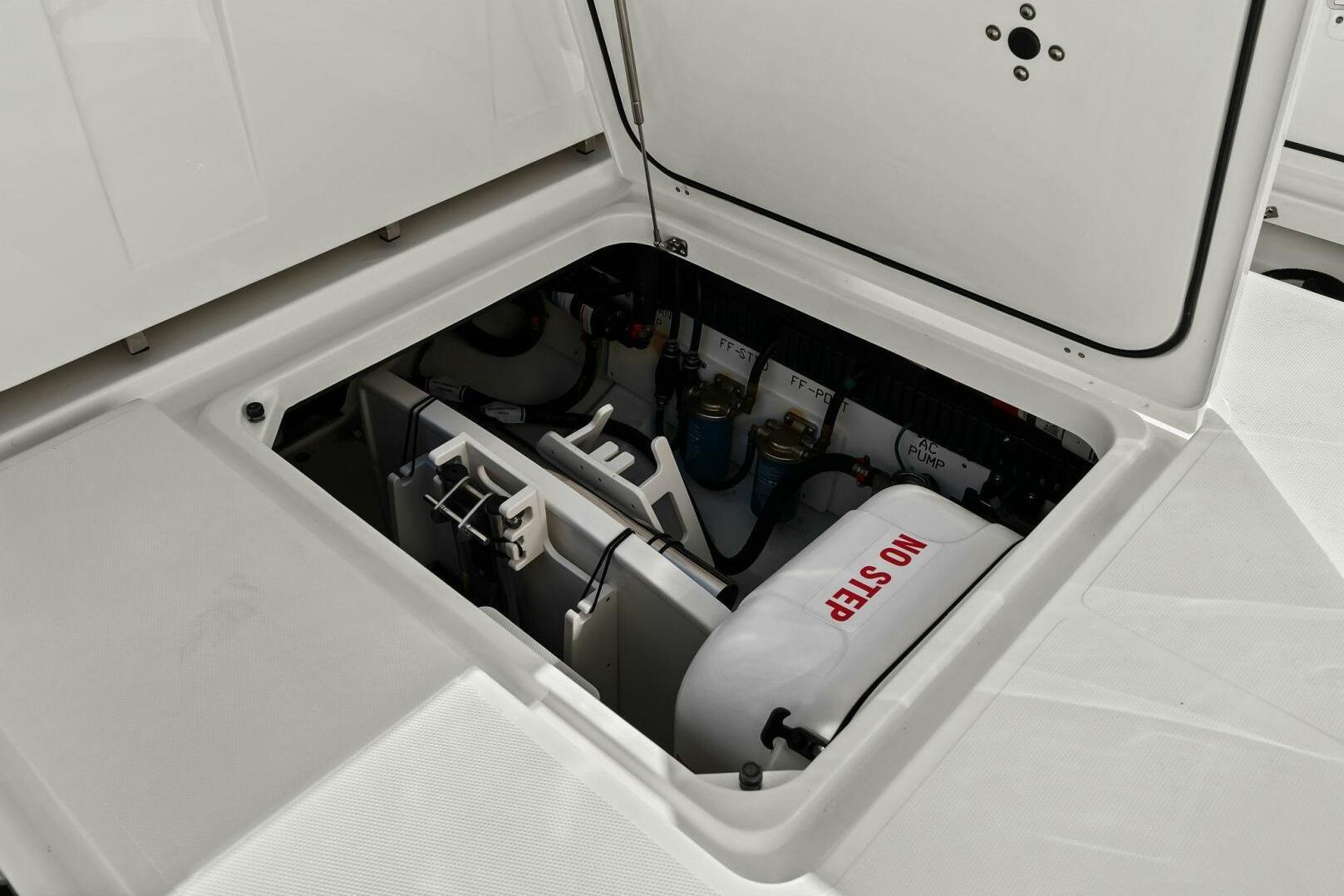 Equipped with a full Garmin electronics package, the helm is easy to operate and provides clear, reliable information whether you’re fishing offshore or cruising with family. The layout is designed to handle both activities comfortably, offering ample cockpit space for anglers while still providing plenty of seating and thoughtful amenities for guests.