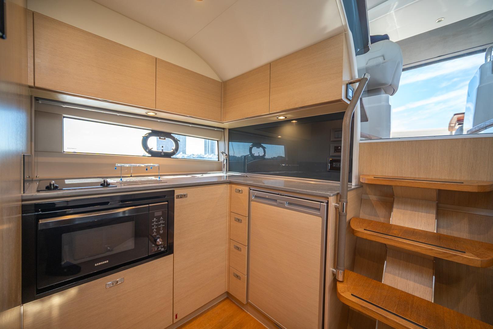 Fully equipped galley with refrigerator, microwave, and cooktop