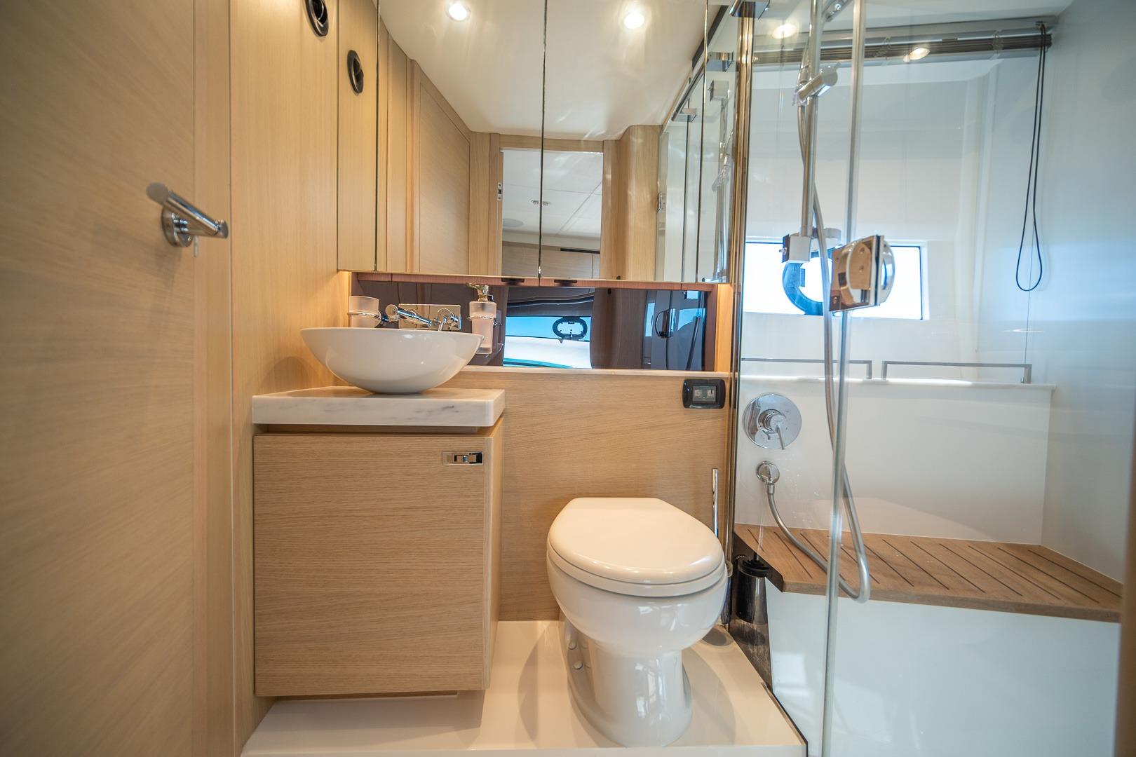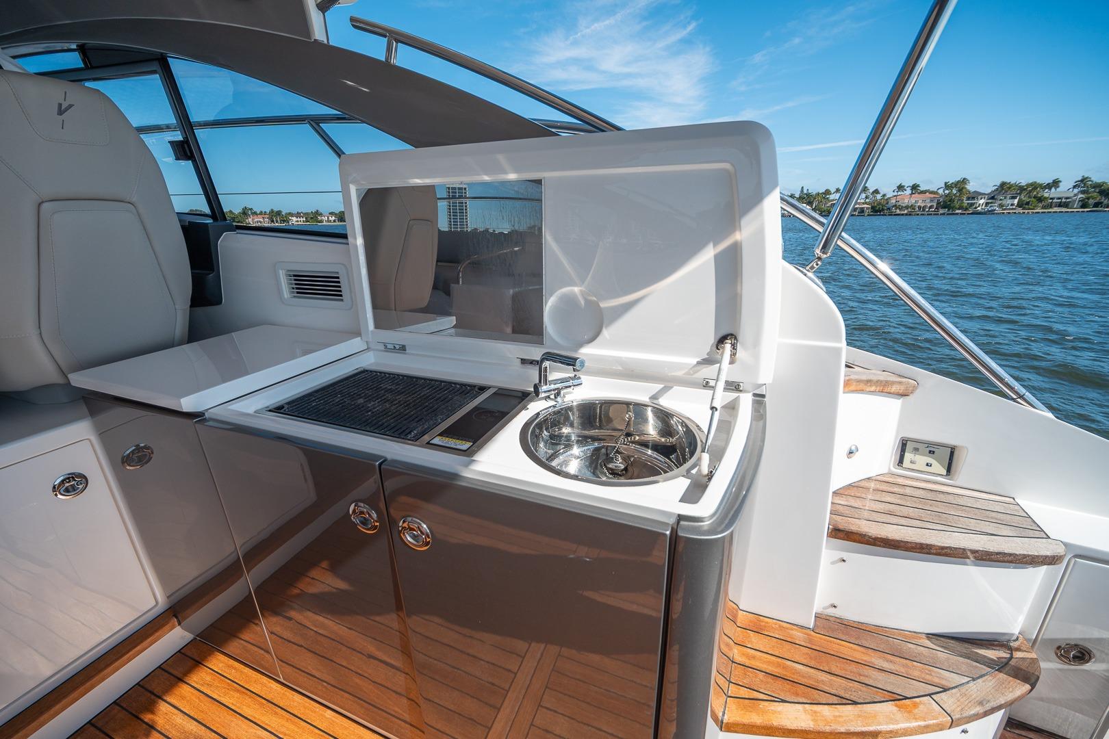 Below deck, the Princess V40 interior is bright and contemporary with high-end finishes, premium upholstery, and thoughtful use of space. The forward master stateroom offers a comfortable island berth, while the mid-cabin provides additional sleeping accommodations for guests. A fully equipped galley, modern head with separate shower, and ample storage makes this yacht ideal for overnight or extended cruising.