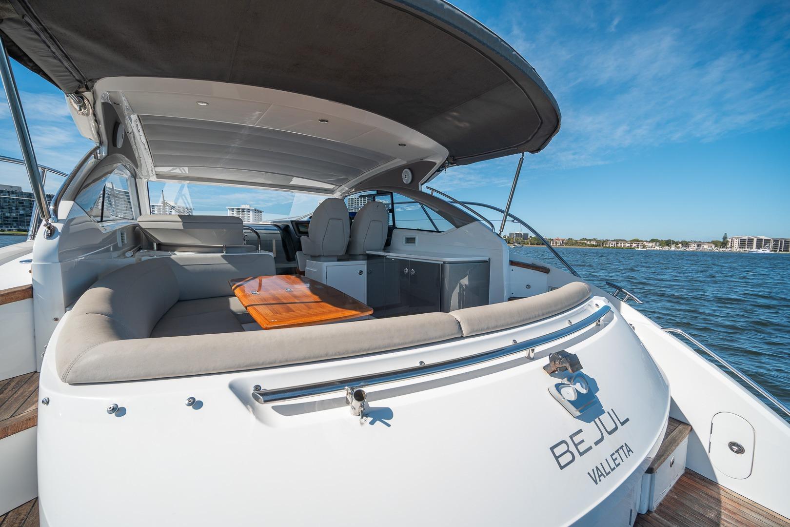 Powered by twin Volvo Penta engines, the Princess V40 delivers impressive acceleration, smooth handling, and efficient cruising—perfect for coastal cruising, weekend getaways, and entertaining. The open cockpit layout features generous seating, a wet bar, and excellent flow for socializing, while the hardtop with an opening sunroof provides comfort in all weather conditions.