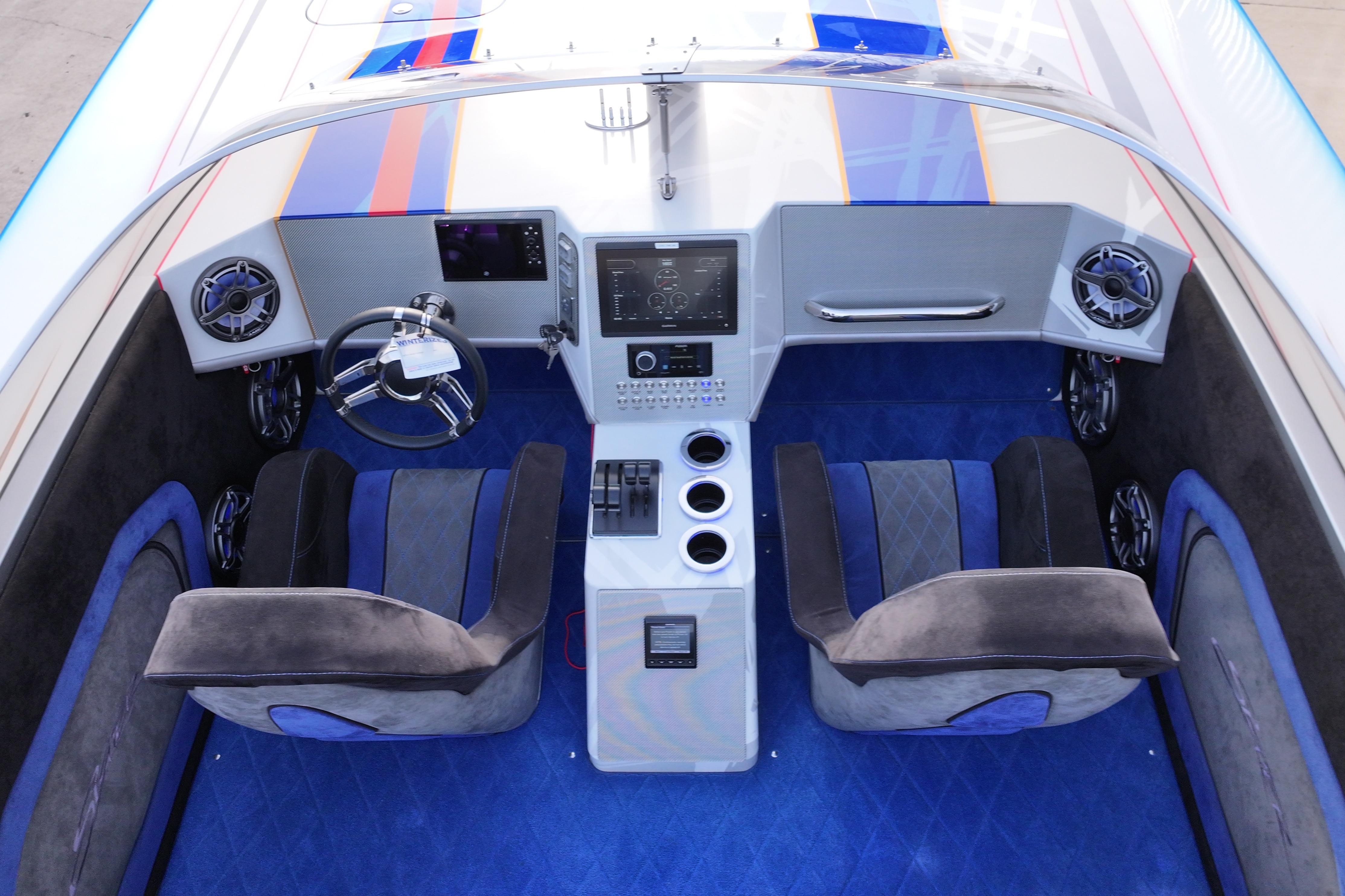 Cleaver props, stainless steel tie bar, trim tabs, Alcantara interior, Fusion/JL Audio sound system, touchscreen Garmin, Mercury Vesselview, and much more!