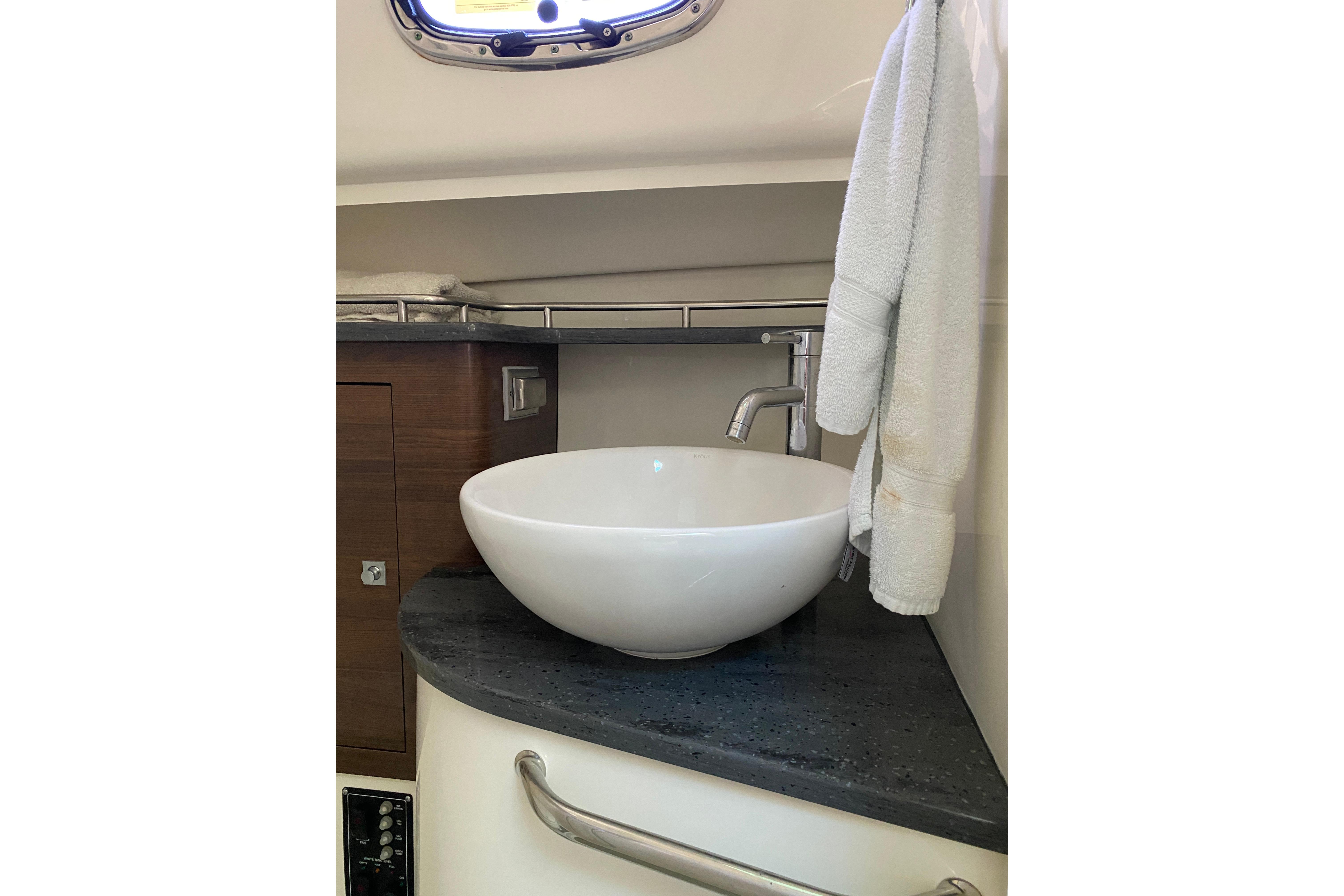 - The well-appointed head features a stylish porcelain sink and stainless-steel accents.