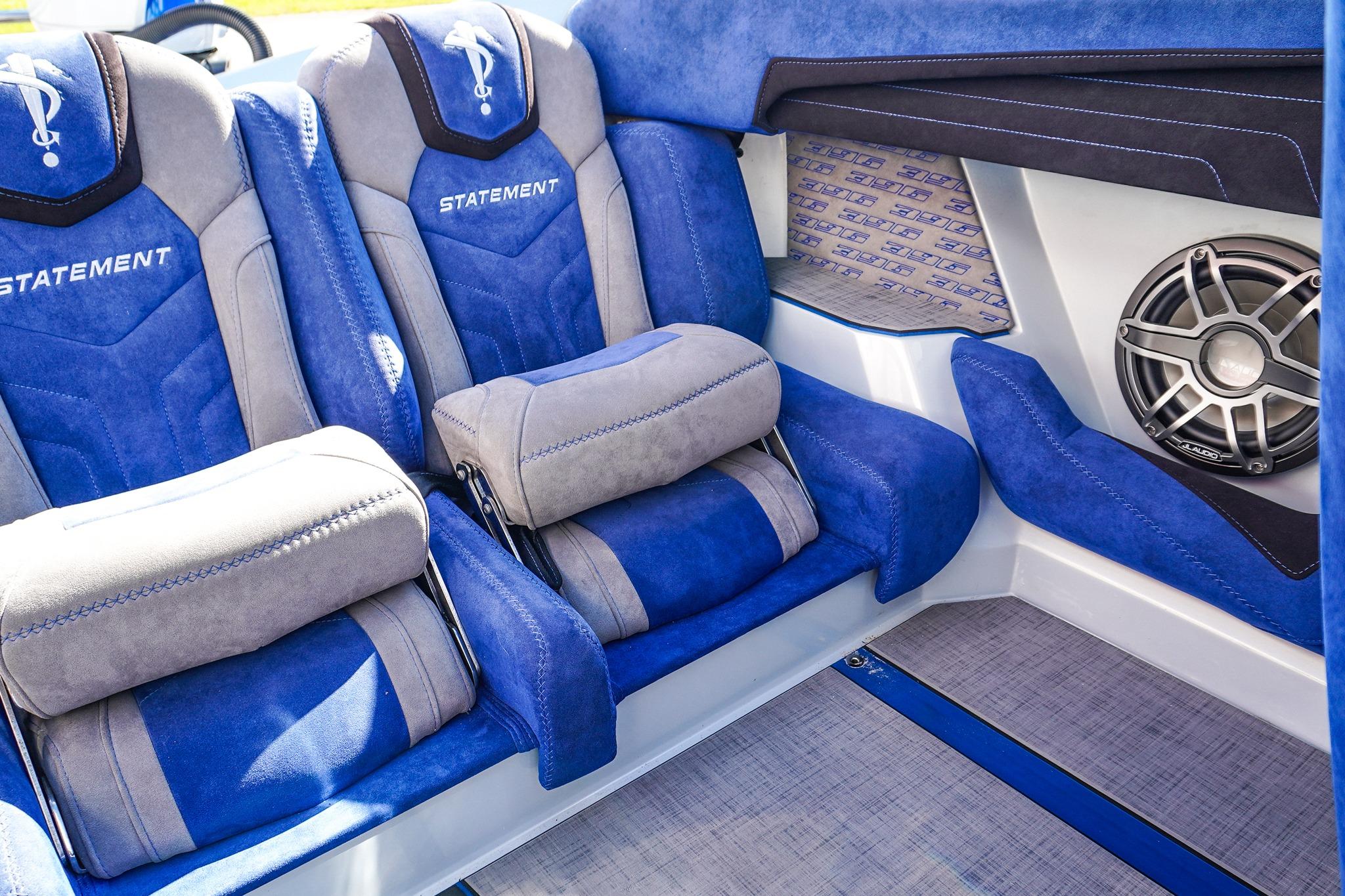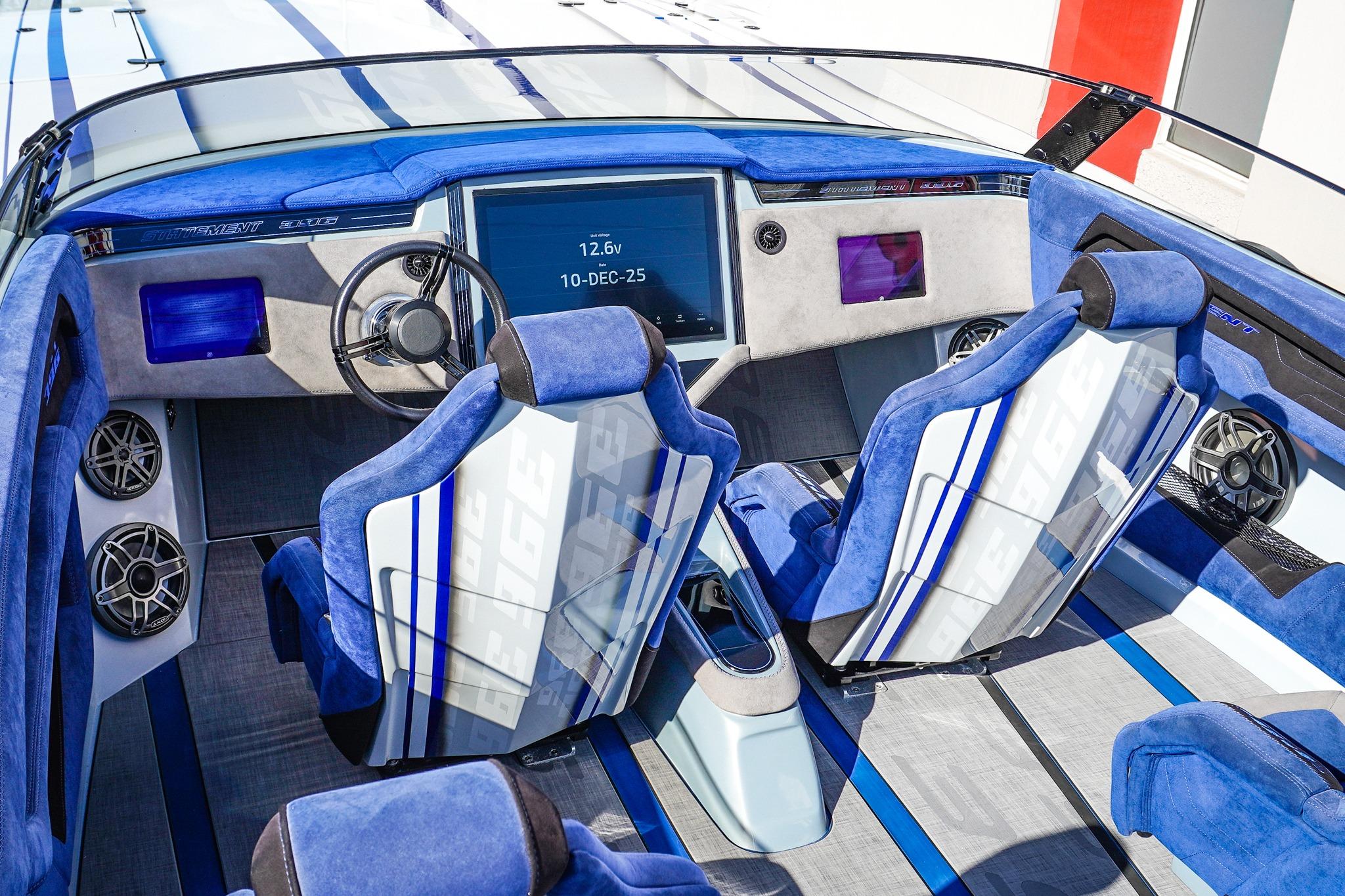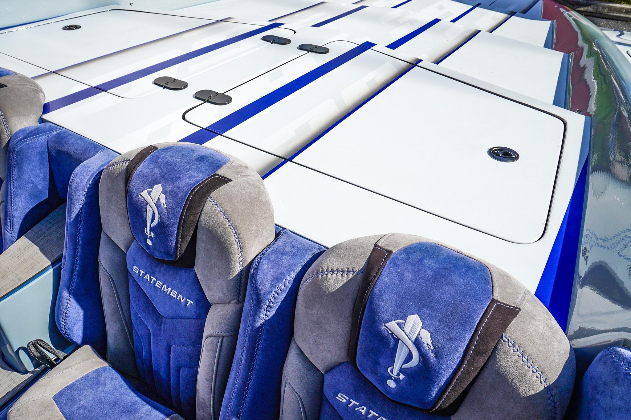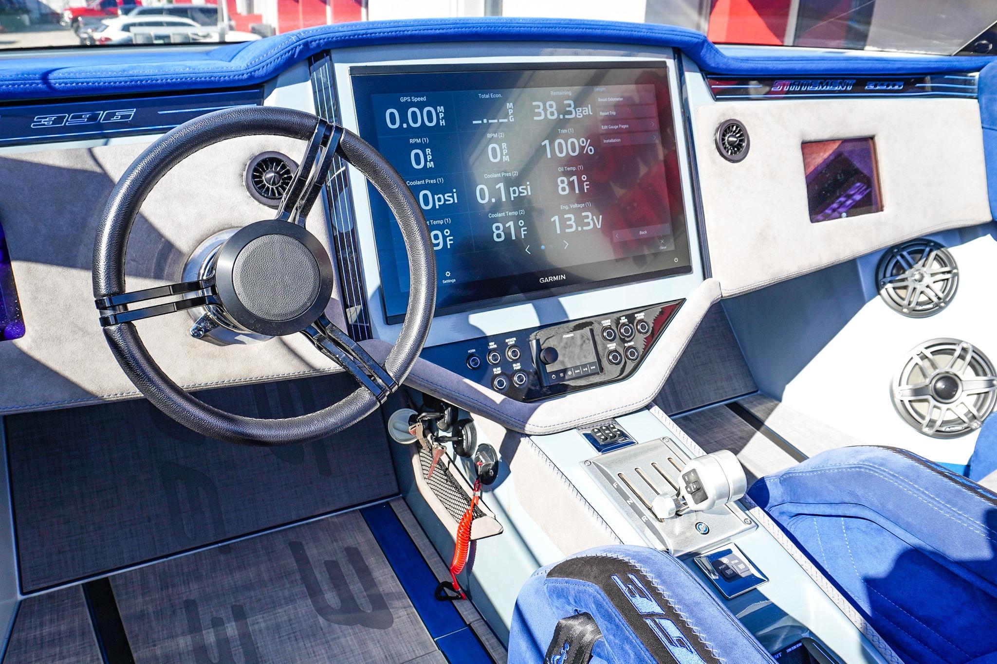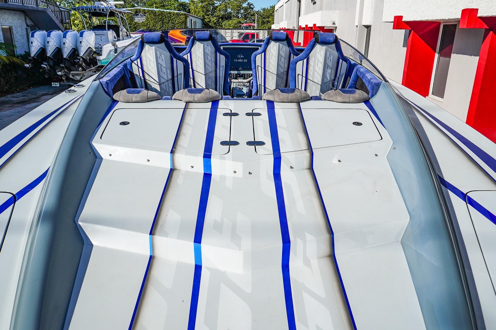 8 Seat Cockpit configuration w/ Pop-up Bolsters on all 8 Seats, Alcantera Interior, Seadek Flooring, Blackout Hardware, HUGE JL Audio Stereo, 22inch Garmin Chartplotter GPS, 2 Mercury Vessel Views, Dash Blowers, Accent Lighting throughout, Under Water lighting, Swim ladder, Cockpit cover, and Custom Triple Axle Aluminum Trailer Included!
