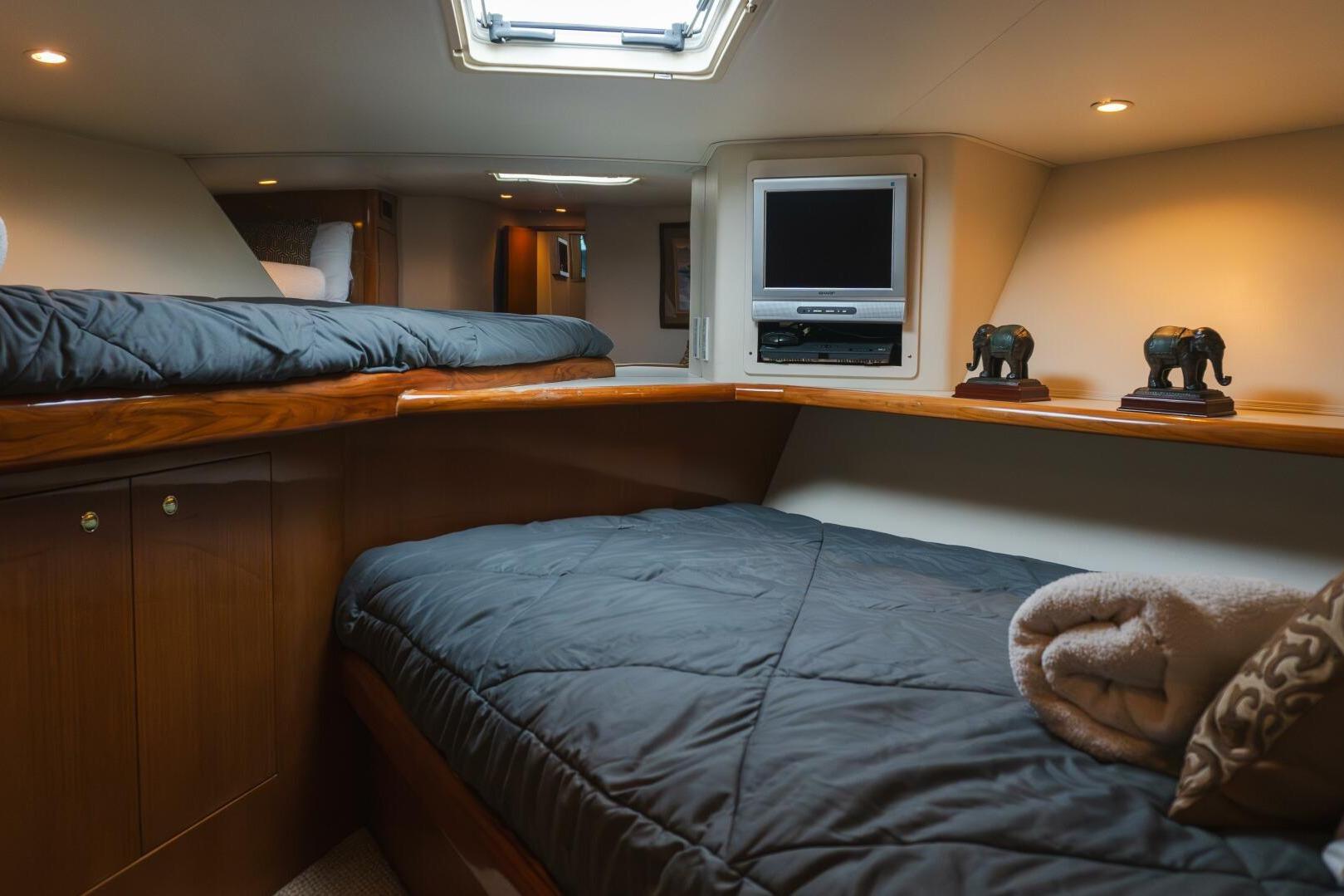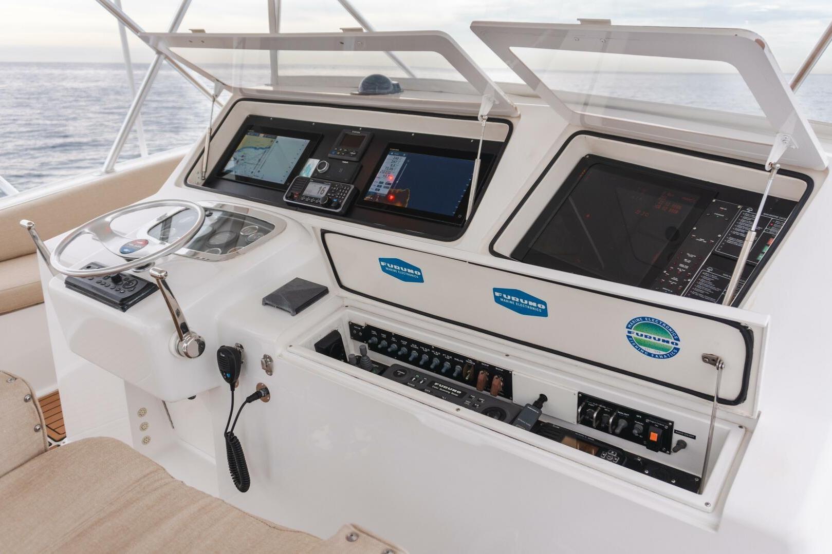 Three stateroom, galley up floorplan, arranged with the master suite amidships, a VIP stateroom forward and two full heads, both with separate stall showers. 200 square foot salon is spacious and includes starboard side peninsula galley and port side dinette. Outside, the large cockpit is fitted with a bait prep station, freezer, baitwells, tuna tubes and access to the engine room, new covering board non-skid, teak on deck, and fighting chair highlight the area. The flybridge is large and well appointed, peninsula console houses new electronics. Seating forward and to port provides guest seating, Seadec flooring compliments the area well and is easy on bare feet.