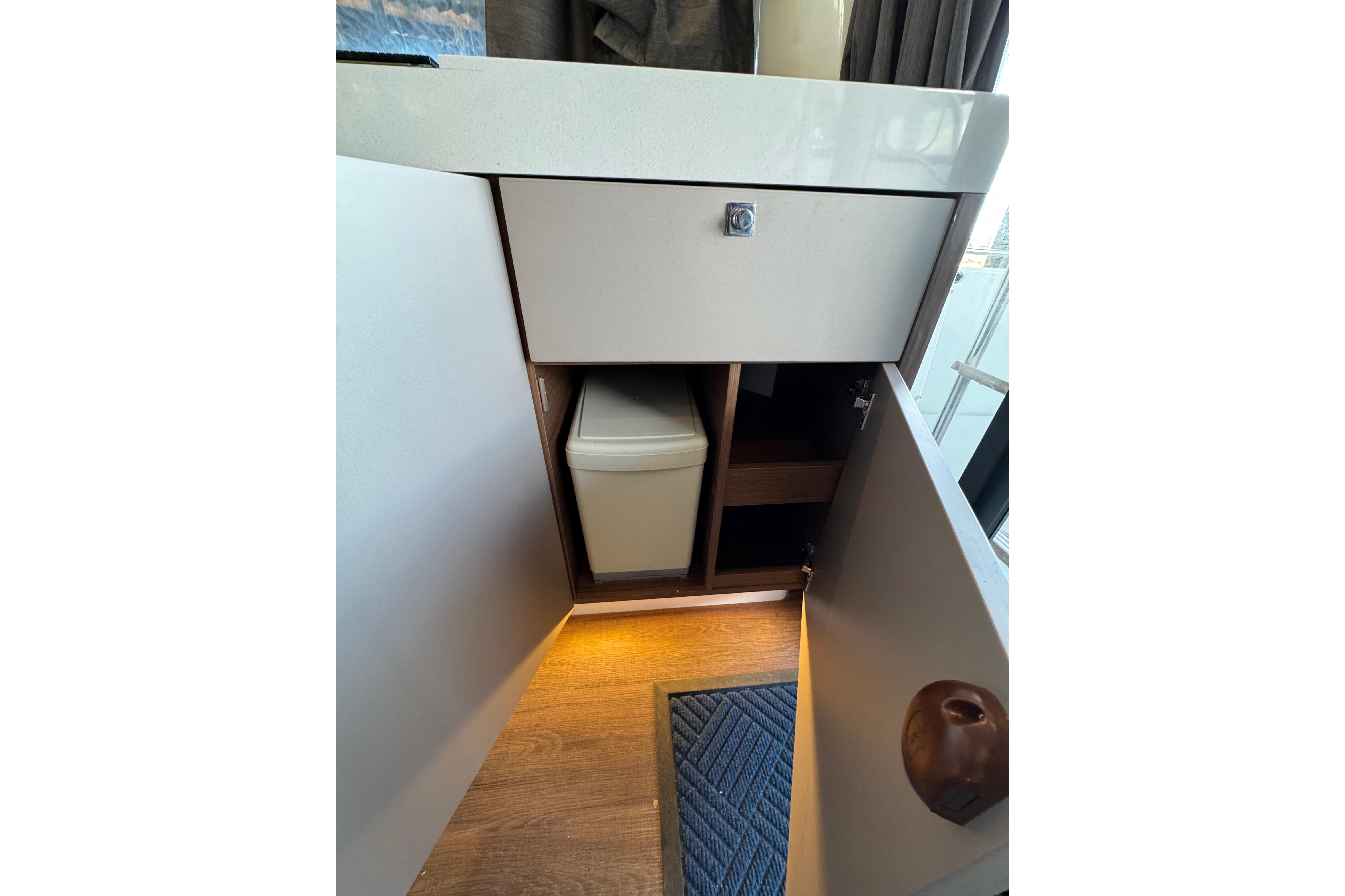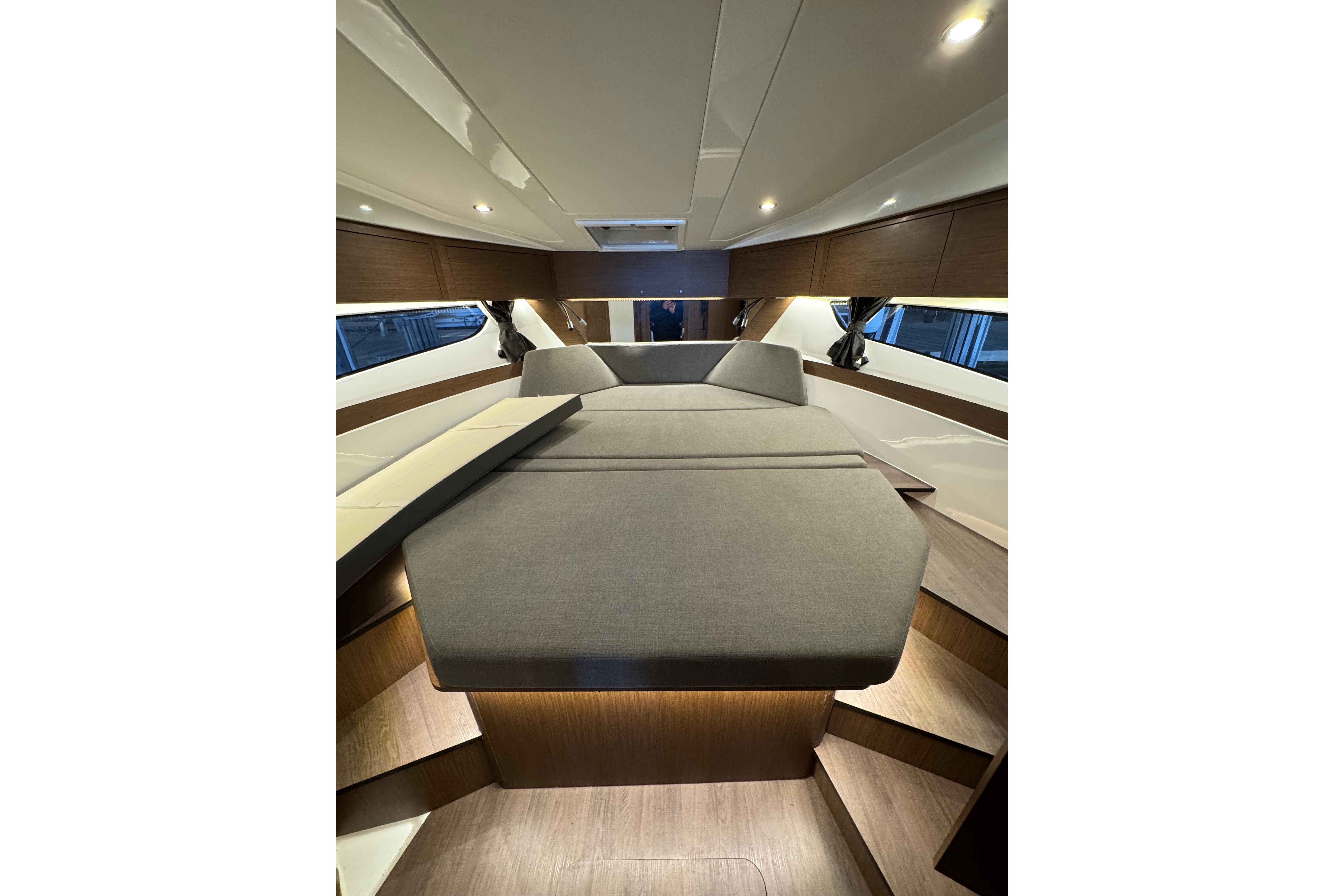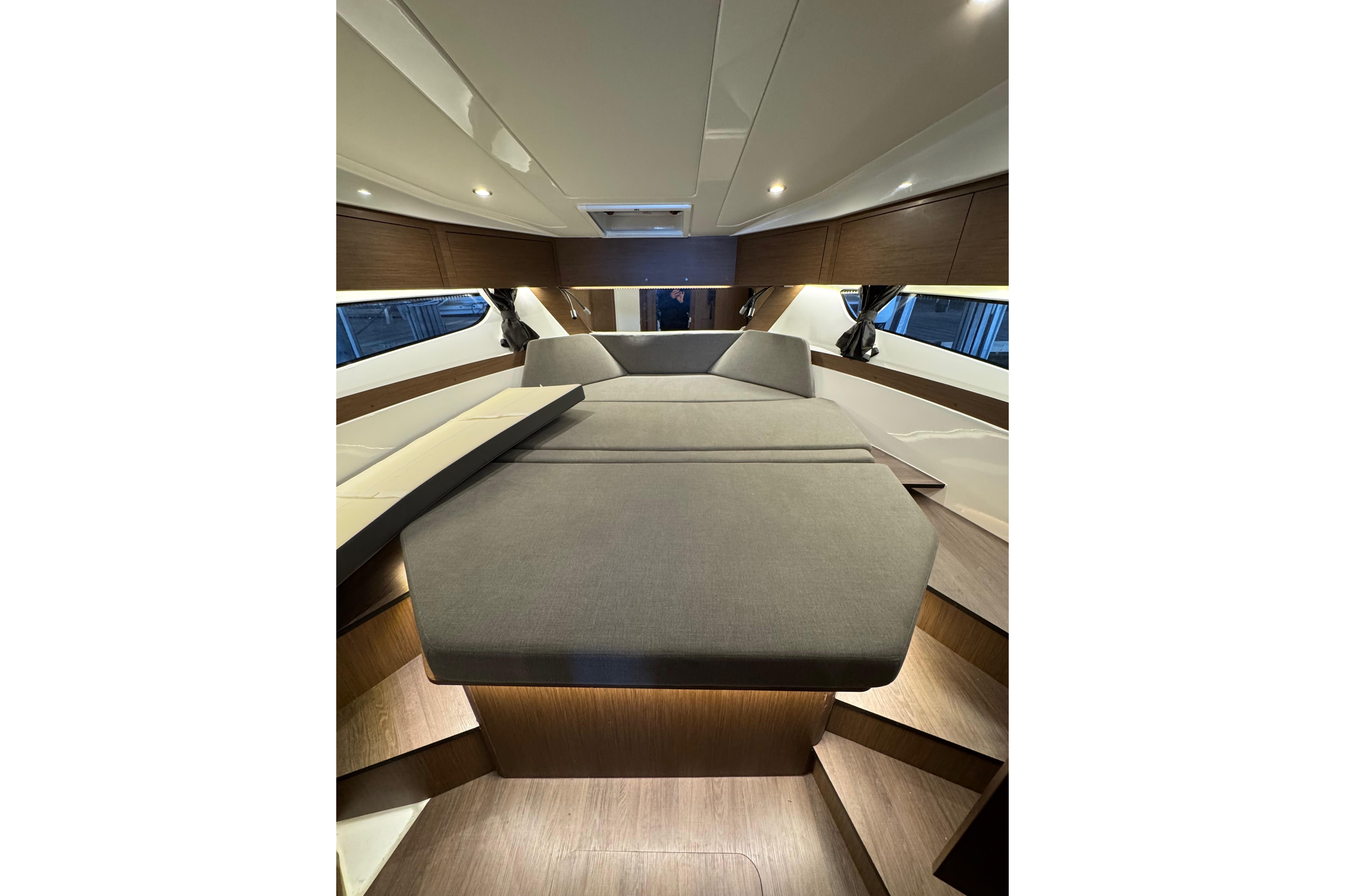 The Antares 11 Fly is also equipped with Mercury Twin 300 V8 four stroke outboard motors with Joystick docking, zipwake auto trim tabs, bow thruster, Garmin 16" color multi function display chart/radar, Starlink 18x, Garmin VHF Radio, remote spotlight, Mercury diagnostic display, lower helm station side door access to deck, triple sliding aft cockpit door, aft cockpit L-Shaped vinyl seating, hydraulic platform, bridge vinyl seating with table, forward vinyl sunpad lounges, lower station windshield wipers, blue LED underwater lights, Dometic A/C - Heating 28,000 BTU, Fischer Panda diesel generator, master stateroom with full head and separate shower, closet storage, VIP Guest Stateroom, stamoid seating and table covers for cockpit, bridge and forward sunpads, galley with refrigerator / freezer, 2 burner stove, sink, storage cabinets, and seating with expandable table.