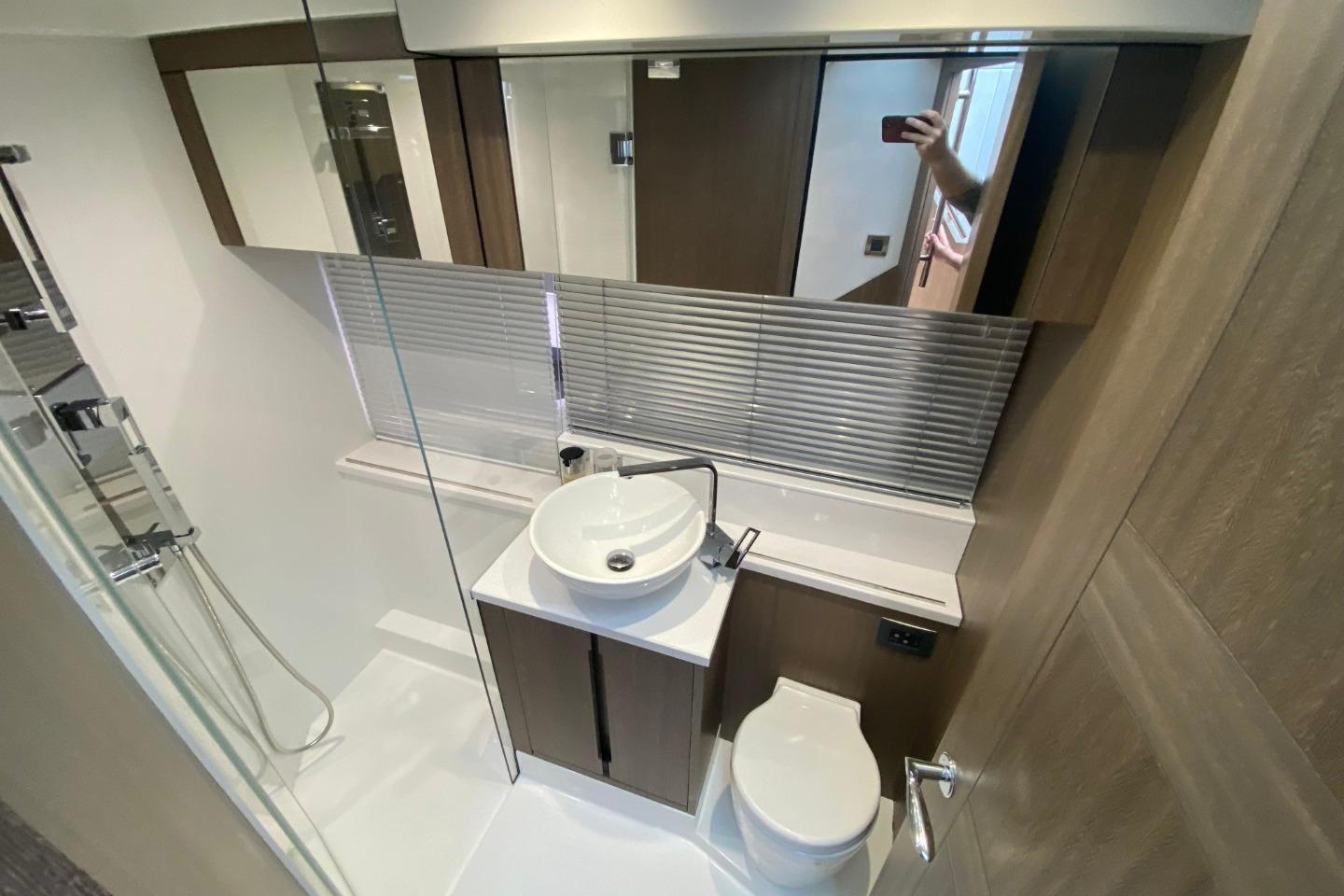 The main deck is fitted with a galley, dinette and plenty of storage areas to stow away items. The optional Beach Mode allows to drop down both sides and create a vast area near the cockpit, perfect for entertaining guests. Three different cockpit solutions are available, including the popular roto-seat option. Bow area can be fitted with an automatic settee for even more convenience outside. Down below three cabins and two bathrooms await the guests. The guest cabins offer a double in the bow area, and bunk beds starboard side. The owner’s cabin is located midship with an ensuite bathroom for extra privacy.
