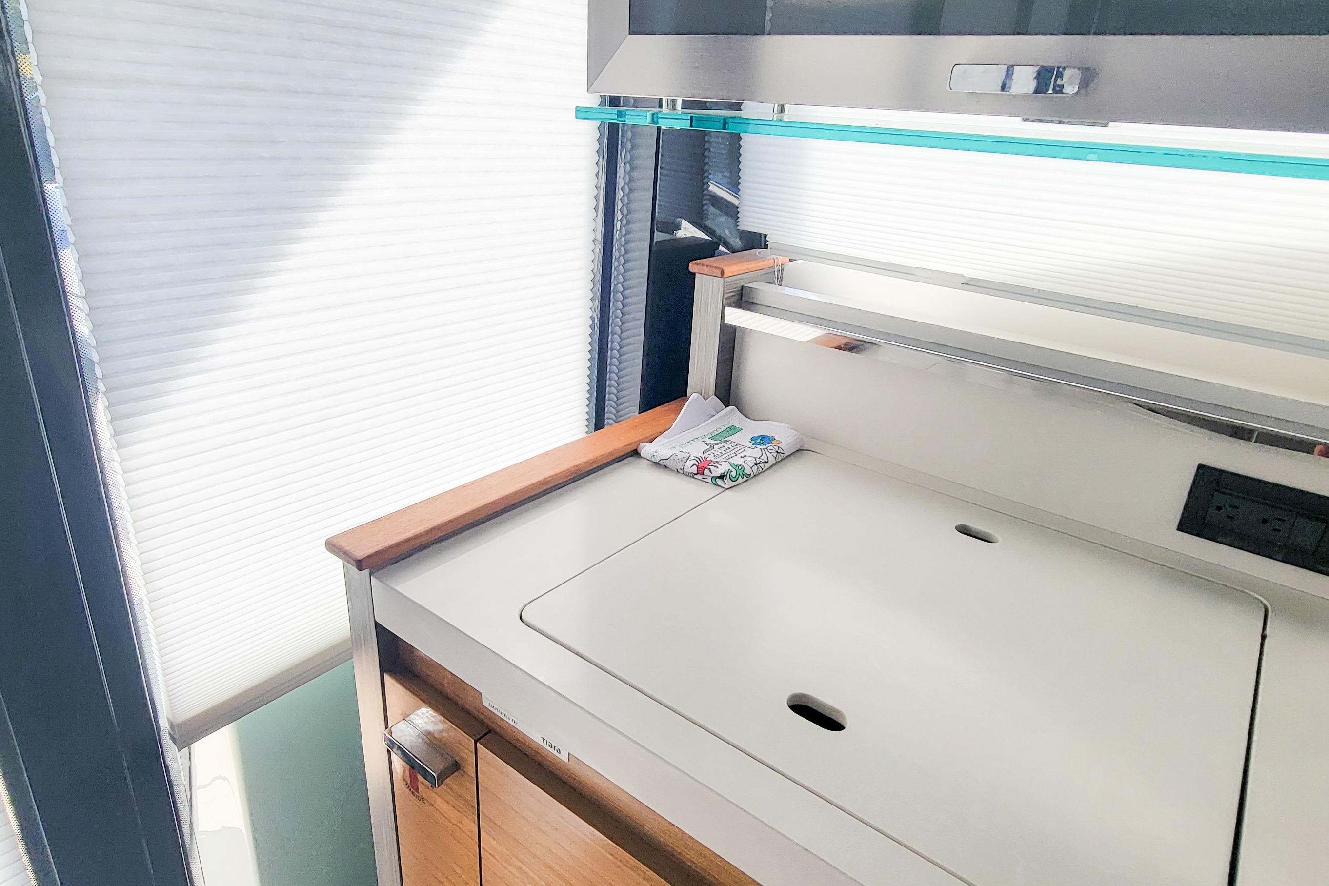 Step inside and you are greeted by Tiara’s signature one-level salon and helm design, where panoramic windows flood the interior with natural light and dissolve the boundary between indoors and out. Sightlines from the helm are commanding and unobstructed, creating a sense of control and ease whether underway or at anchor. The salon is both elegant and practical — a space designed for long conversations, shared meals, and unhurried evenings on the water.