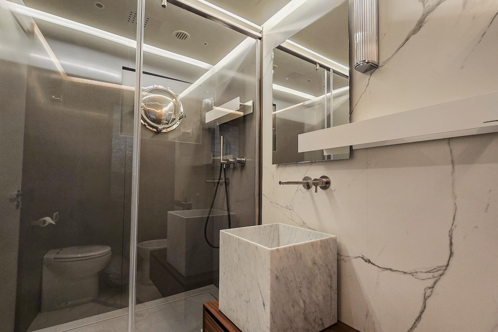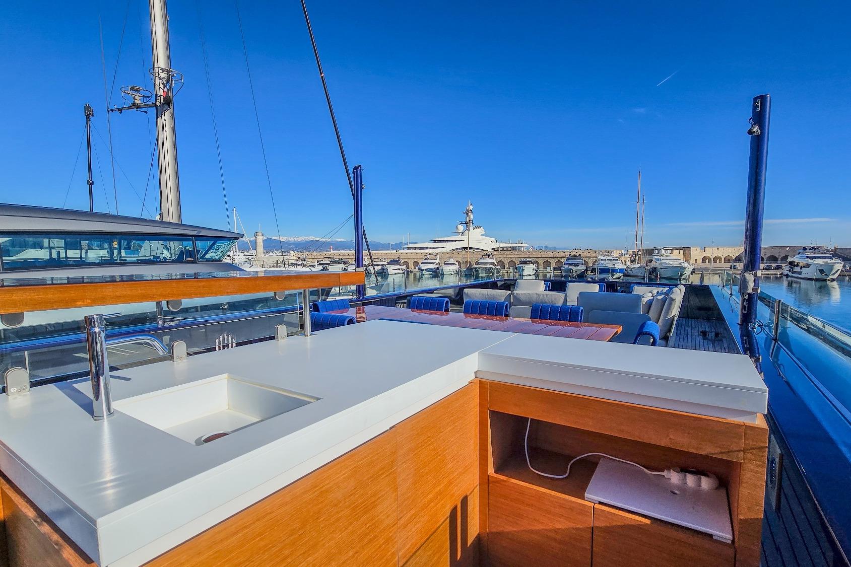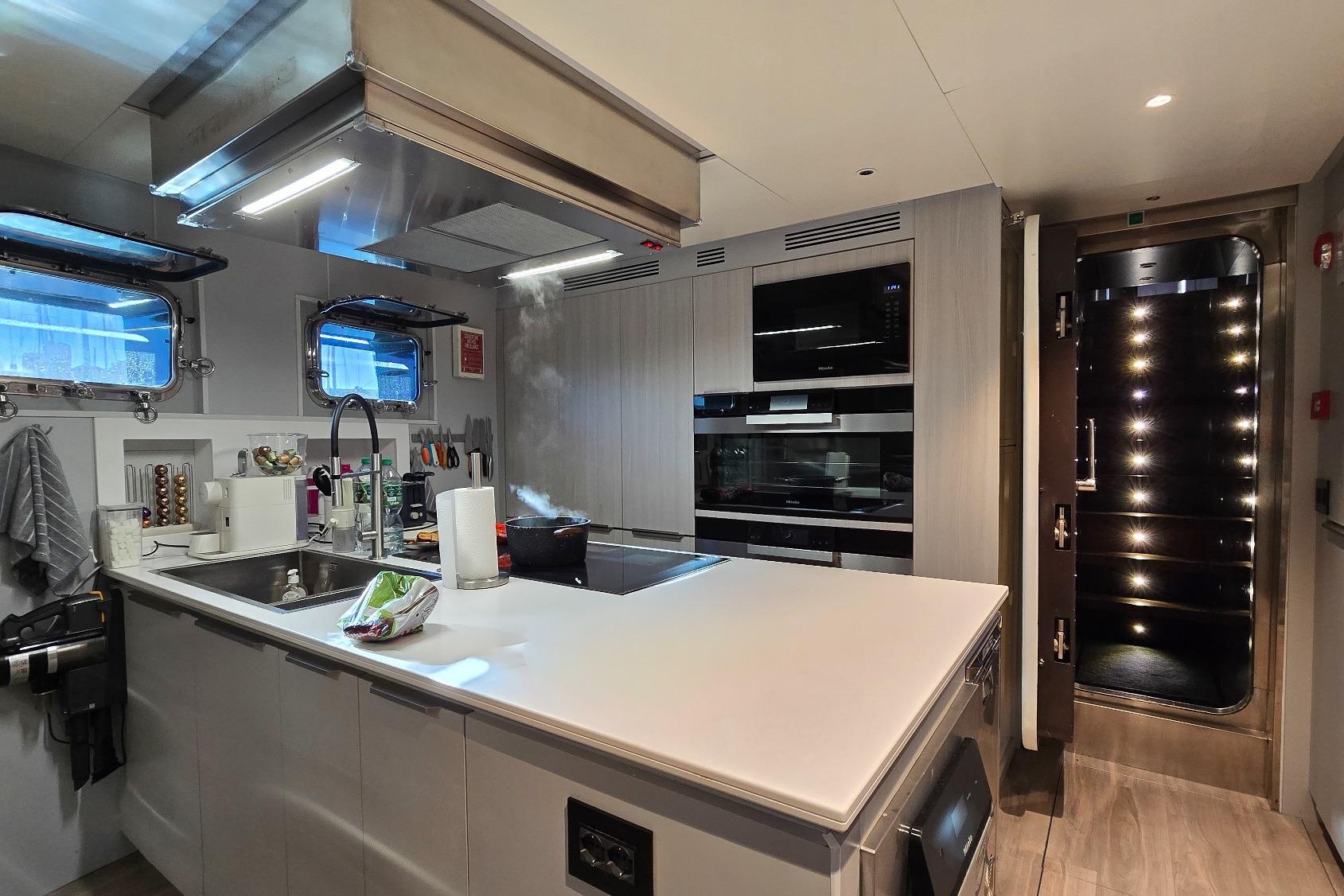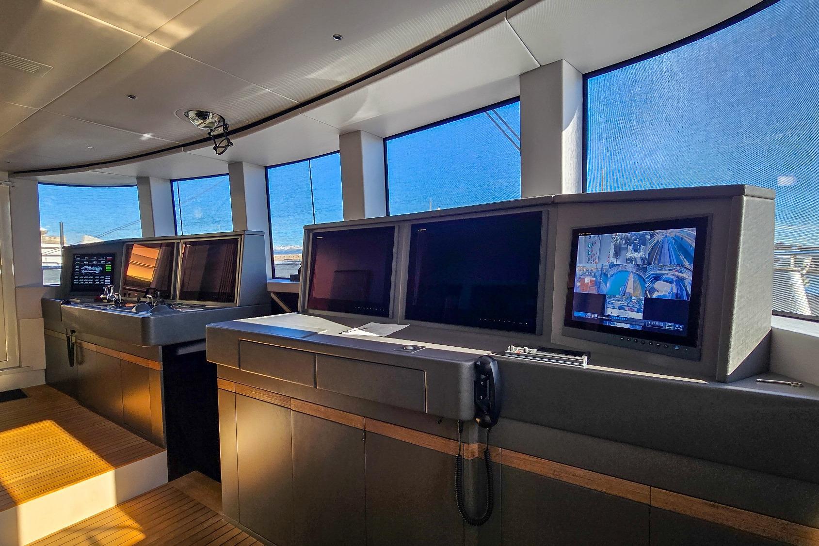 Her minimalist interior is now designed around open, light-filled spaces with 2.2-meter ceilings and a Scandinavian-inspired style. The refit also included the latest in navigation and audio/visual systems with iPad controls. The spacious saloon offers excellent visibility thanks to floor-to-ceiling glazed sides. Everything is in a minimalist trend with clean lines.