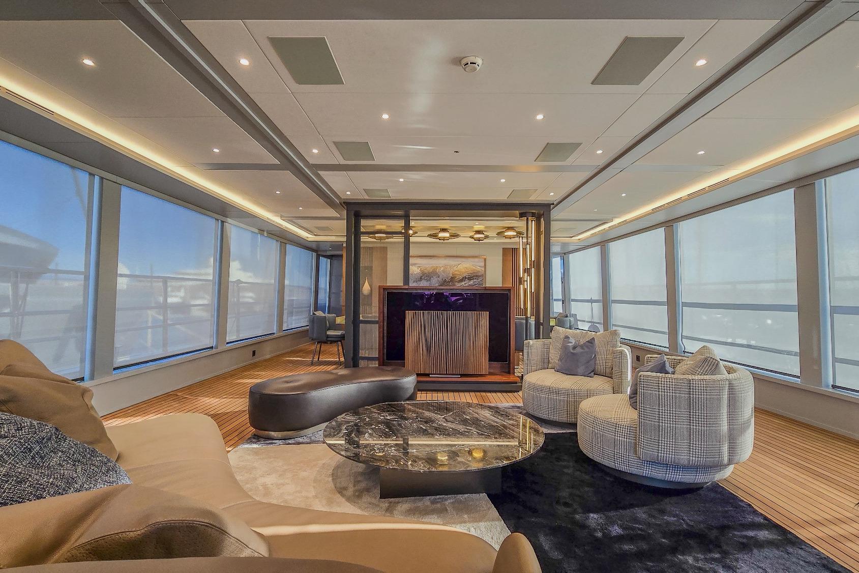 Her 1.6-meter draft allows easy cruising in shallow waters such as the Bahamas and Florida. This unique yacht features a wheelchair-friendly access, a large aft beach platform for sunbathing and water access, and a unique bow garage capable of storing a 7-meter tender along with additional toys. The yacht’s sundeck invites leisurely afternoons bathed in golden rays, with Paola Lenti furniture throughout the exterior.