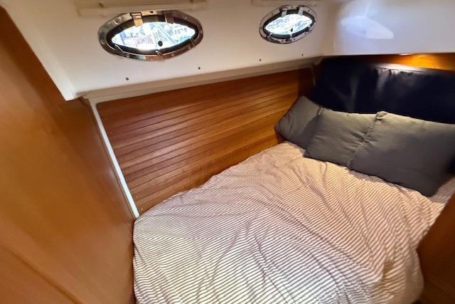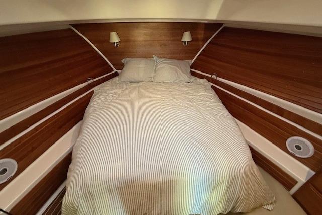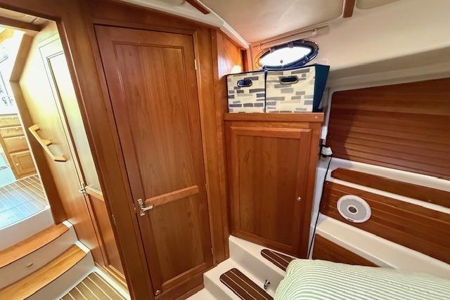 In the master stateroom there is an island berth for ease of egress, and for stowage of owner’s gear, there are many lockers and drawers provided. To starboard aft of the master is a full guest cabin with a pullman berth and ample storage capacity. Opposite and to port is a large head unit with separate stall shower.