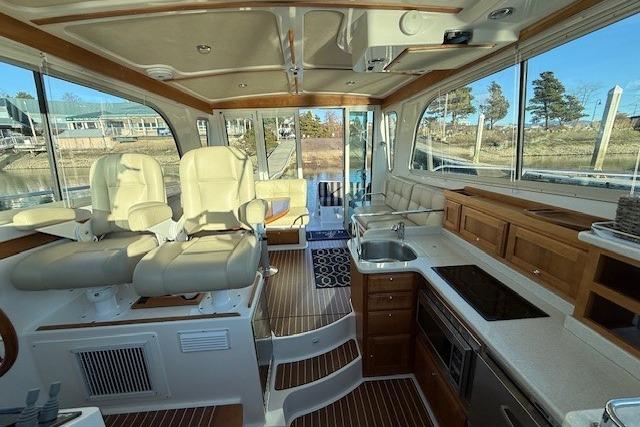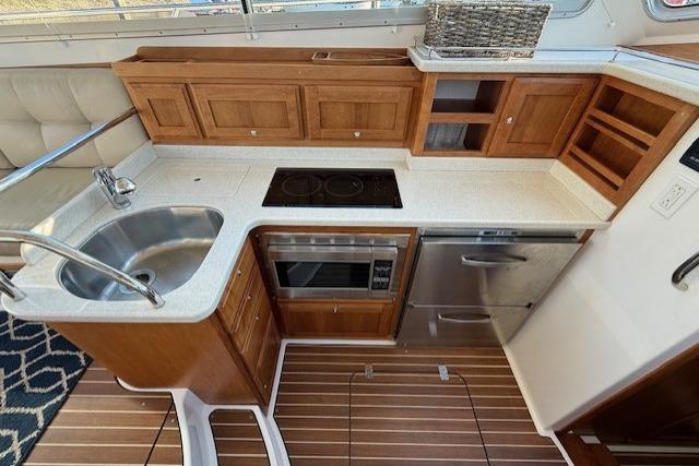 Between the lower and salon sole levels, the mid-galley is fully equipped with a refrigerator, freezer, microwave oven and deep stainless steel sink as well as many drawers and lockers for galley storage. Large windows overhead provide the galley with ample visibility and light.