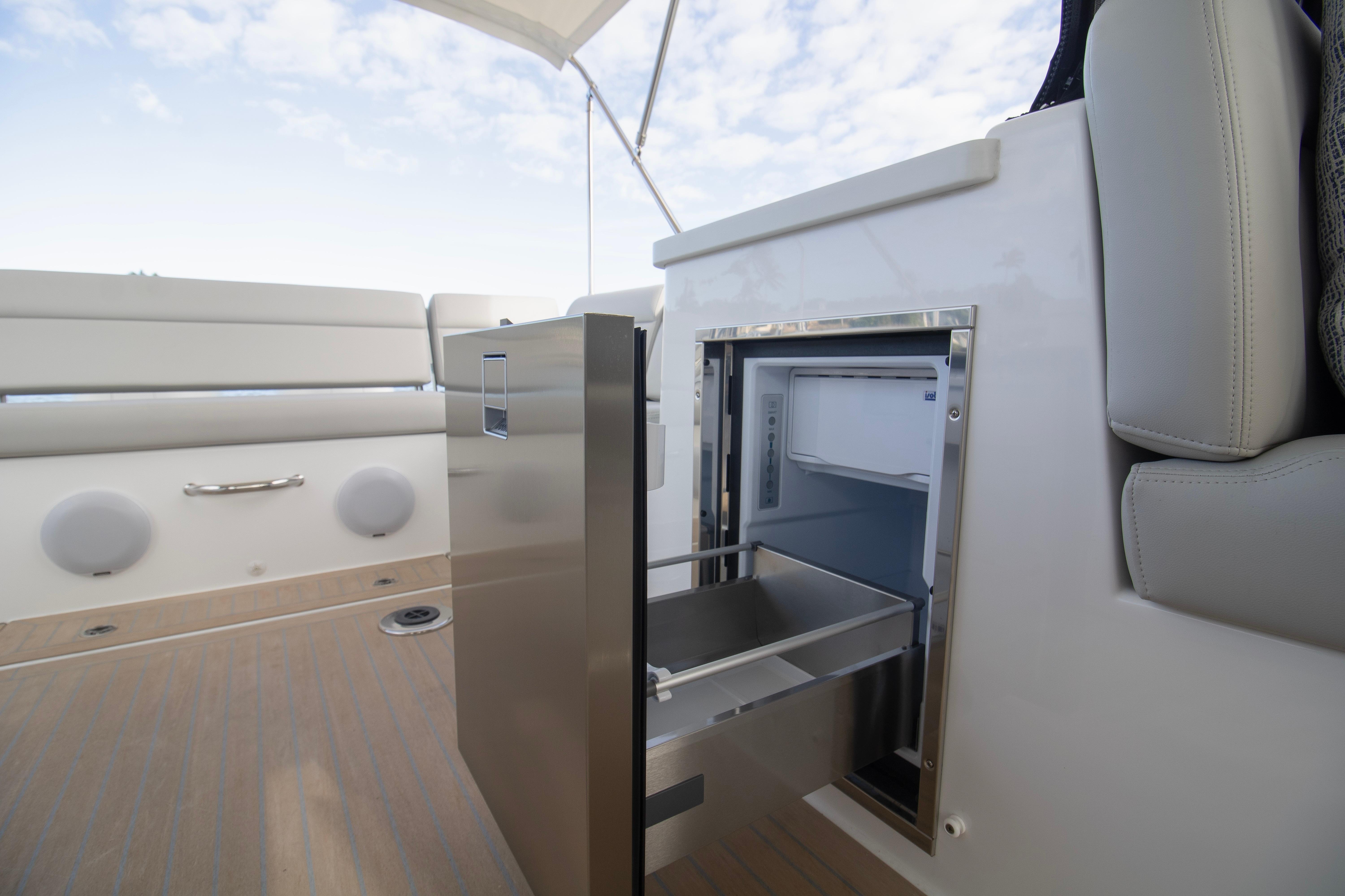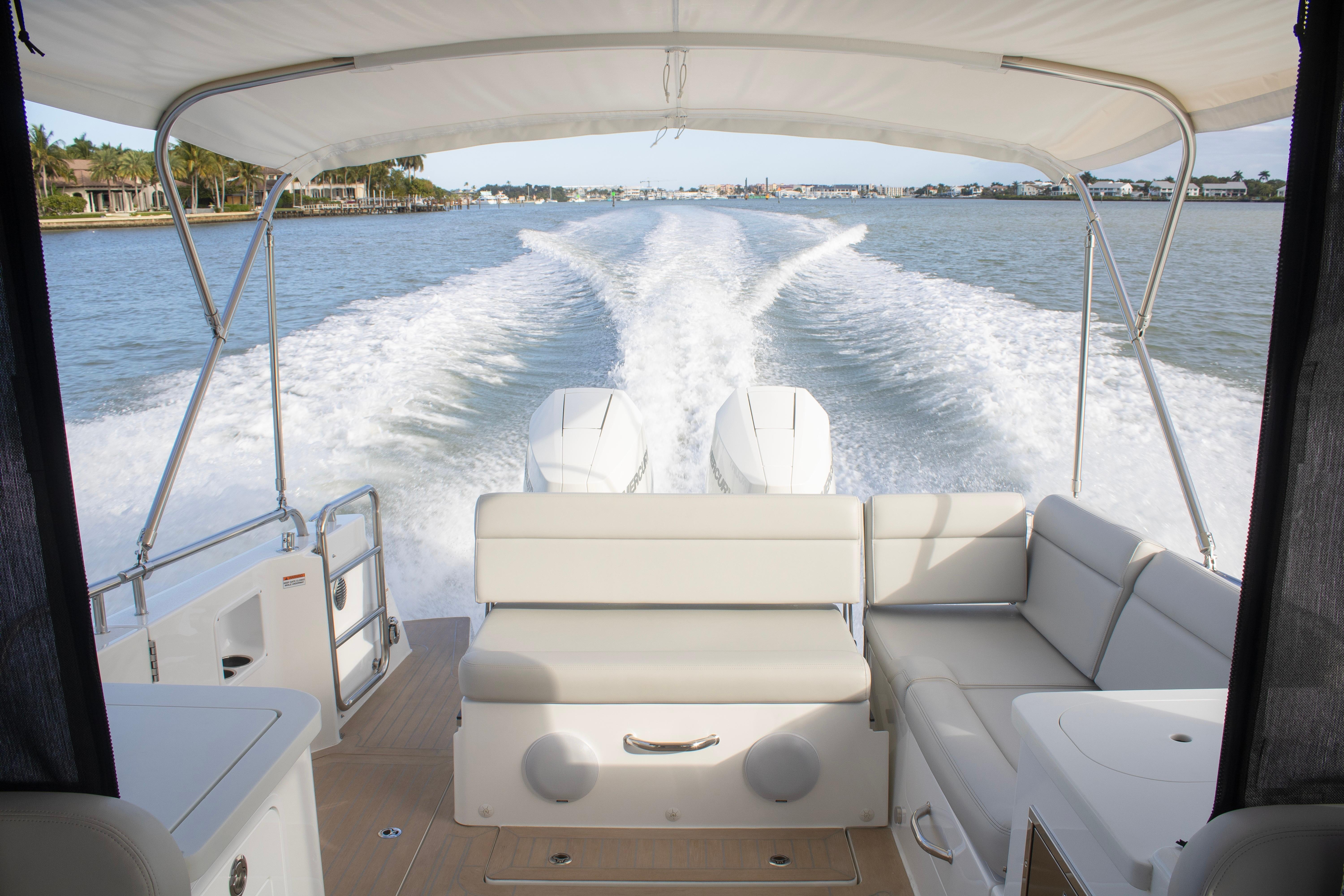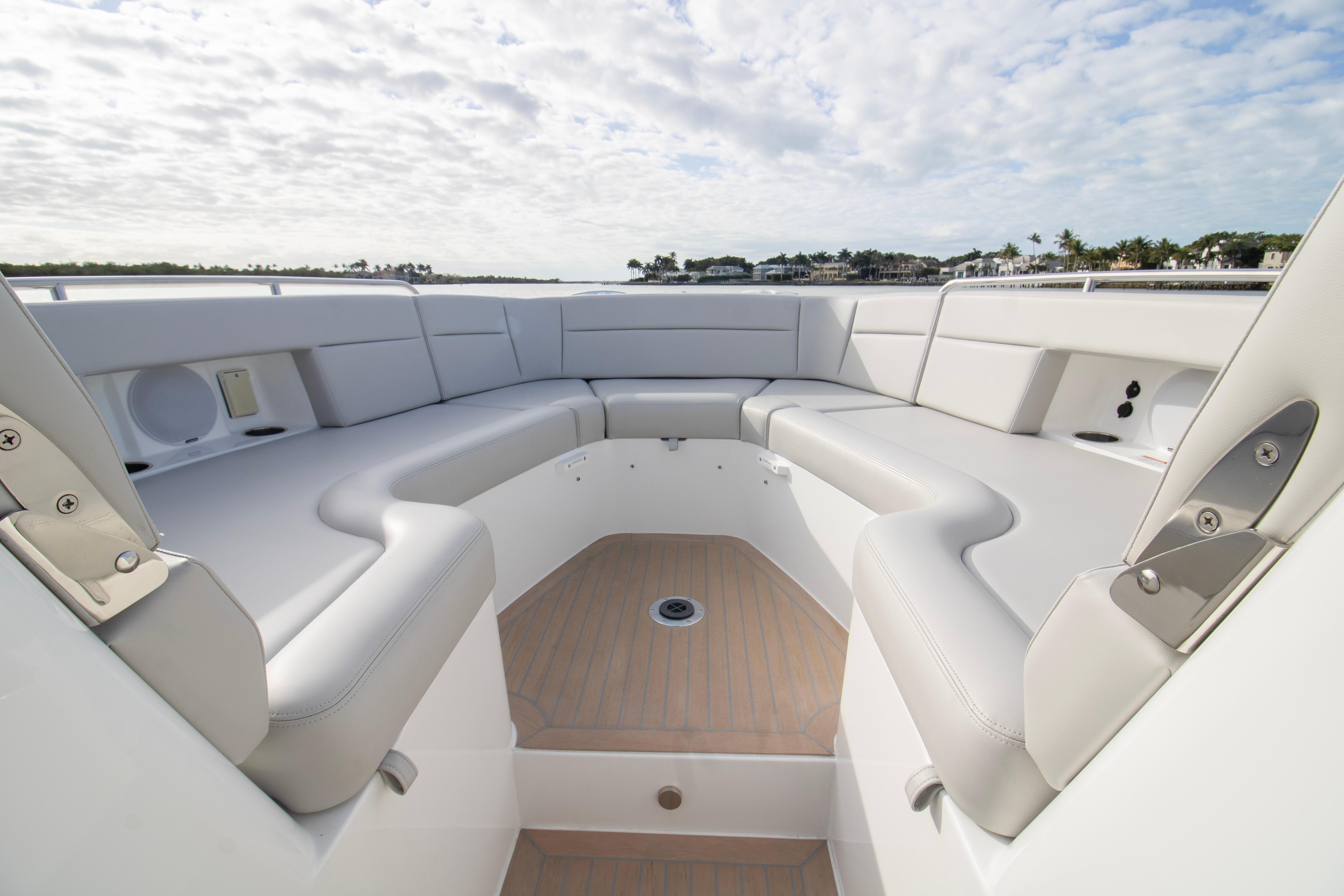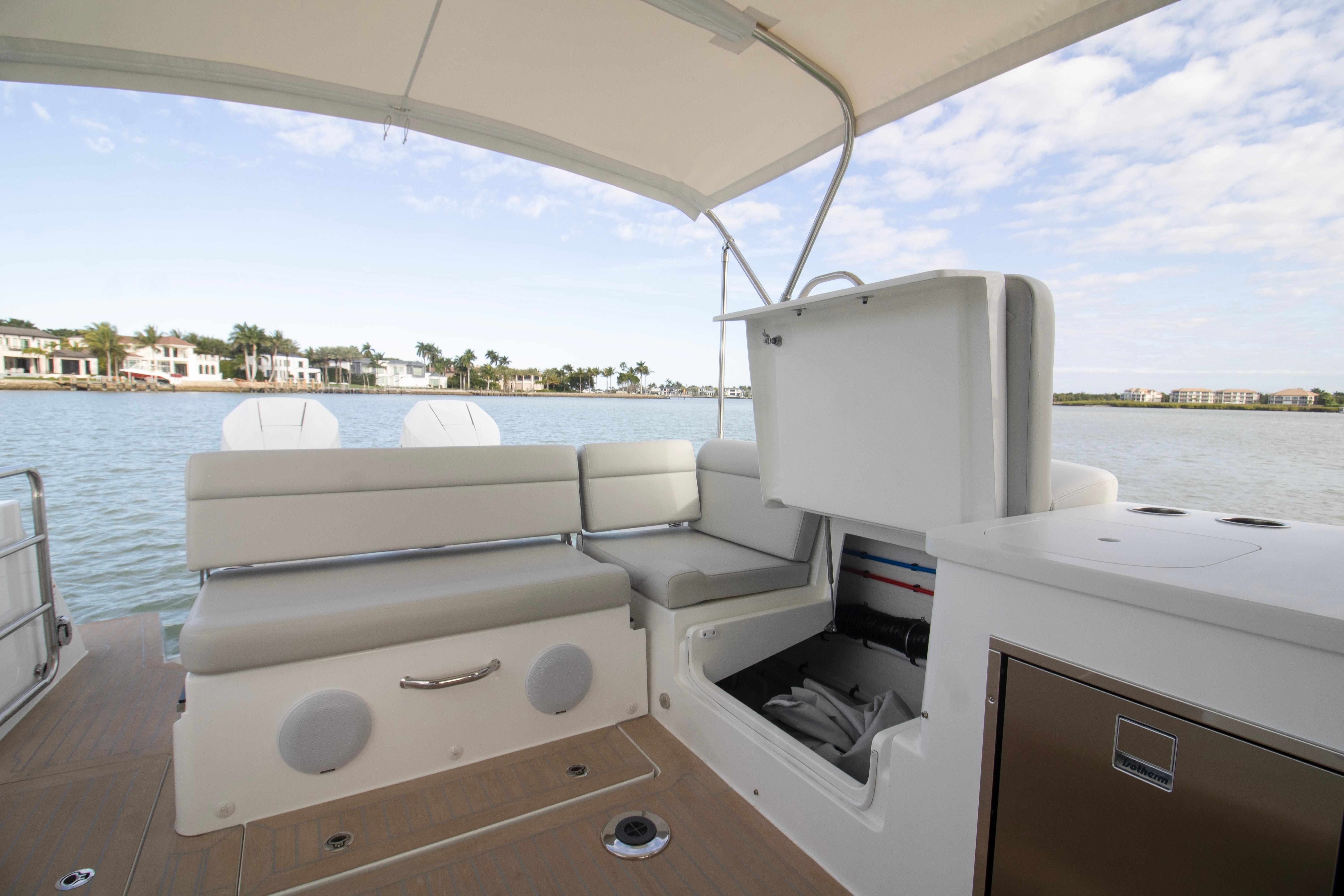 The spacious, open cockpit is ideal for entertaining or serious cruising, featuring seamless access to the water and flexible seating arrangements. Wide, flush decks and thoughtful ergonomics make moving about the boat safe and effortless. At the helm, expect outstanding visibility, intuitive controls, and a refined driving experience whether running offshore or cruising the harbor.