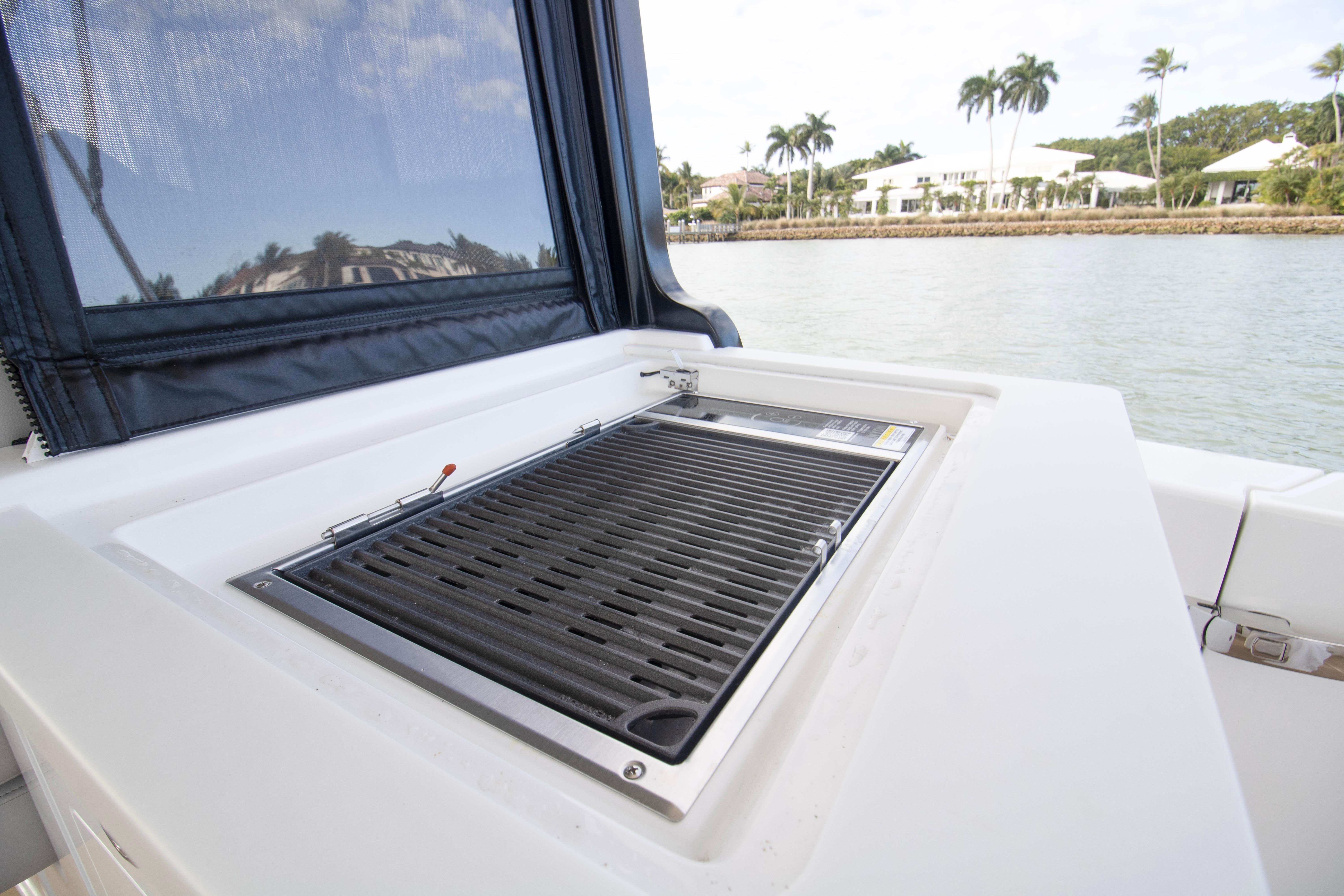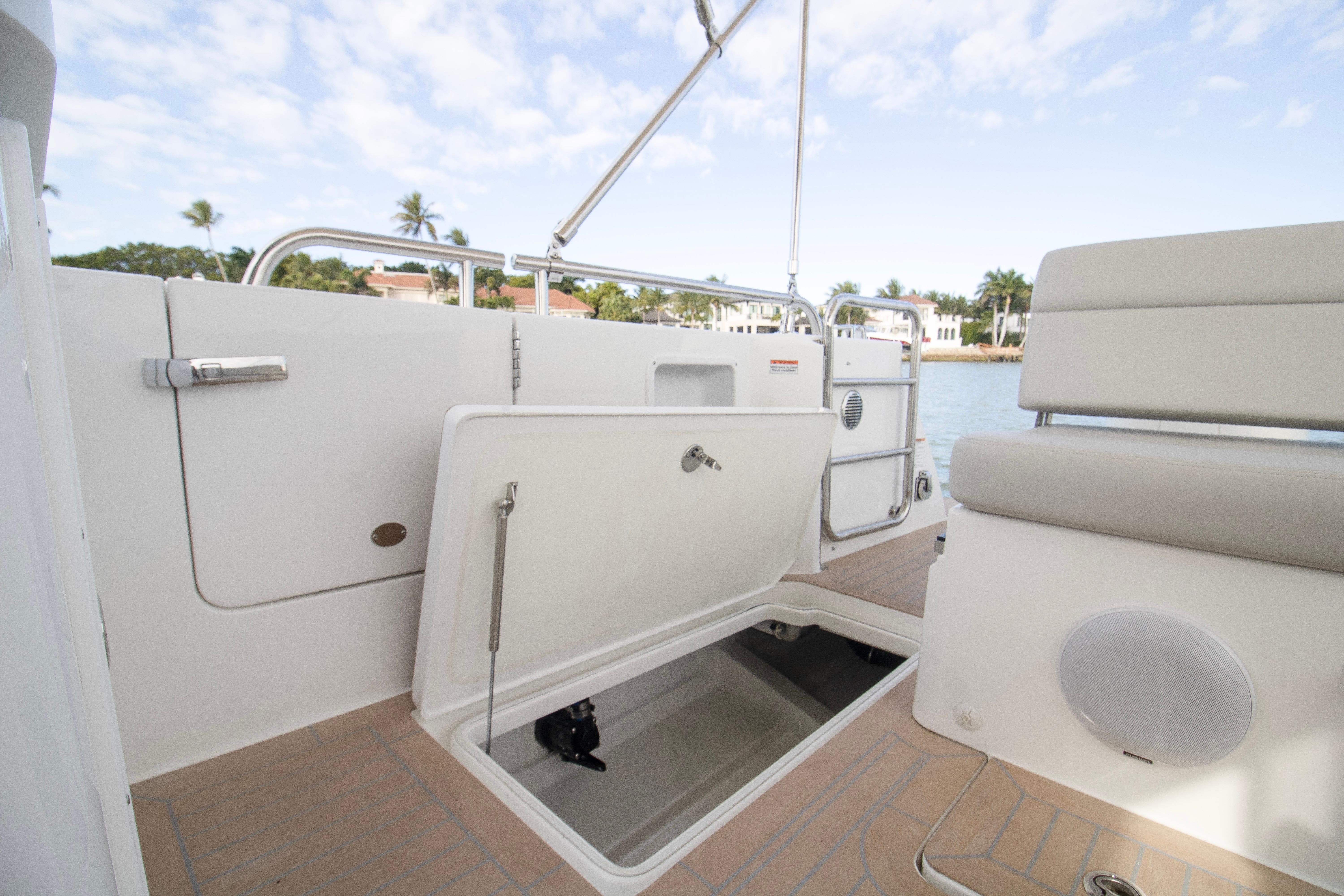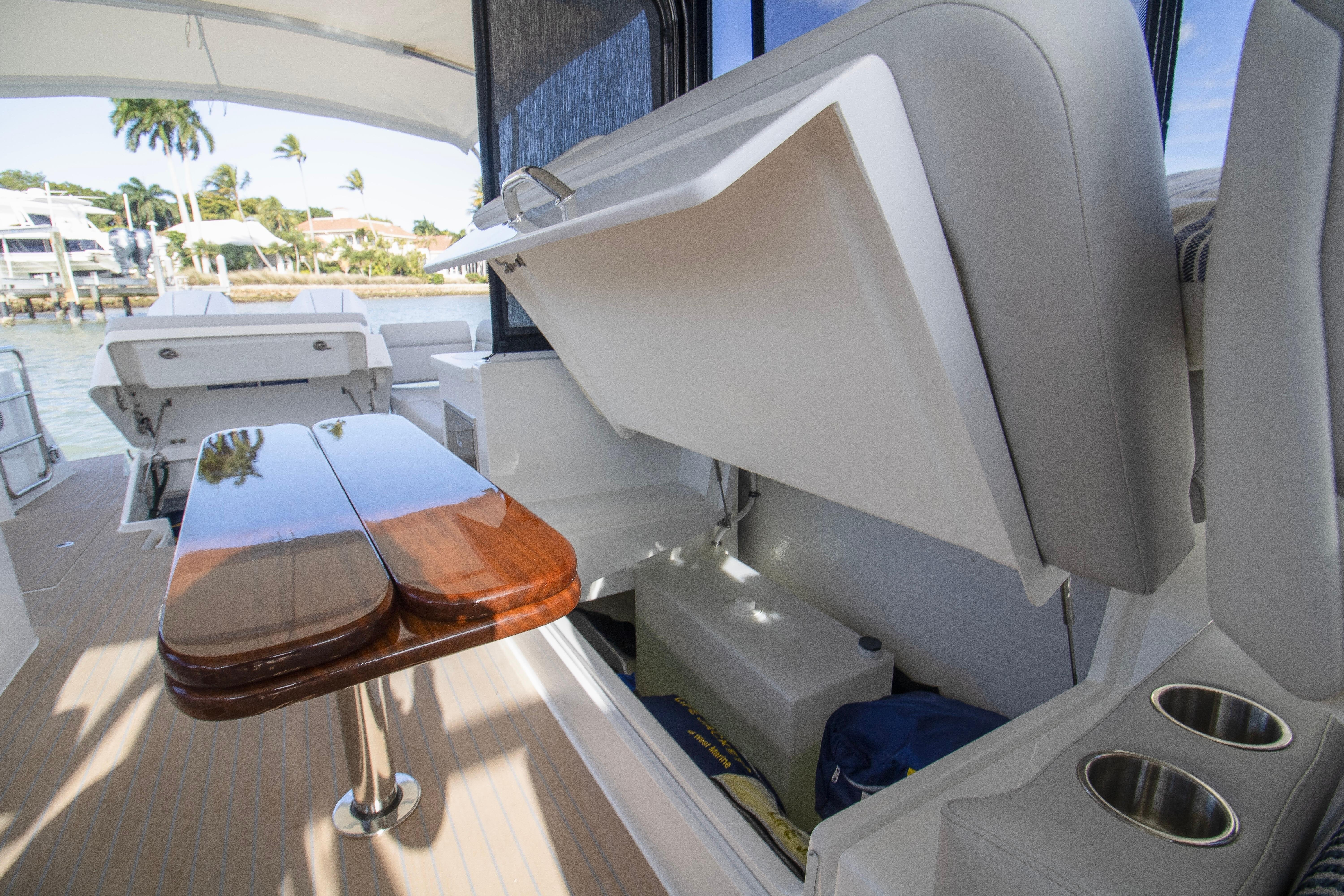 The spacious, open cockpit is ideal for entertaining or serious cruising, featuring seamless access to the water and flexible seating arrangements. Wide, flush decks and thoughtful ergonomics make moving about the boat safe and effortless. At the helm, expect outstanding visibility, intuitive controls, and a refined driving experience whether running offshore or cruising the harbor.