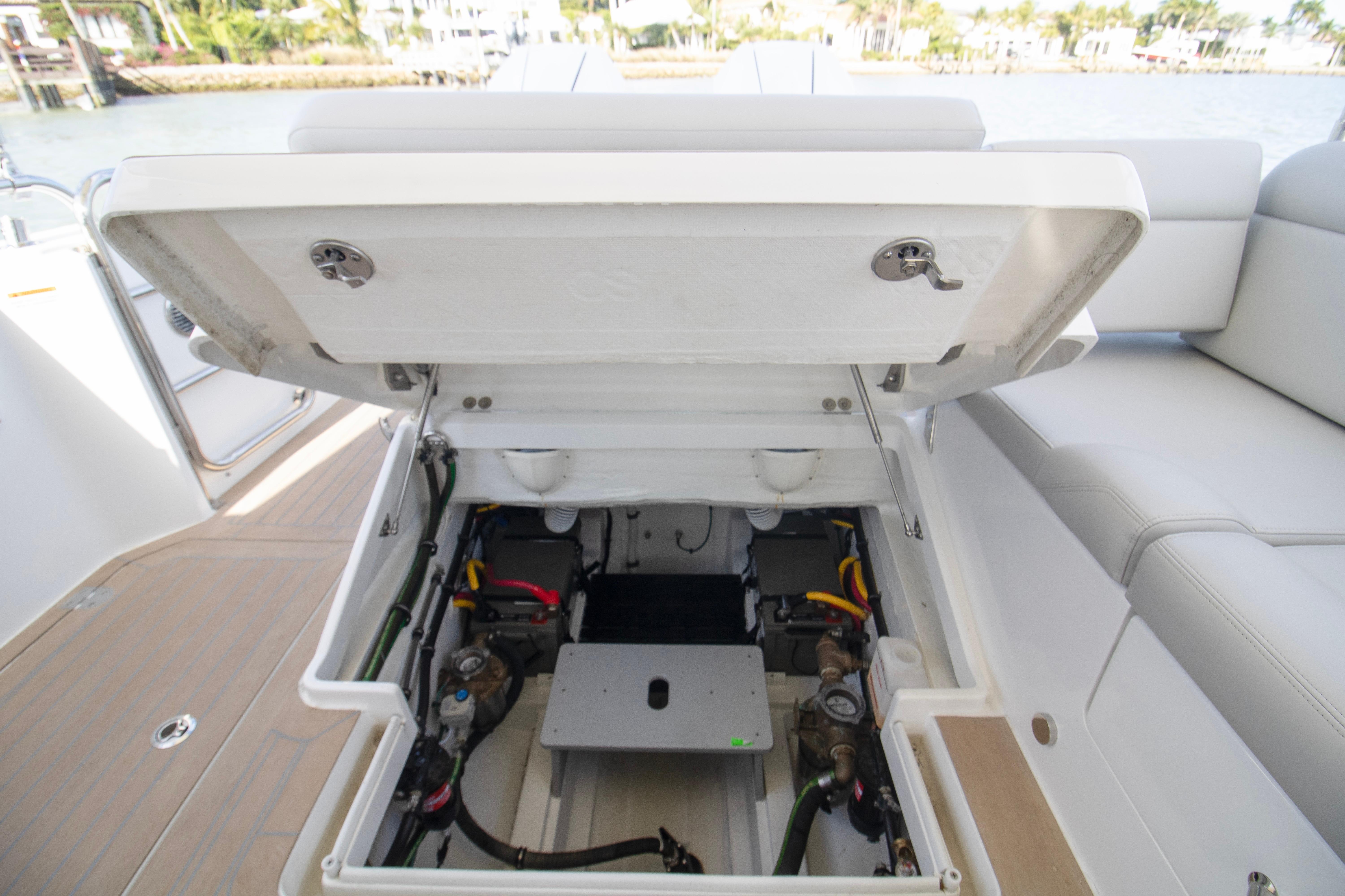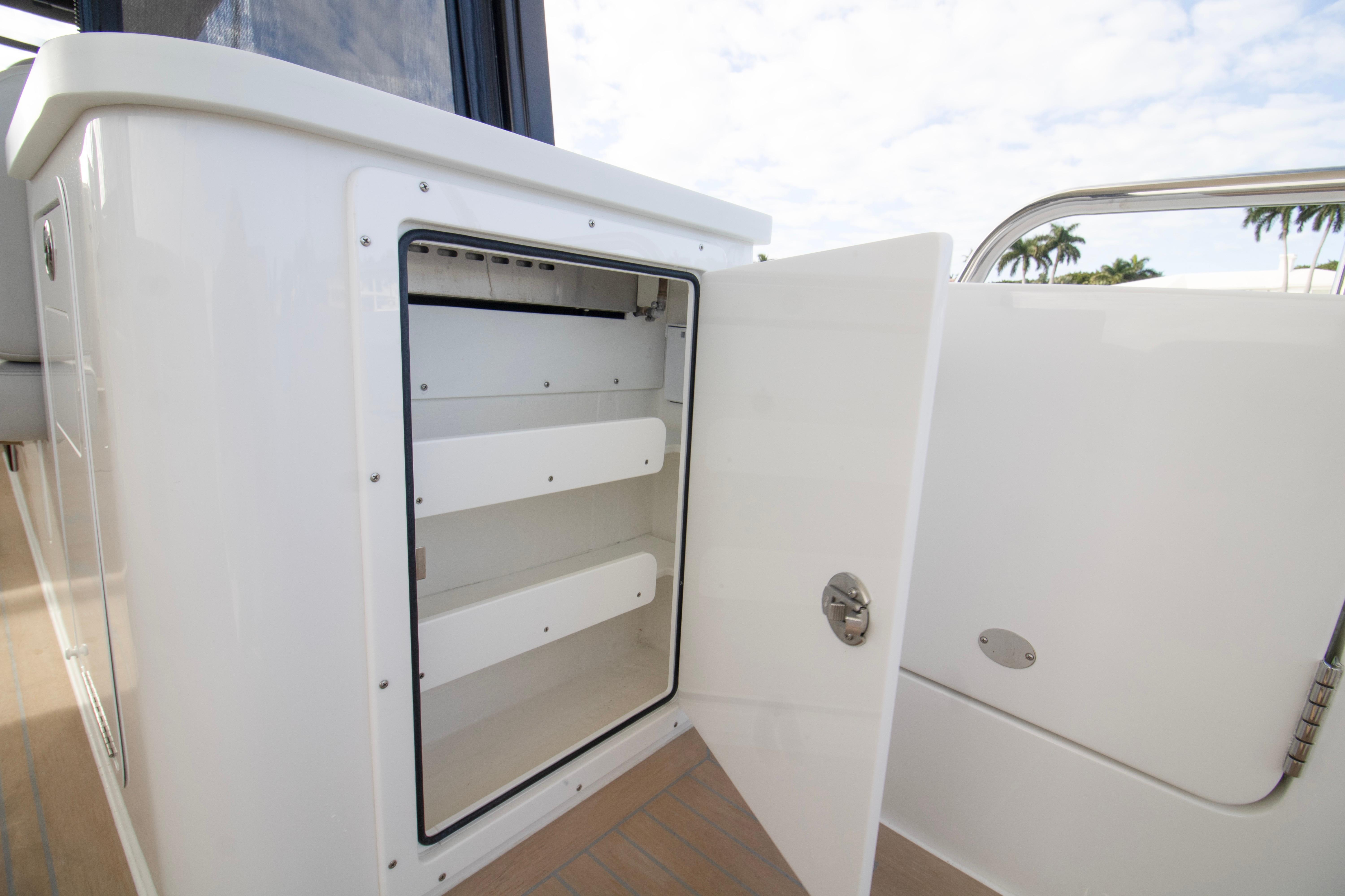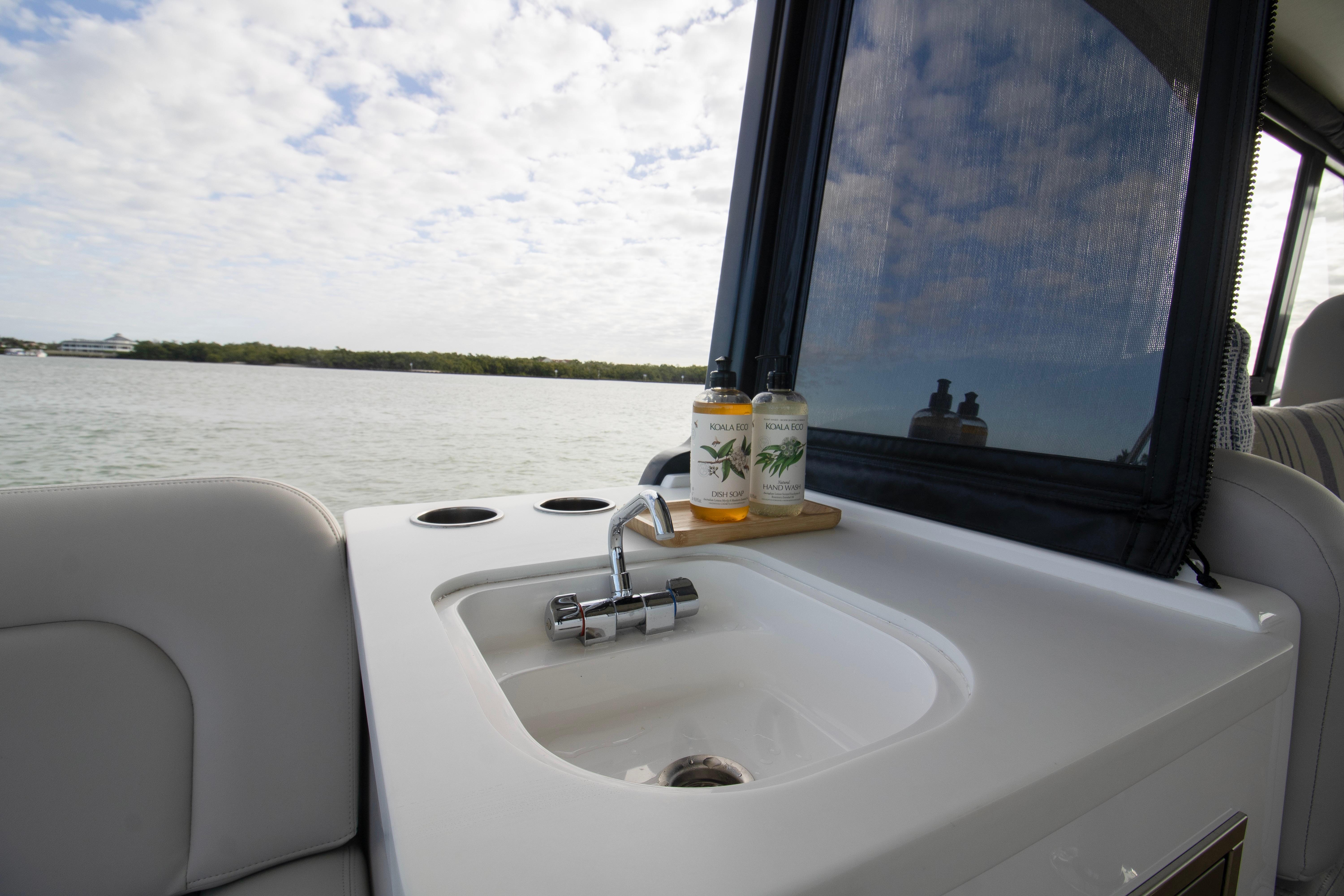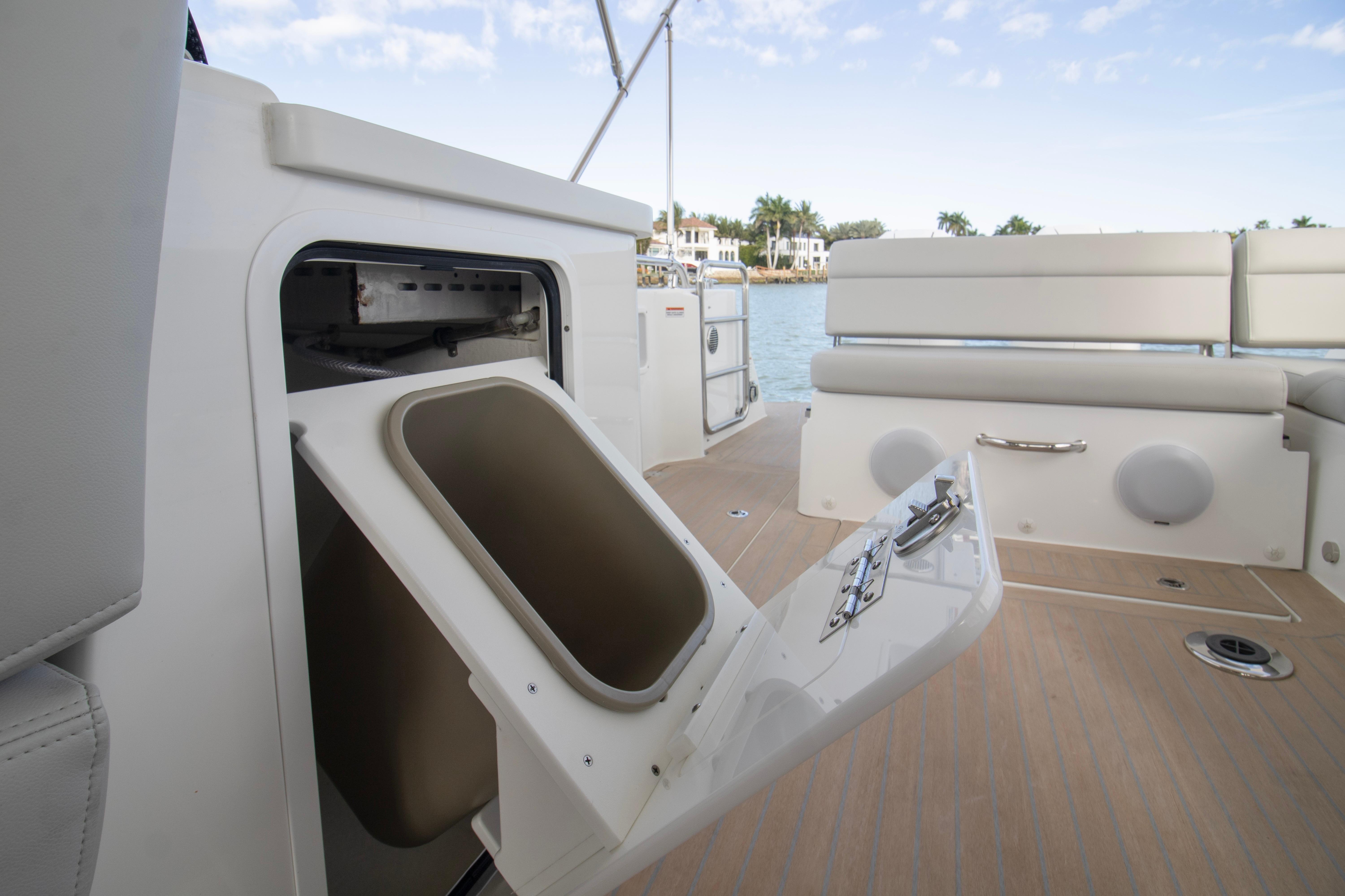 The spacious, open cockpit is ideal for entertaining or serious cruising, featuring seamless access to the water and flexible seating arrangements. Wide, flush decks and thoughtful ergonomics make moving about the boat safe and effortless. At the helm, expect outstanding visibility, intuitive controls, and a refined driving experience whether running offshore or cruising the harbor.