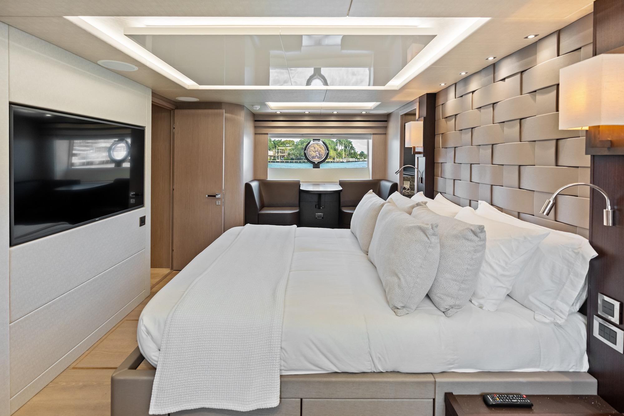 The main salon is bright and open, surrounded by large windows that flood the space with natural light enhancing the warm European oak finishes and plush seating arrangements. Seating to port and starboard accommodates up to ten guests with two large sofas creating an inviting and comfortable space for relaxation or social gatherings. A 55” Samsung TV on a hi/lo lift is integrated into the central partition seamlessly separating the salon from the dining area. Forward, the dining table seats eight guests and is supported by a port side service area with refrigeration and stemware storage.