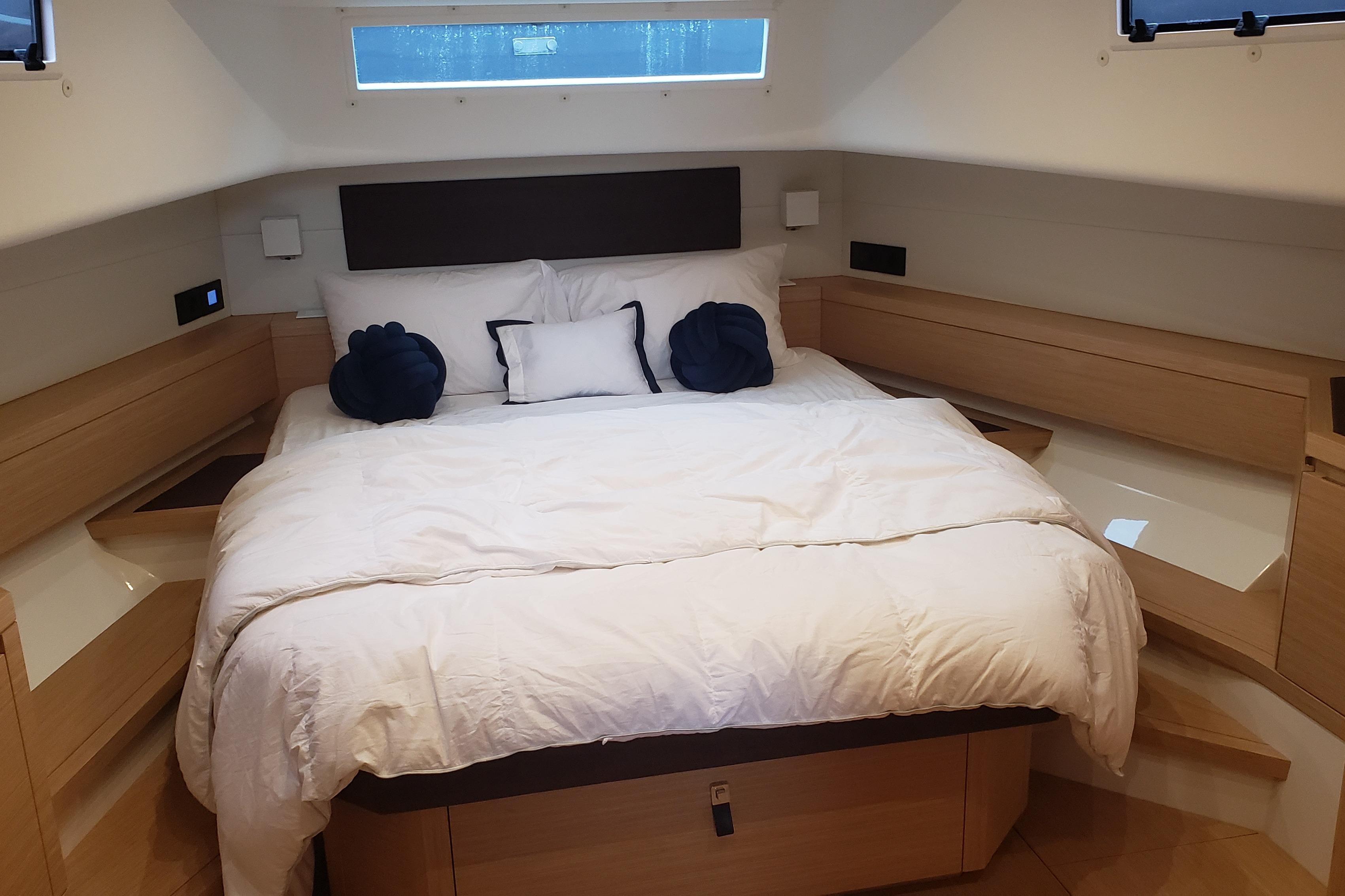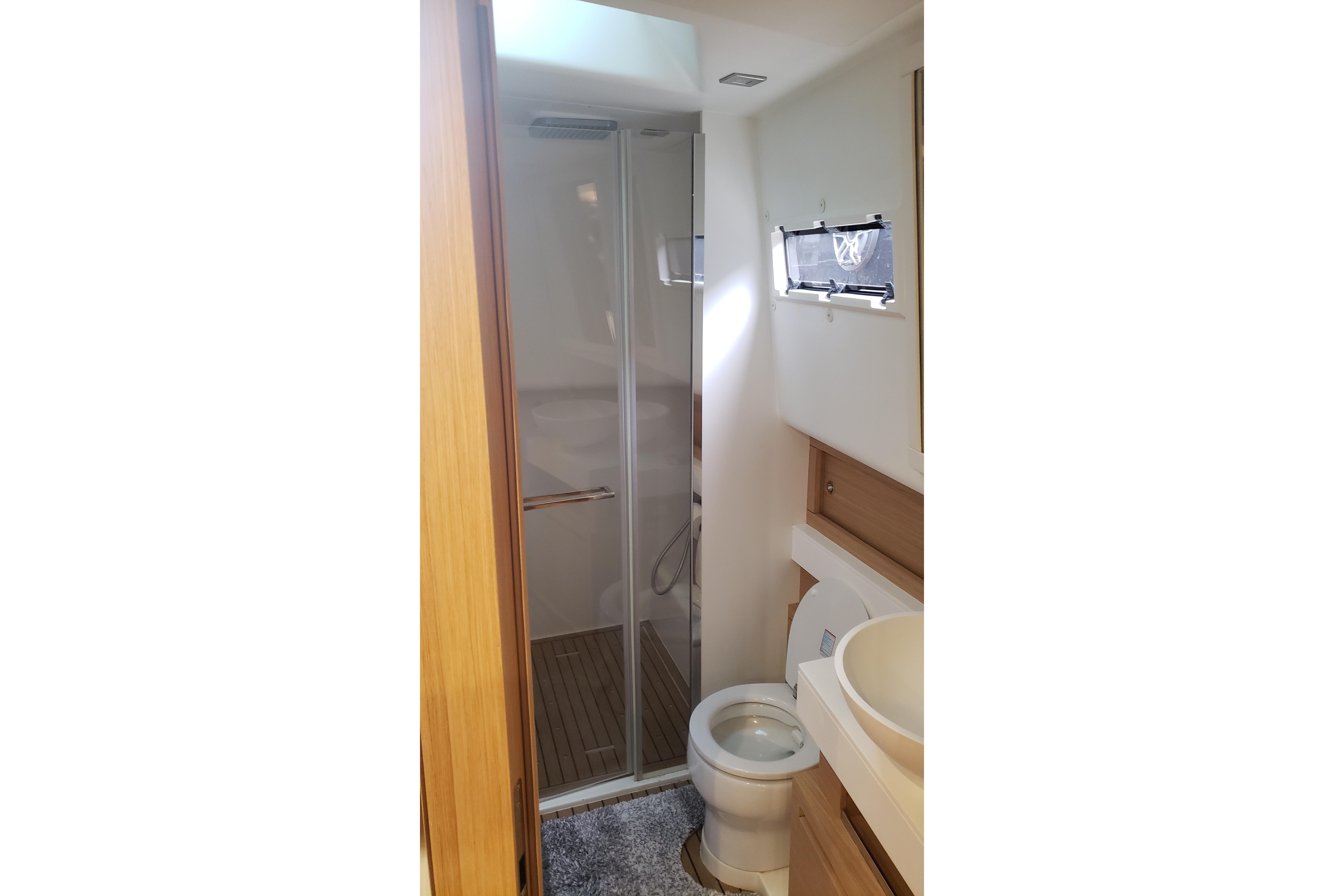 Moving forward to the master, there is a queen island berth with a drawer beneath and an opening hatch overhead Opening portholes are located to port and stbd and a fixed portlight is on the forward bulkhead with wall mounted lamps on each side. A hanging locker is located to stbd and just aft is a Samsung TV on a tilt bracket. with a cabinet with shelves beneath. To port there are drawers and cabinets containing dish and silverware and microwave. Aft to port again is access to the ensuite master head.