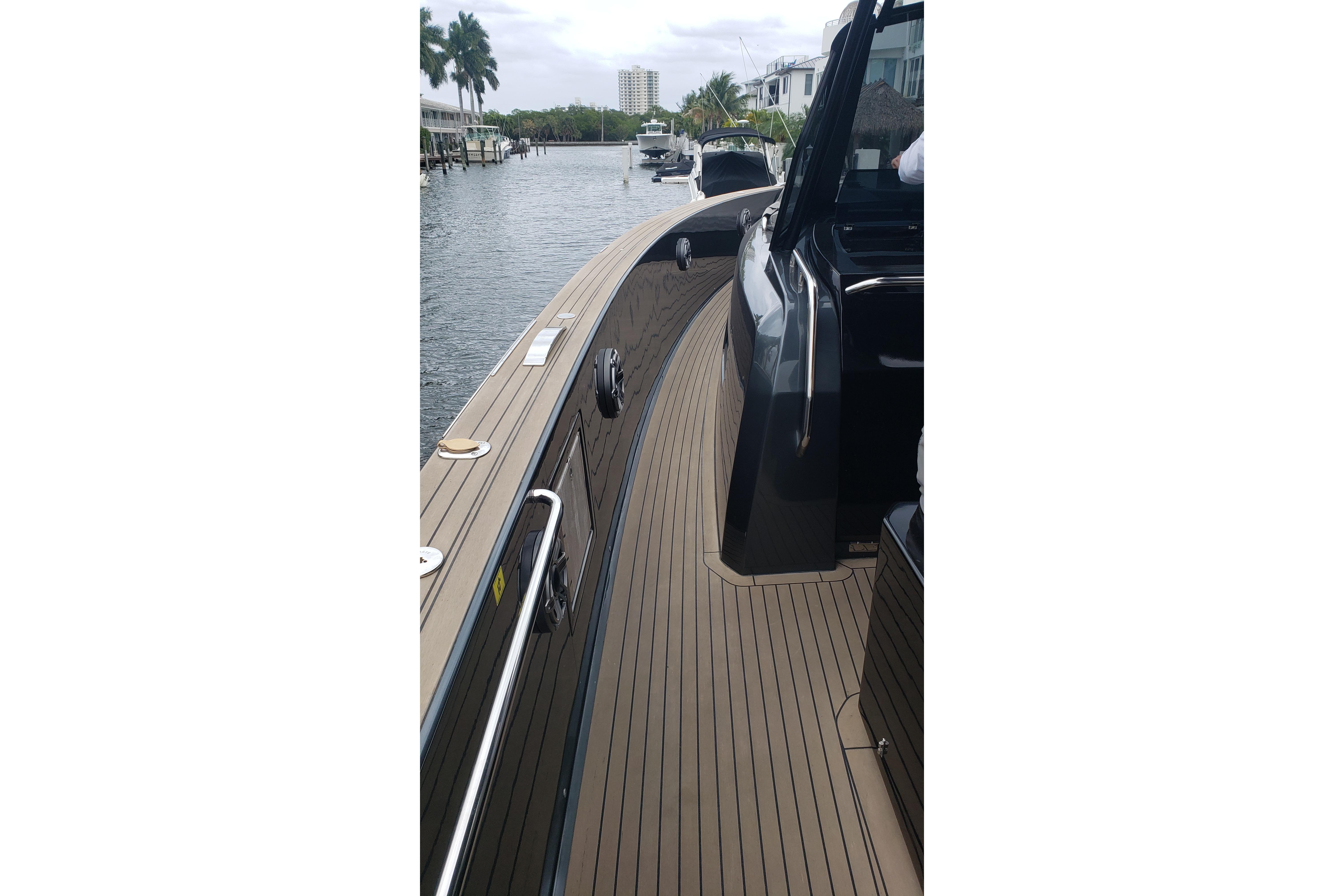 Moving up two steps to stbd there is a handheld deck shower in the bulwark as well as stainless air intakes on both sides. A pad with tilting head cushions is centrally located and a U-shaped settee located just forward of that with a high/low expandable teak table and refrigerated drawers on the port and stbd. sides and front faces. There is a custom upholstered pad to go over the table with 4 drink holders which can be used as an ottoman when in the down position. All decks are of synthetic teak and the hull and cabin house are painted in Grigio Grey. There are folding stainless gates forward of the stairs port and stbd and stainless grab rails running forward. Six JL Audio speakers are located in the bulwarks on port and stbd sides running up to the bow. Fuel, water, and waste deck fills are located on the port and stbd gunwales. LED courtesy lights are located at deck level and there are opening storage compartments in the gunwales on both sides. The hard top and radar are painted in black and the exterior is adorned with bright orange Hermes inspired diamond stitch upholstery. The aft end of the hardtop has an electric retractable sun awning in black fabric, and radar, FLIR camera, search light, running lights, horn, and nav antennas are located on top.