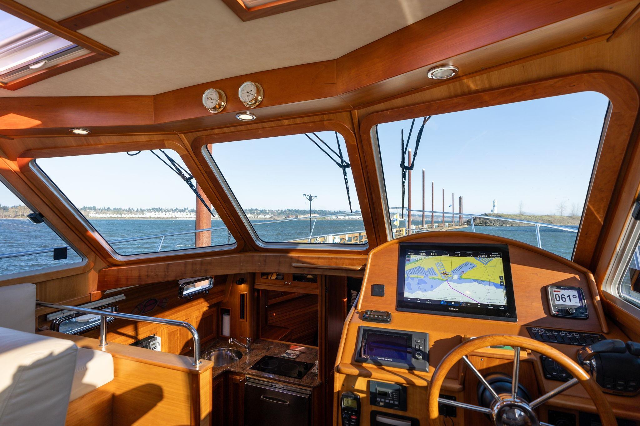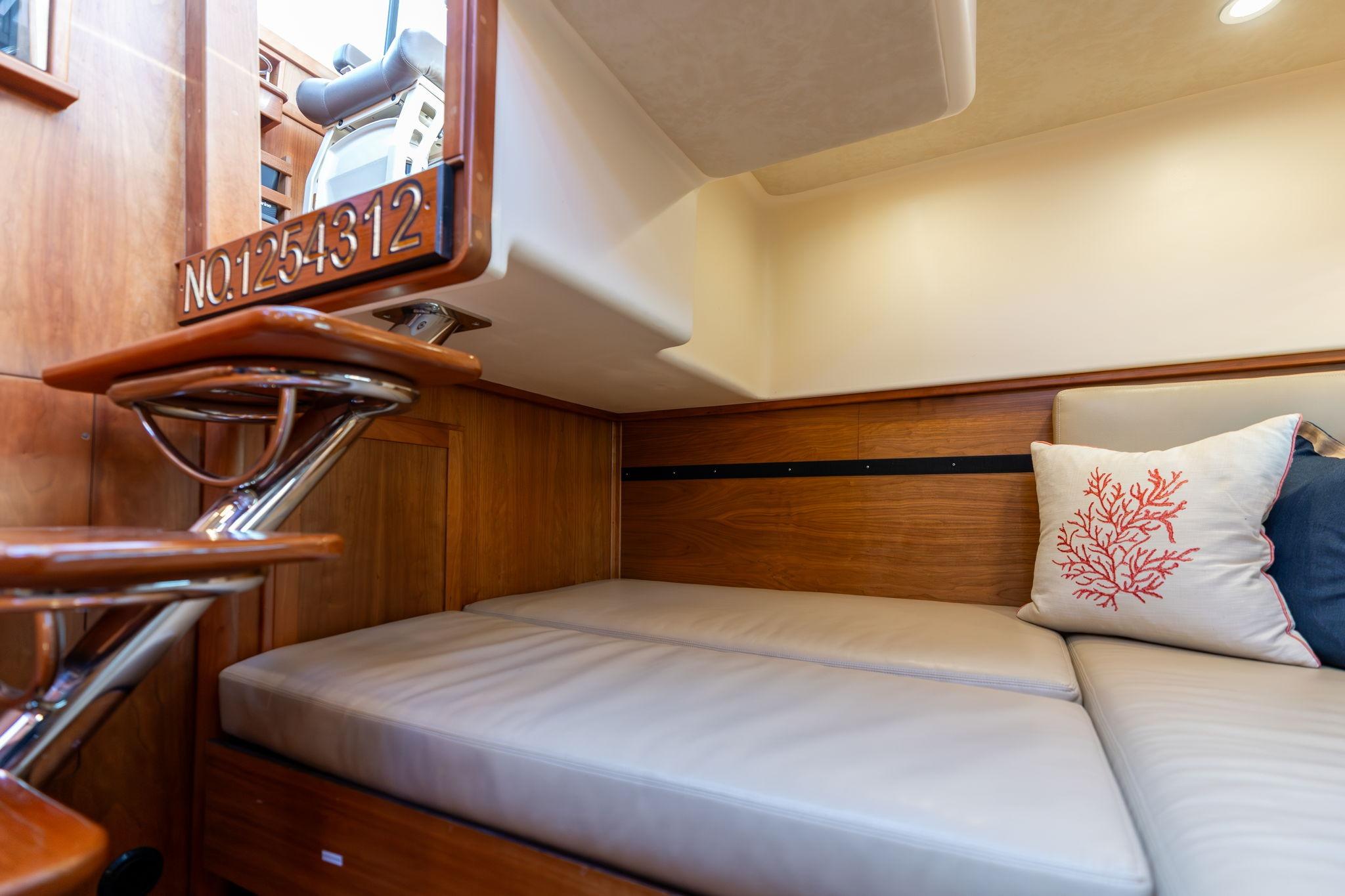 In her main salon a large, U-shaped settee with fold over table will seat up to three couples, while the forward end of the settee can be oriented forward to provide a comfortable perch when underway. To starboard, aft of the Stidd helm seat, is a long cabinet housing an LED television on an electric lift and storage compartments for the owners gear.