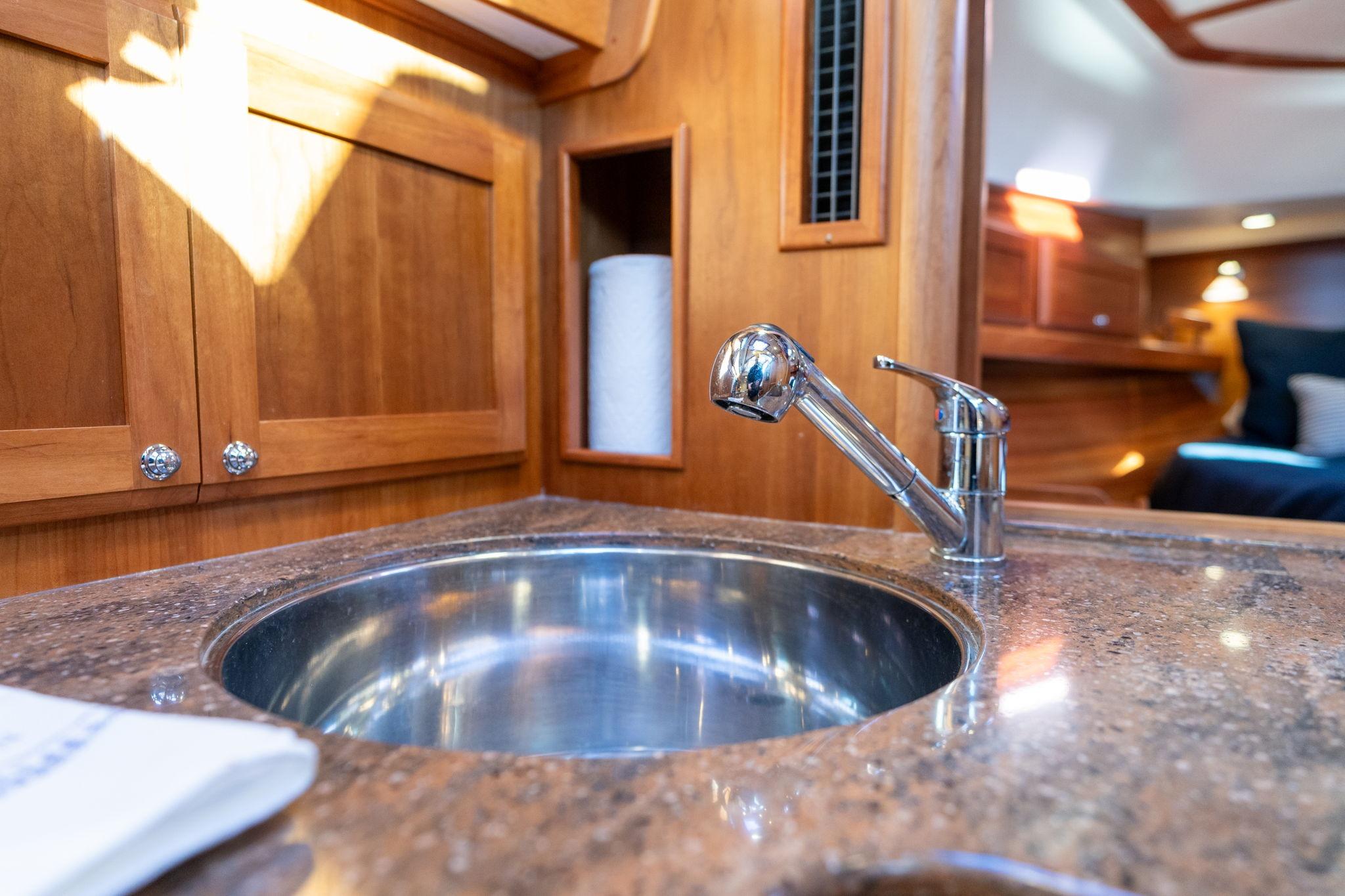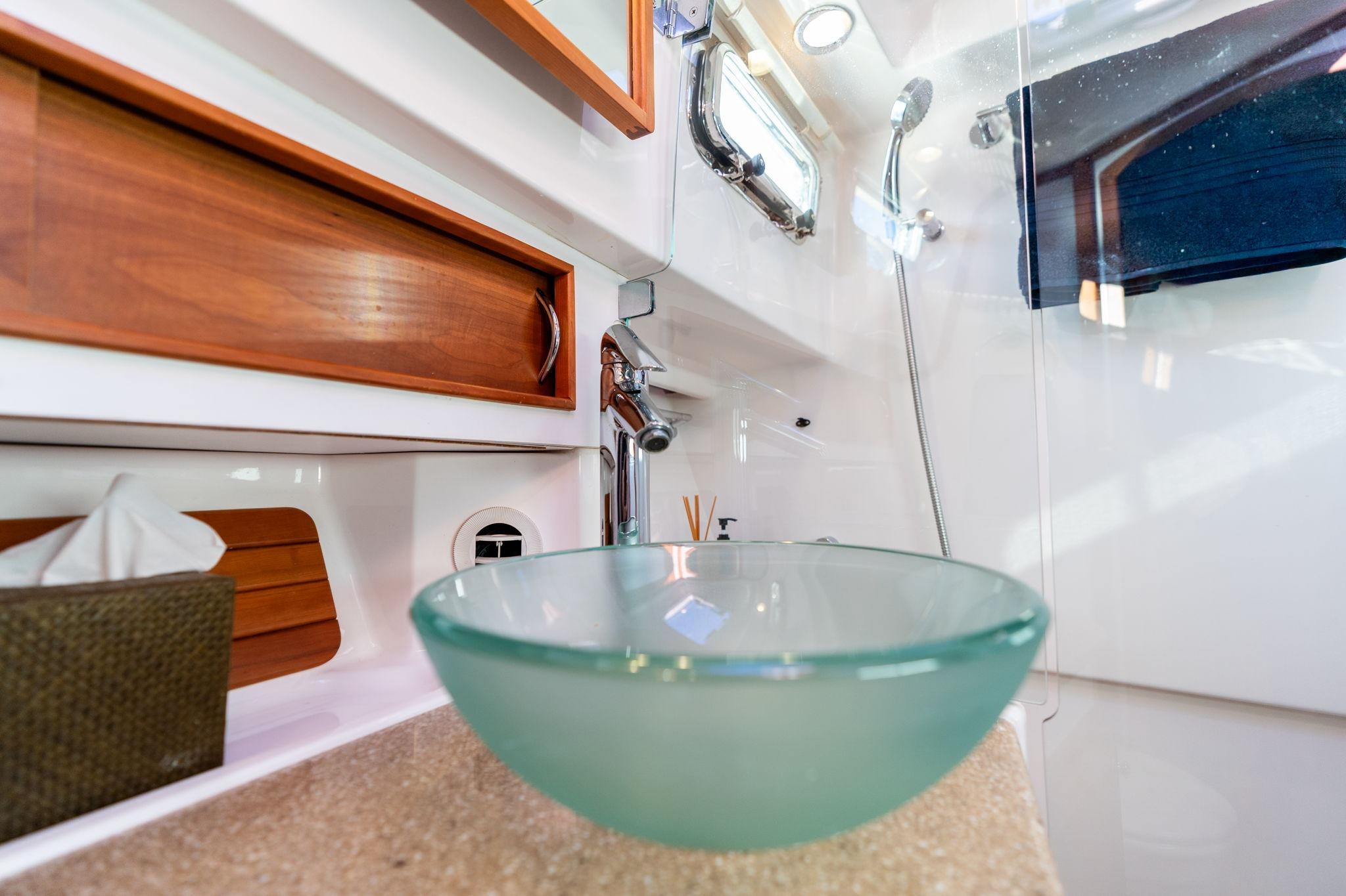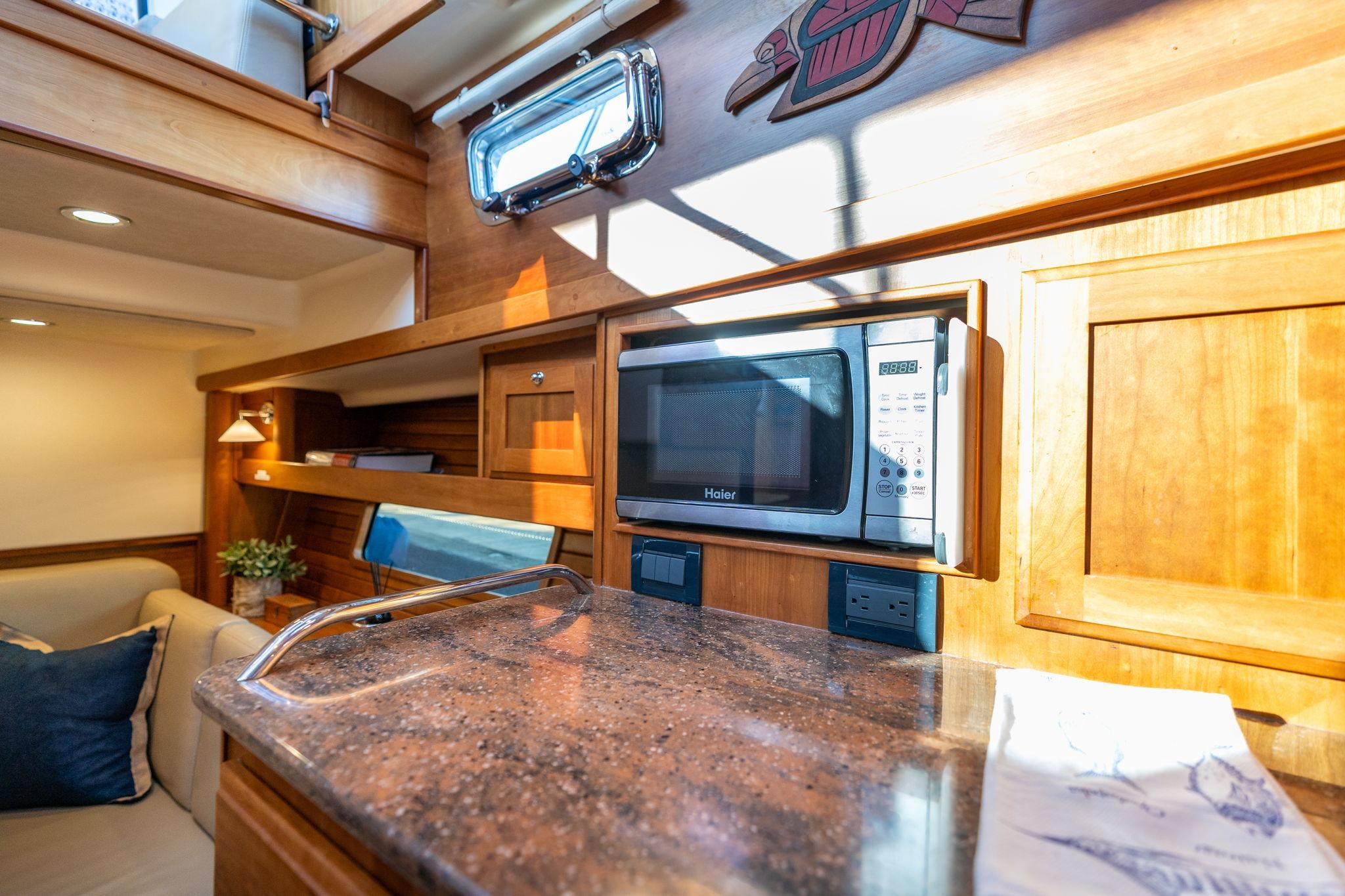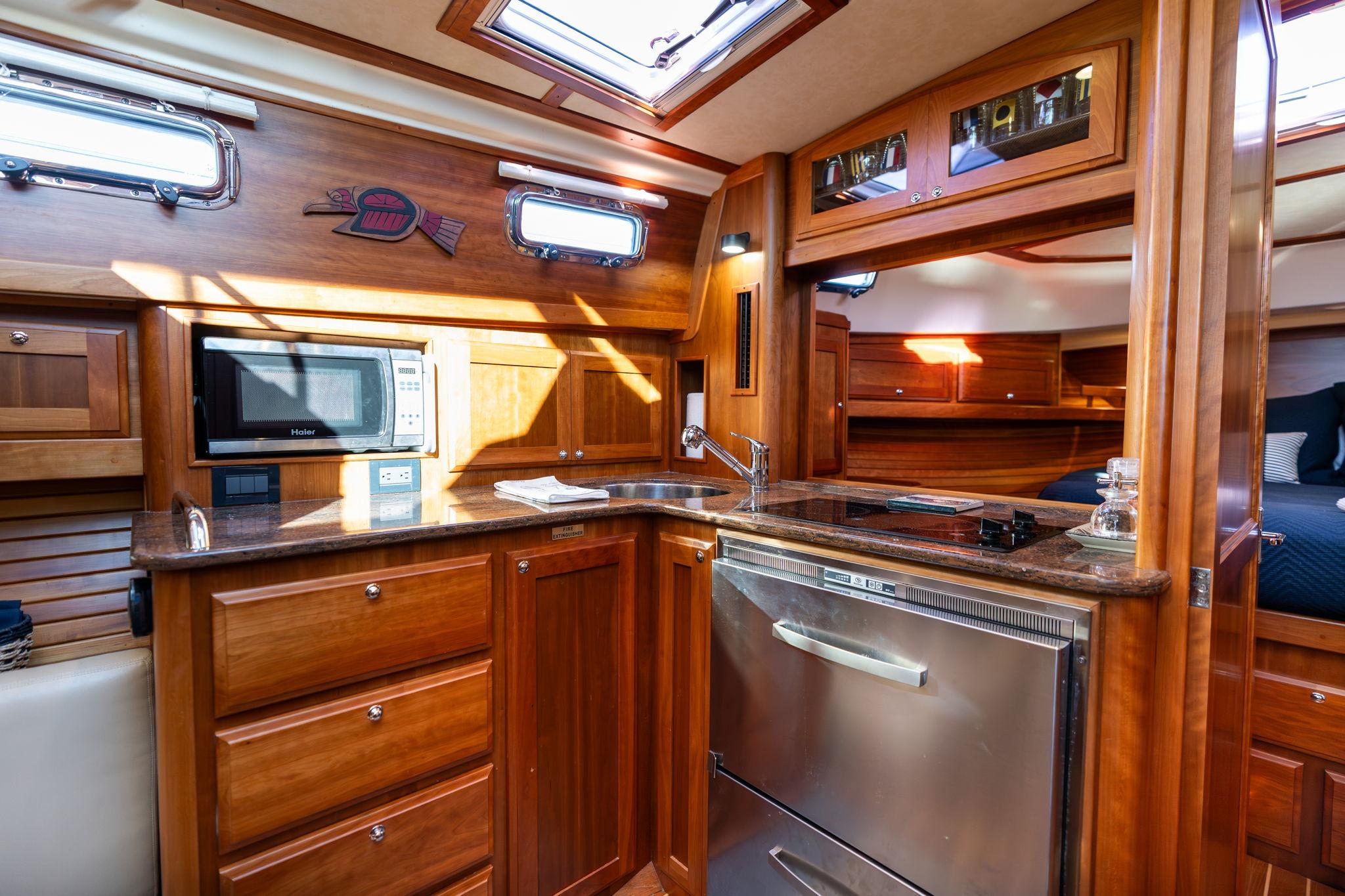 The galley is open to the main salon and designed for practical, extended use aboard. Solid-surface countertops provide ample prep space, complemented by a stainless steel sink and faucet. Cooking appliances include a ceramic two-burner cooktop and a microwave oven. Refrigeration is handled by a two-drawer stainless steel fridge/freezer operating on AC/DC power. Storage is abundant, with lockers throughout the galley and additional storage below the helm deck. An opening stainless steel portlight over the galley provides ventilation and natural light, enhancing comfort while cooking.