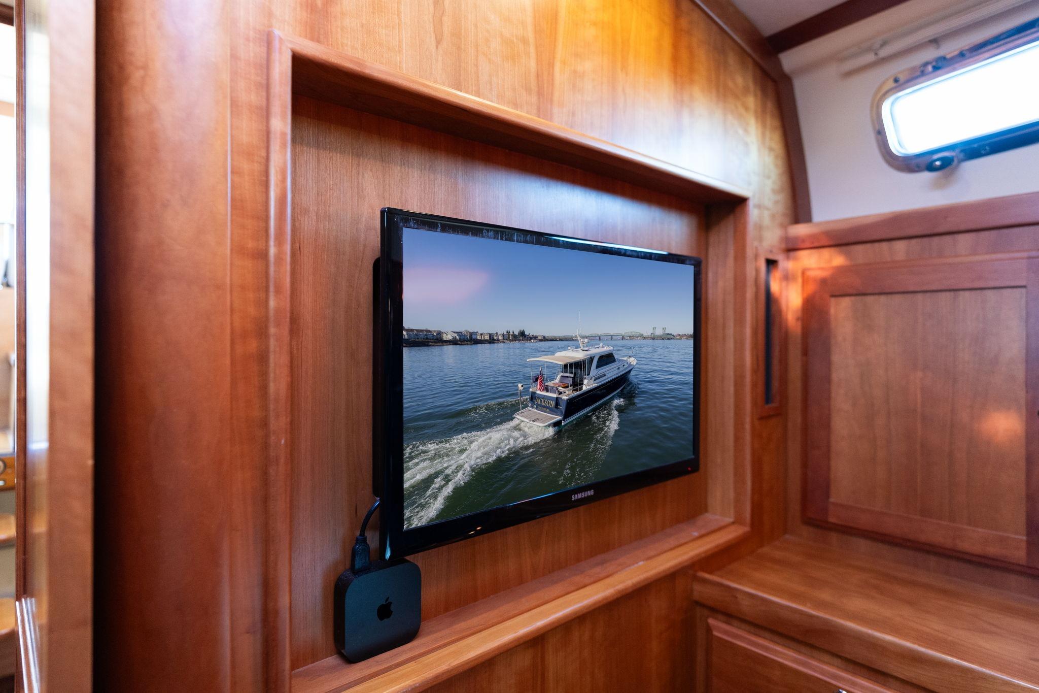 Seating to port includes a mate’s L-settee that converts to face the salon table, along with a raised U-shaped settee measuring approximately 94” x 50”, offering generous seating and integrated storage below. To starboard is a dedicated storage cabinet with an LED television mounted on a mechanical lift, maintaining clean sightlines when not in use. An icemaker installed in 2021 enhances onboard entertaining.