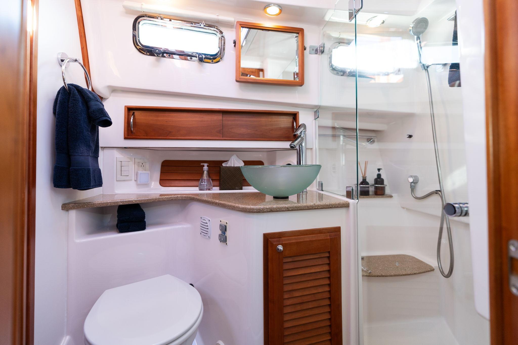 The layout offers a natural flow between the cockpit and salon, creating a functional and inviting space for entertaining or relaxing underway. Large salon windows provide excellent visibility and natural light, while tinted glass and exterior window screens enhance privacy and reduce solar gain. The upper salon settee converts into an additional sleeping area, increasing onboard flexibility for guests. Interior finishes reflect Sabre’s reputation for quality craftsmanship, with thoughtful storage solutions and durable materials throughout.