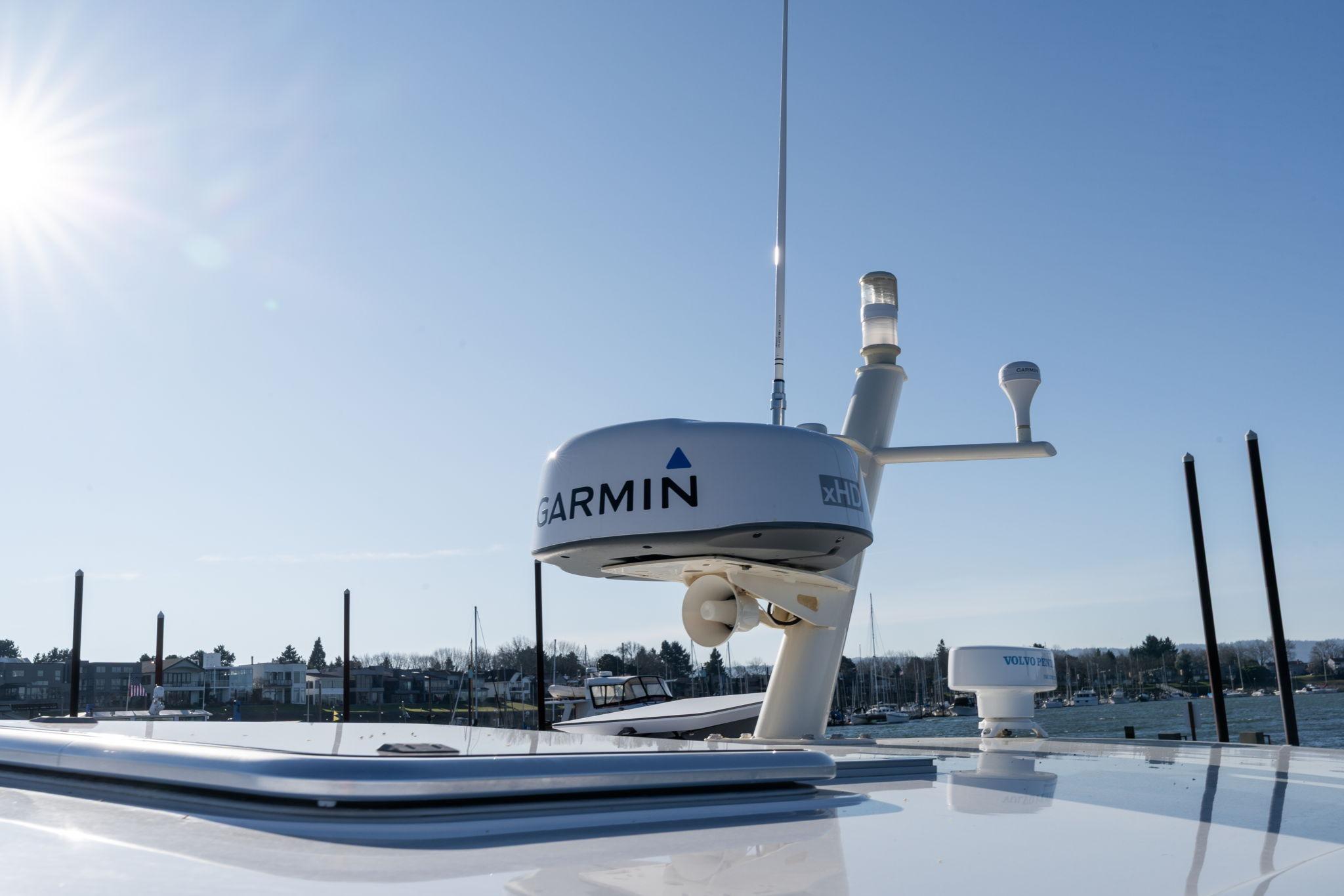 Navigation and electronics are modern and comprehensive, including a Garmin GPSMap 8617 chartplotter, Garmin GMR 24xHD radar (new September 2023), Raymarine p70r autopilot, AIS with send and receive, depth sounder, and Volvo Penta joystick control with dynamic positioning system.